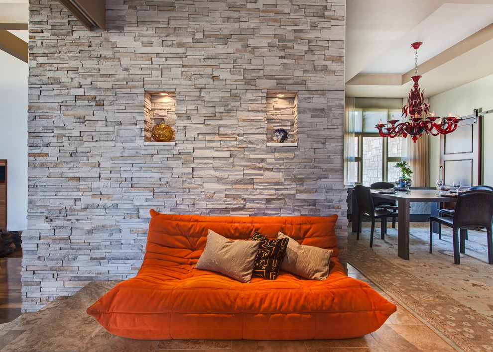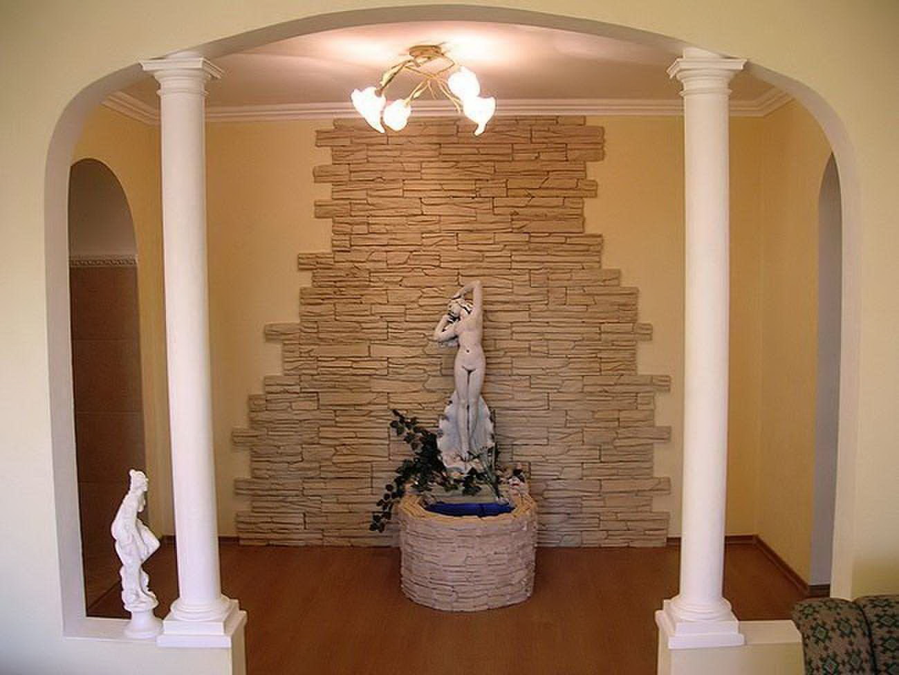 - nicho texturizado. A decisão excelente para quartos, cria a sensação de que a pessoa adormece tanto quanto possível condições naturais. Eu amo nichos de pedra em salas de estar, salas de jantar e salões;