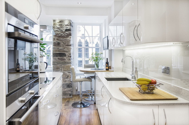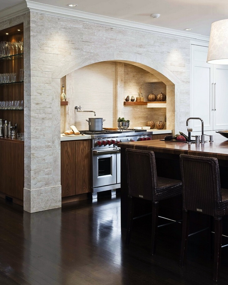 - Avental de cozinha pode ser revetido com pedra, criando um espaço sólido e um interior muito elegante. Neste caso, é necessário envernizá-lo para facilitar a limpeza diária e enfatizar a estrutura do material escolhido.