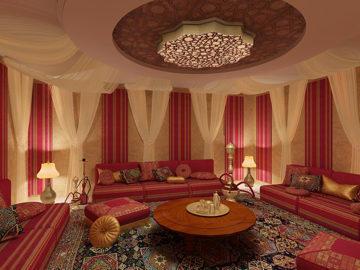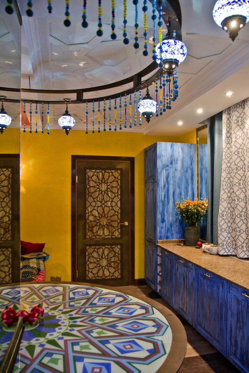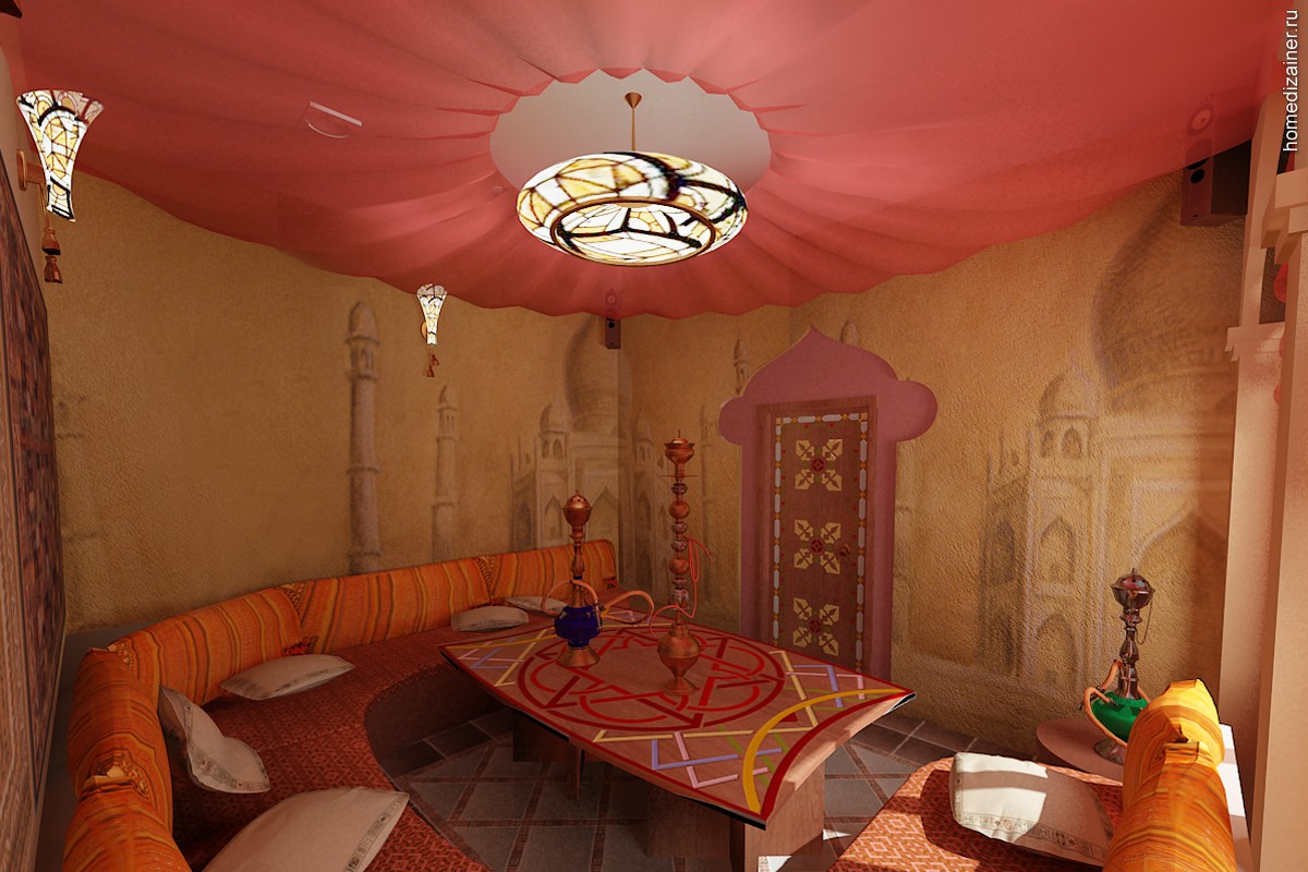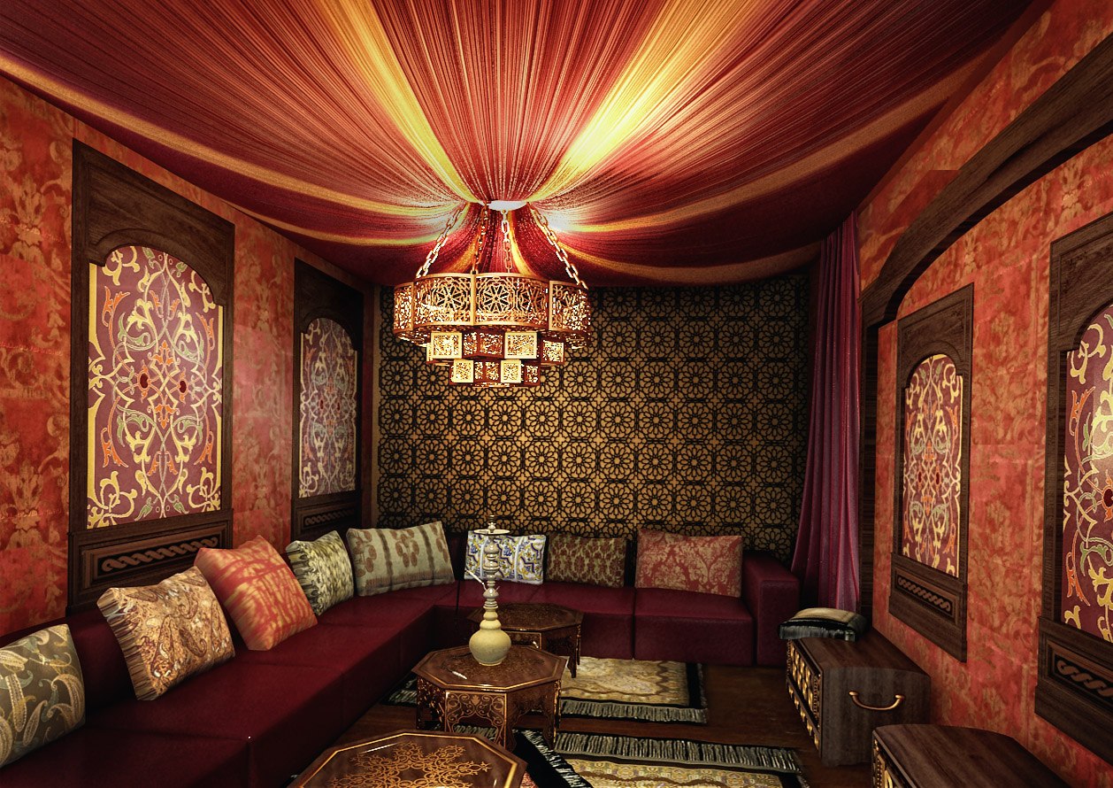 O destaque do interior árabe é a decoração do teto. Na maioria das vezes torna-se escuro (gesso ou tecido), e em seu fundo é criado um "céu de estrela da noite". Na interpretação moderna, ele pode ser coberto com um enfeite, usando um papel de parede com um padrão oriental, ou fazer um painel elástico.