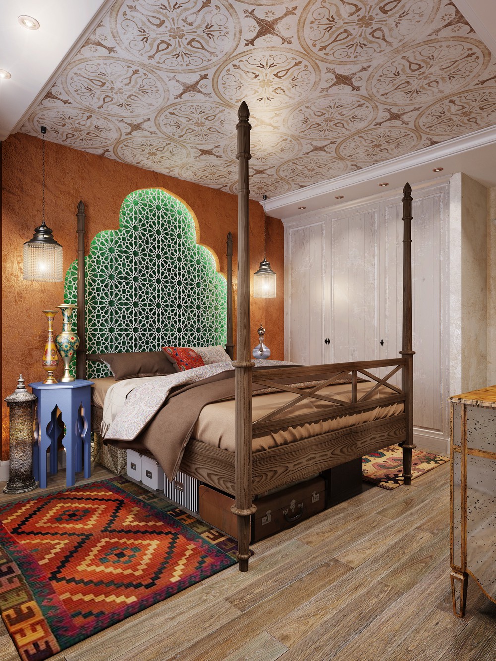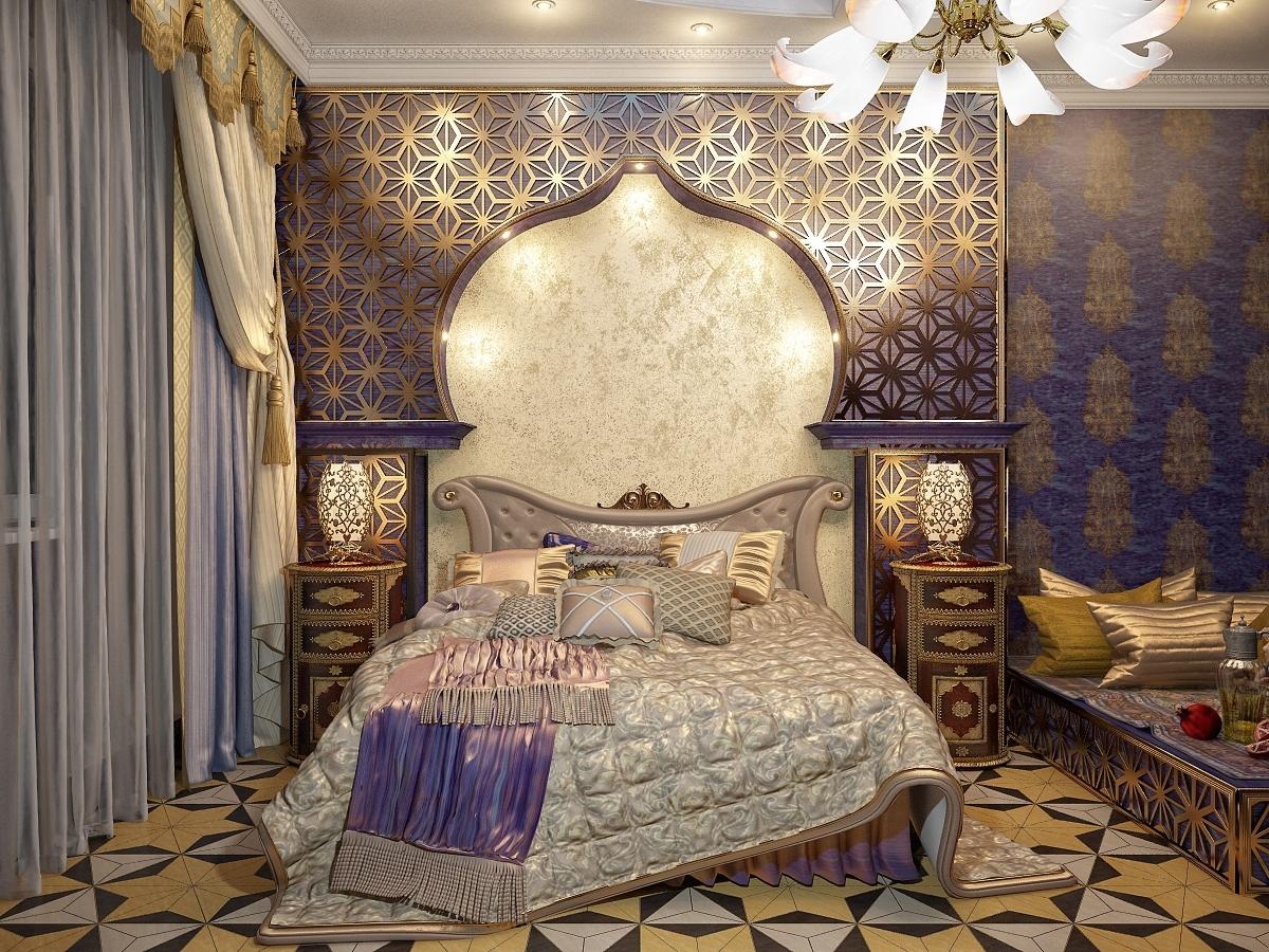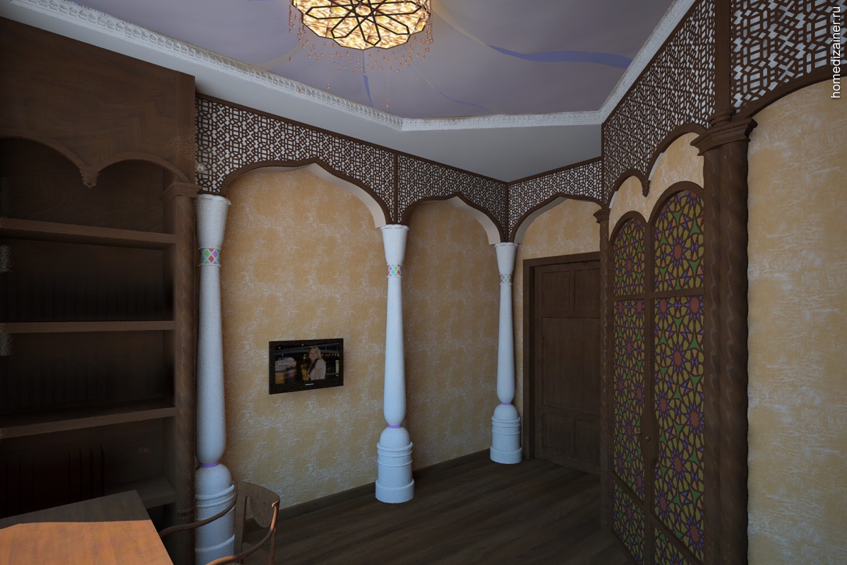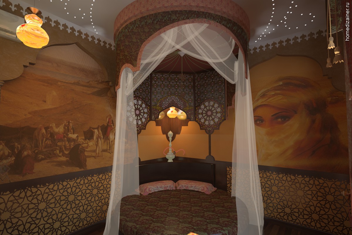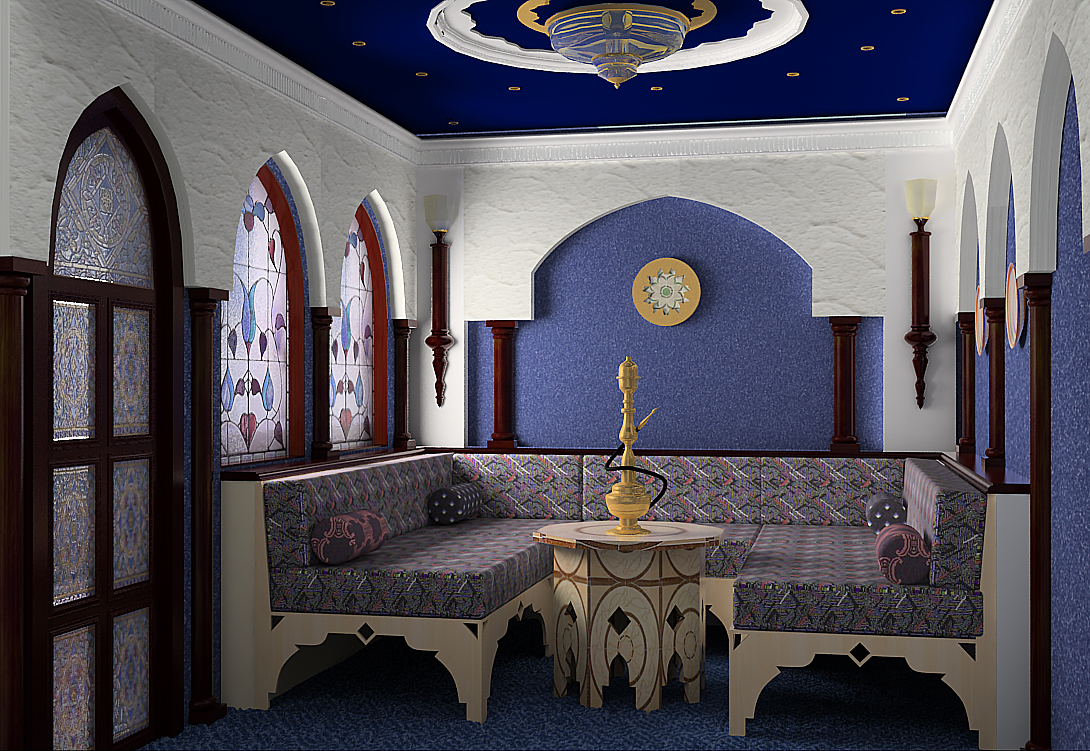 O destaque do interior árabe é a decoração do teto. Na maioria das vezes torna-se escuro (gesso ou tecido), e em seu fundo é criado um "céu de estrela da noite". Na interpretação moderna, ele pode ser coberto com um enfeite, usando um papel de parede com um padrão oriental, ou fazer um painel elástico.