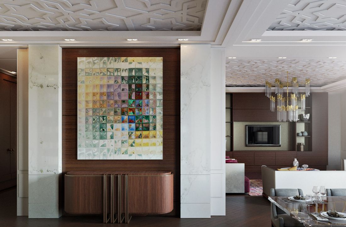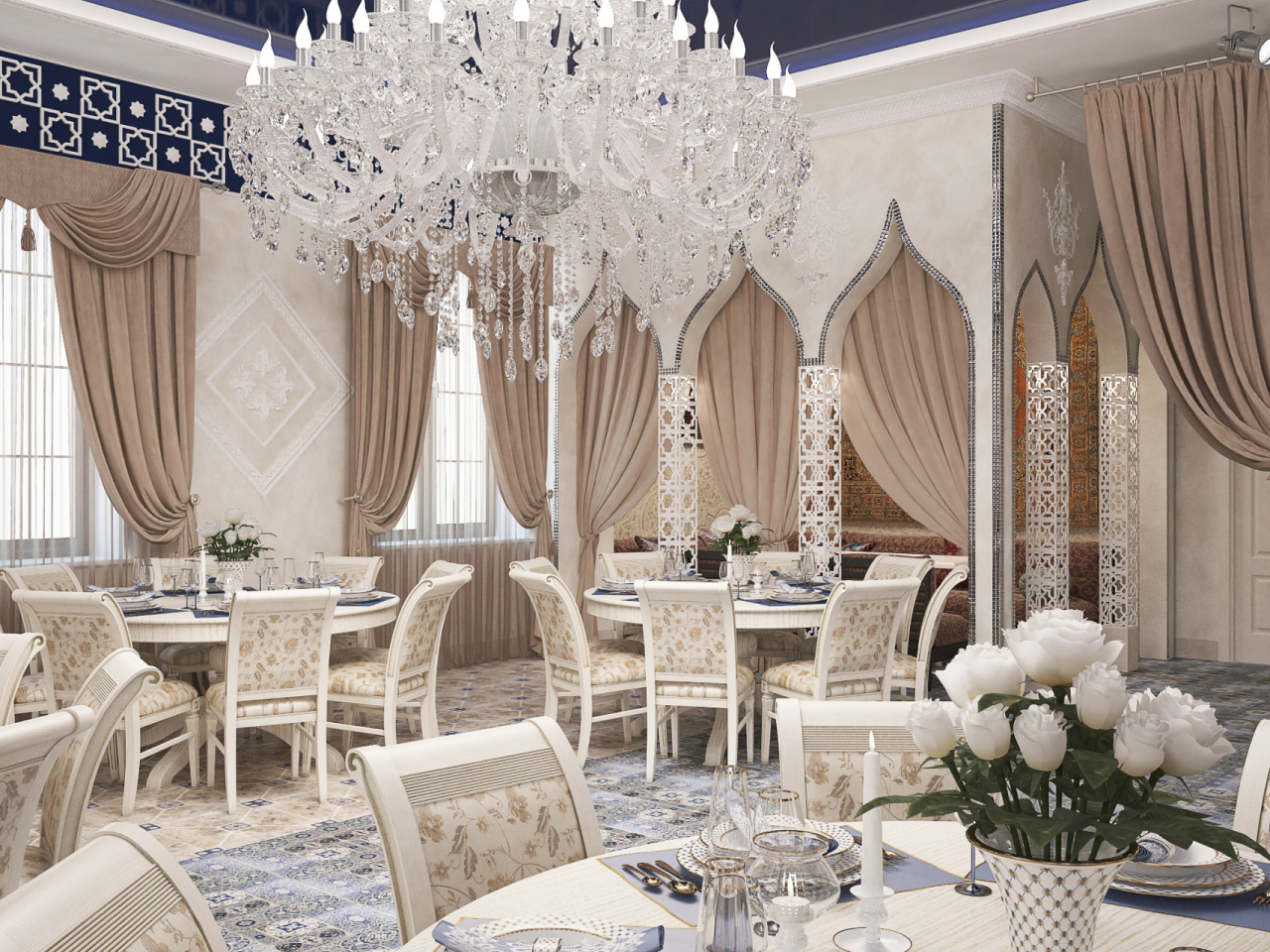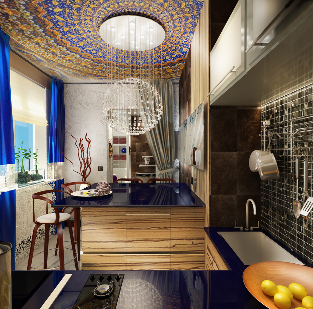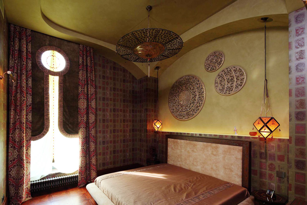 O destaque do interior árabe é a decoração do teto. Na maioria das vezes torna-se escuro (gesso ou tecido), e em seu fundo é criado um "céu de estrela da noite". Na interpretação moderna, ele pode ser coberto com um enfeite, usando um papel de parede com um padrão oriental, ou fazer um painel elástico.