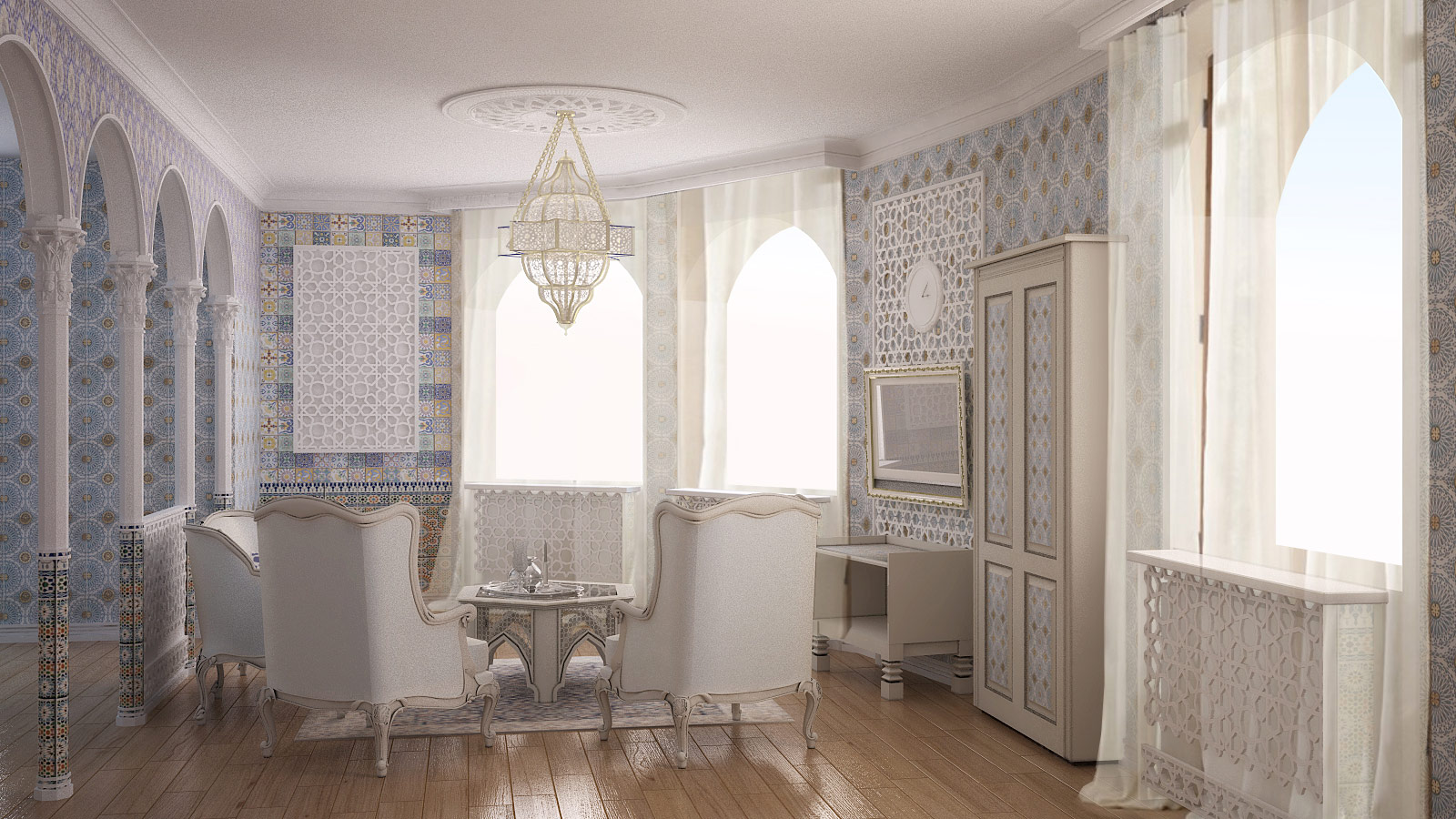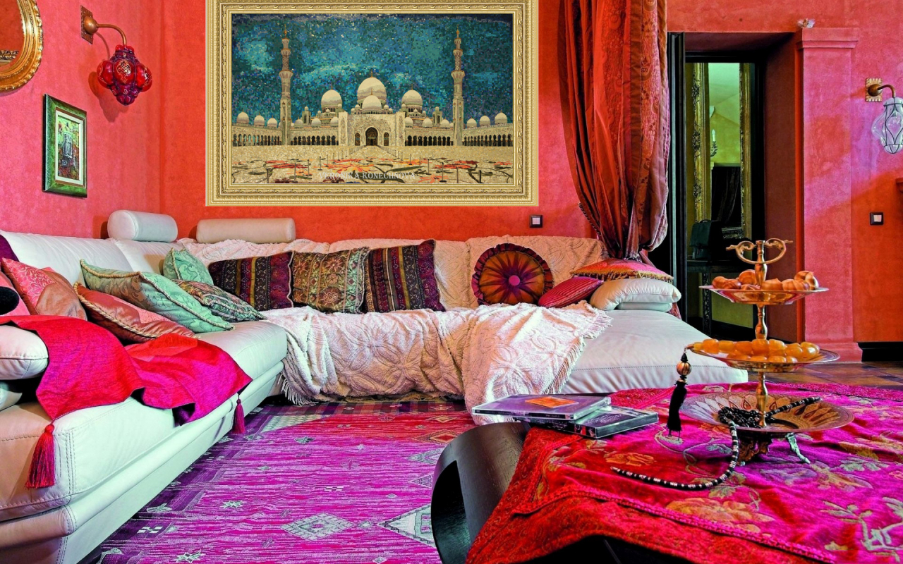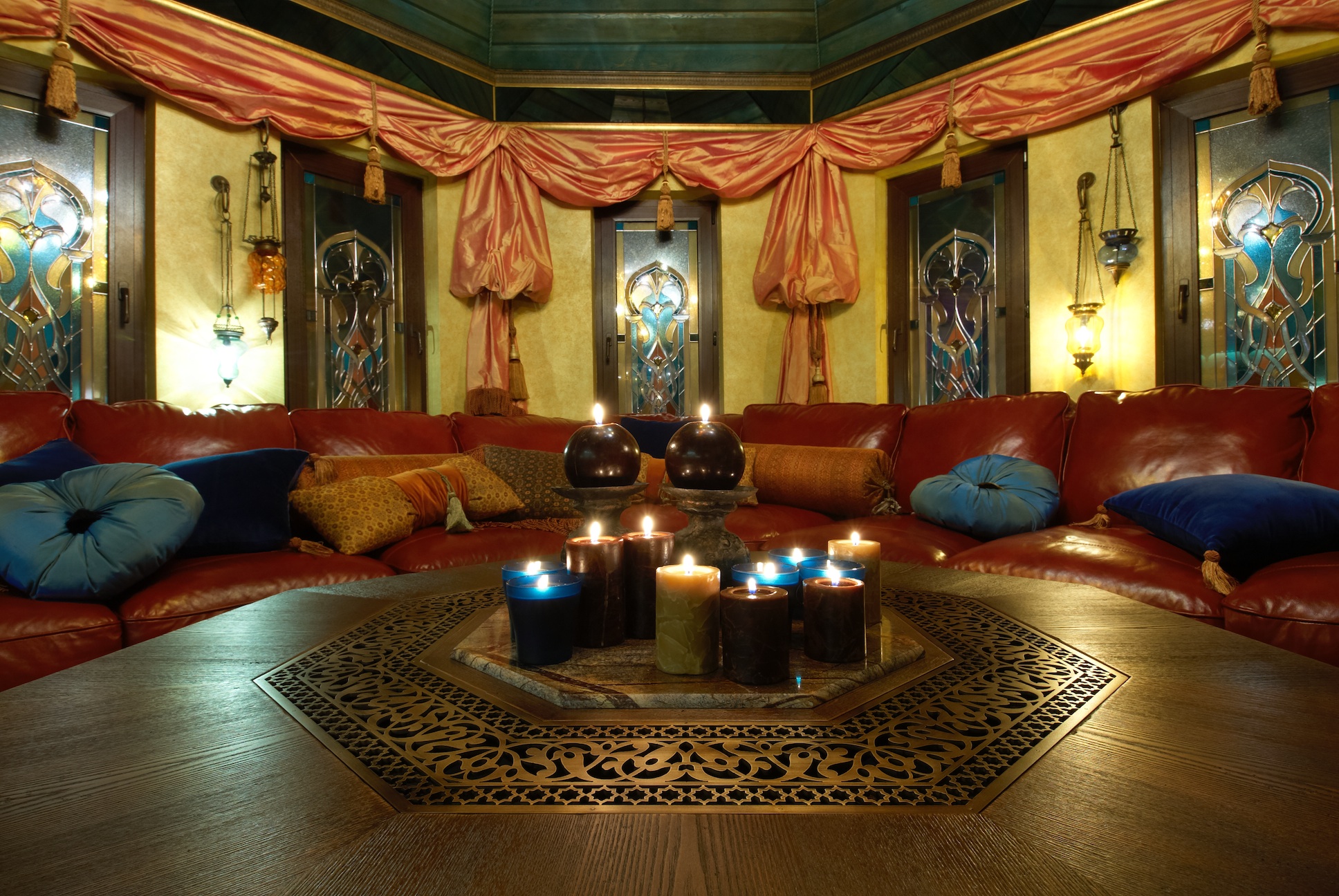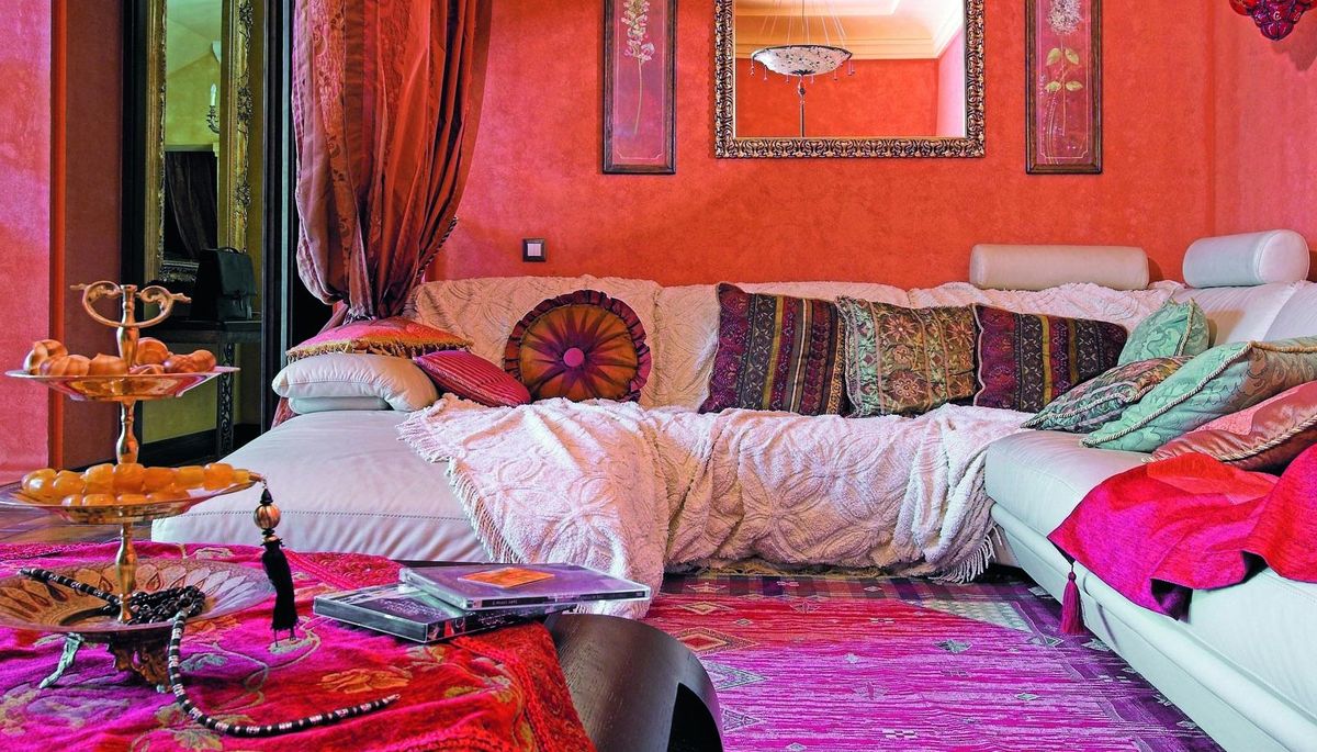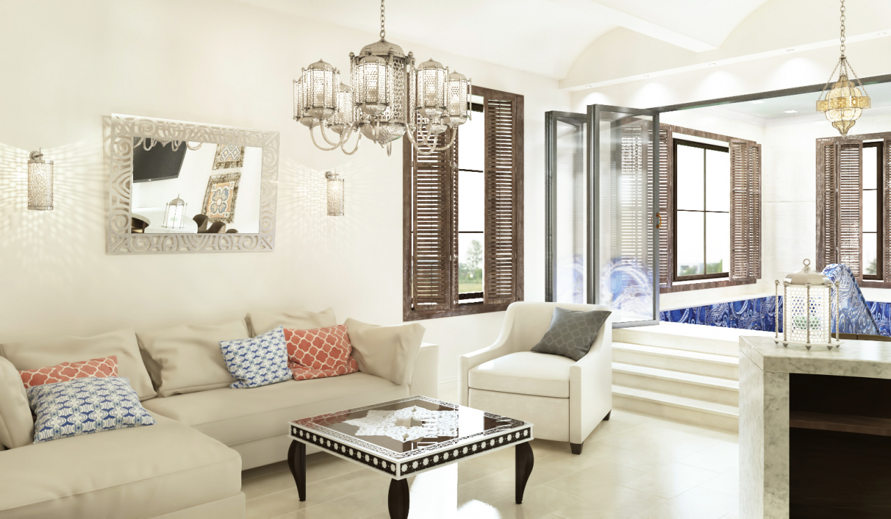 O design da sala de estar em estilo oriental ajuda a dar ao ambiente uma sensação acolhedora e, ao mesmo tempo, pompa e luxo, semelhante ao salão principal do xeque persa. A sala, feita com cores marroquinas, combina as cores turquesa, terracota, usando tons de areia, a atmosfera do sol e a costa próxima do mar.