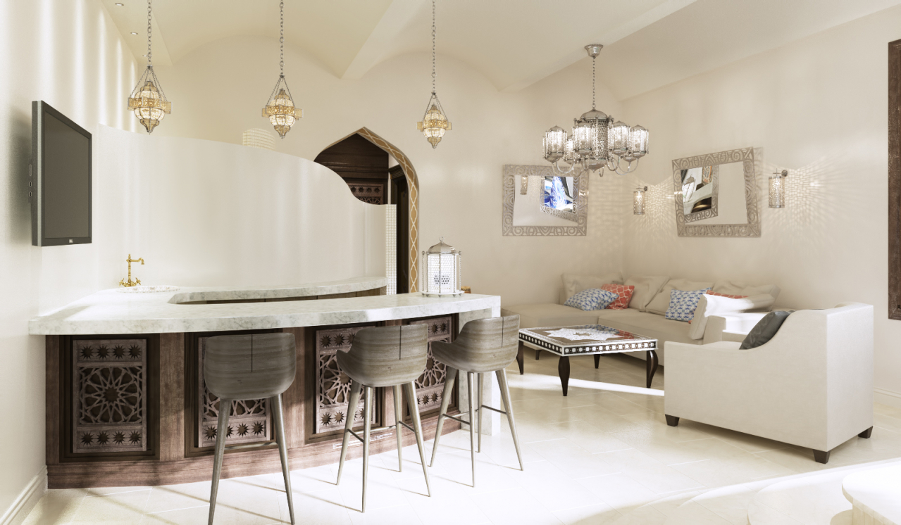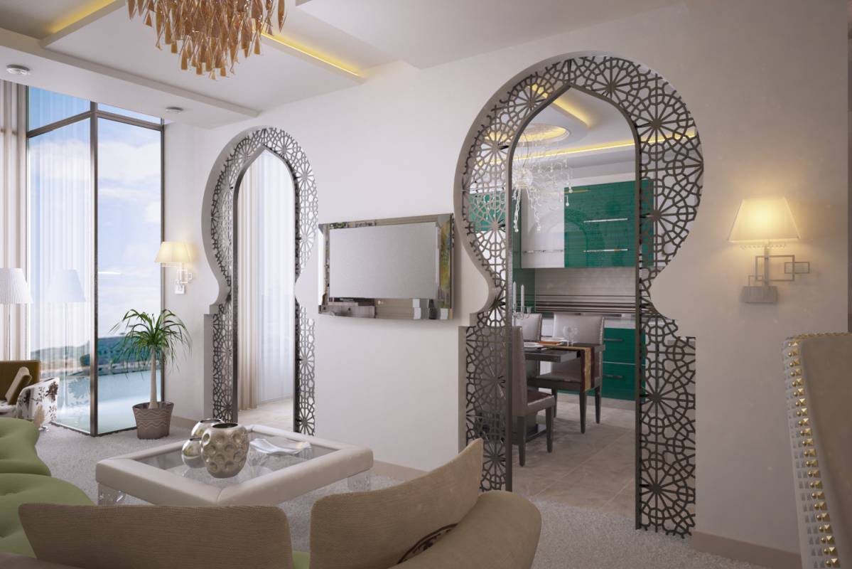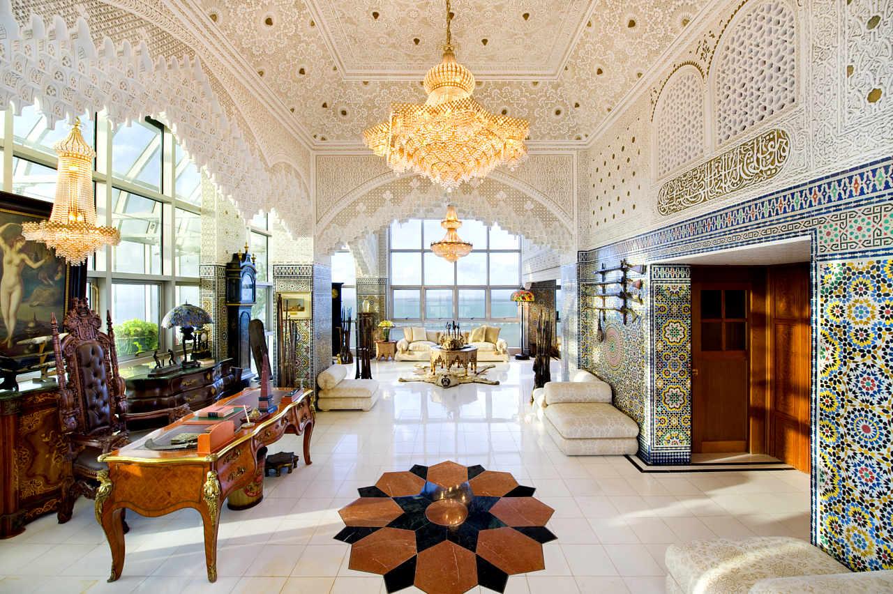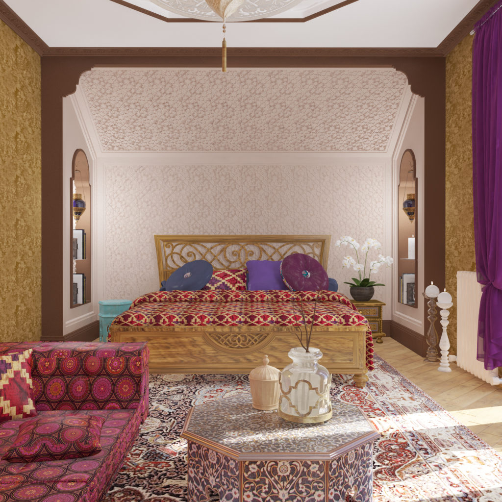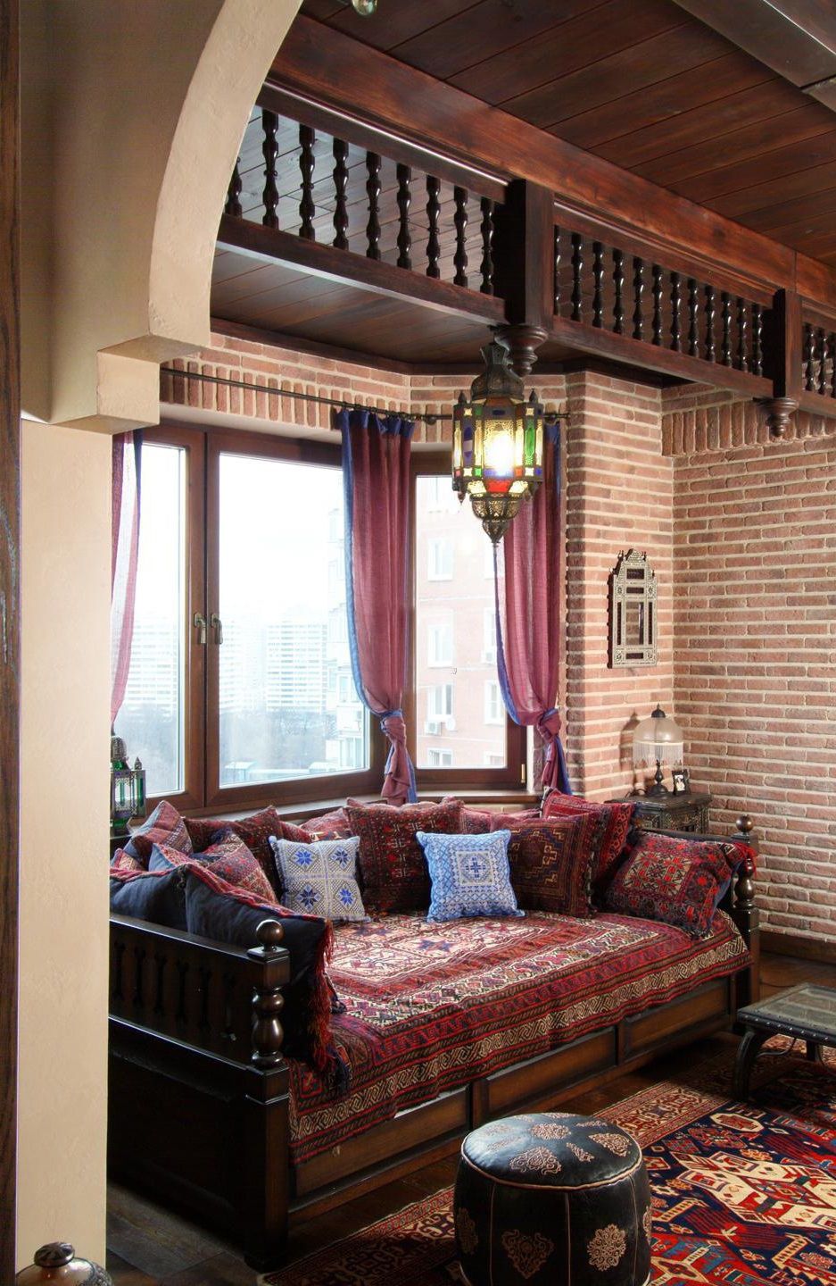 O design da sala de estar em estilo oriental ajuda a dar ao ambiente uma sensação acolhedora e, ao mesmo tempo, pompa e luxo, semelhante ao salão principal do xeque persa. A sala, feita com cores marroquinas, combina as cores turquesa, terracota, usando tons de areia, a atmosfera do sol e a costa próxima do mar.
