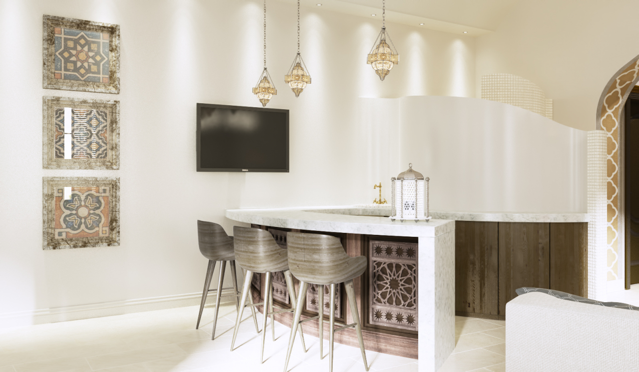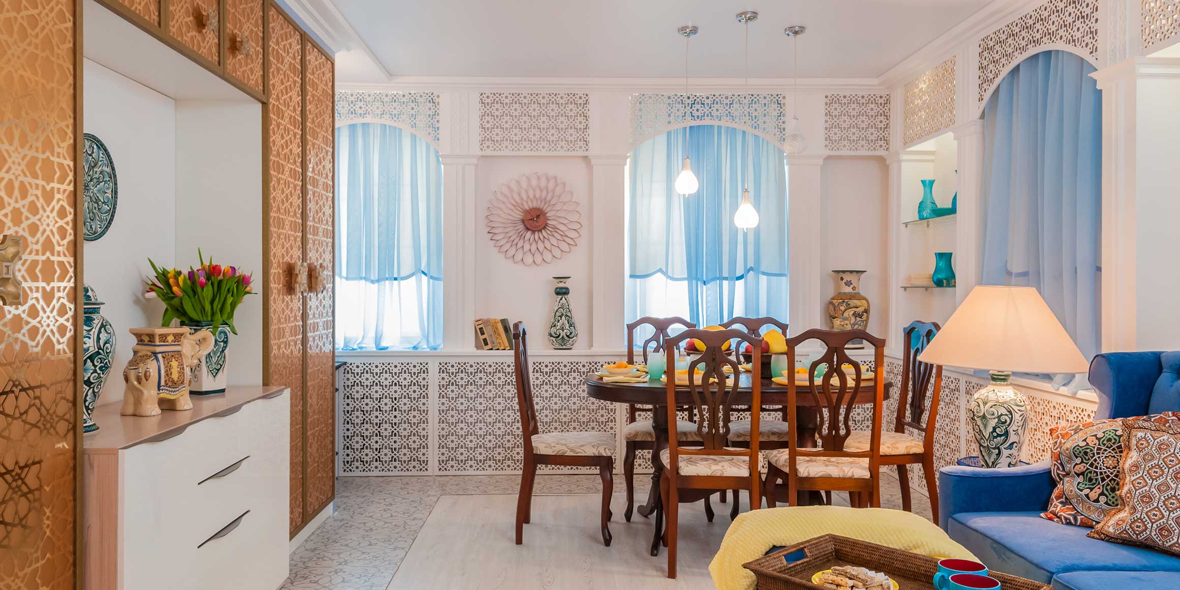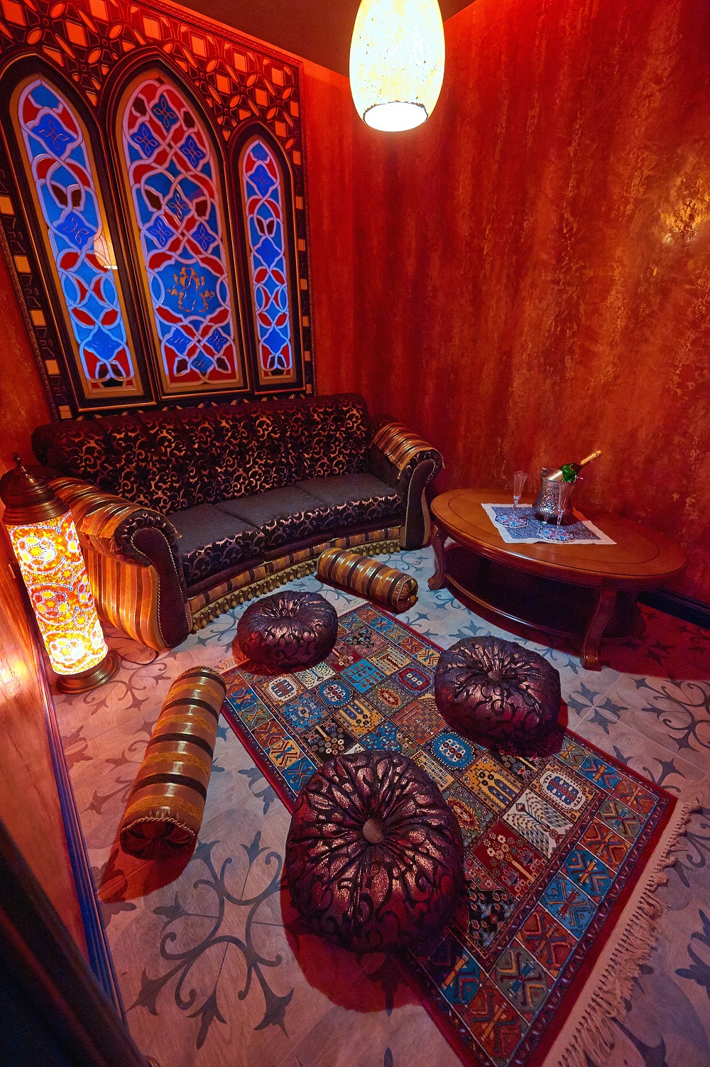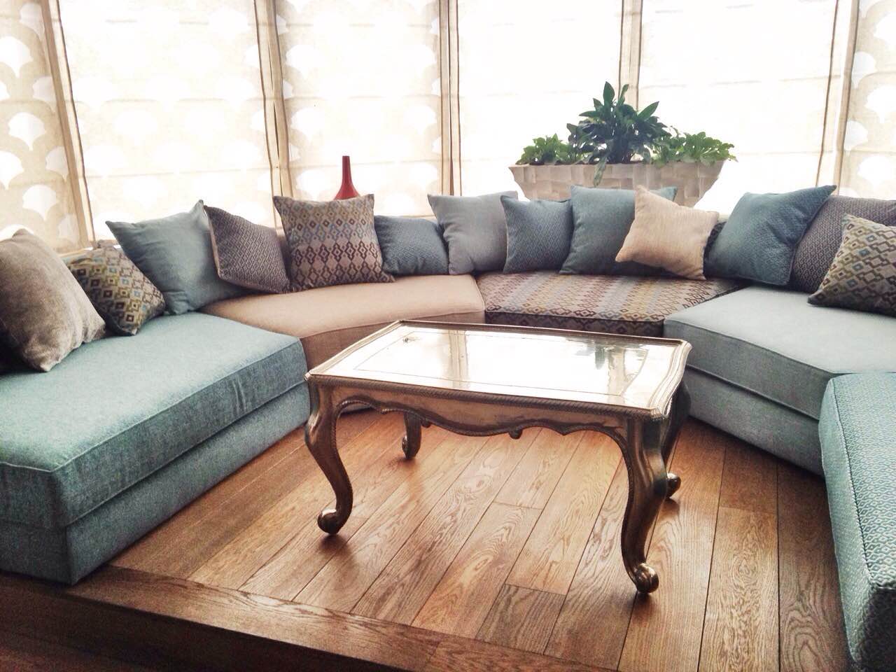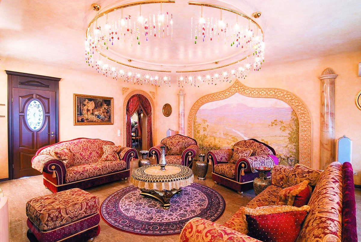 O design da sala de estar em estilo oriental ajuda a dar ao ambiente uma sensação acolhedora e, ao mesmo tempo, pompa e luxo, semelhante ao salão principal do xeque persa. A sala, feita com cores marroquinas, combina as cores turquesa, terracota, usando tons de areia, a atmosfera do sol e a costa próxima do mar.