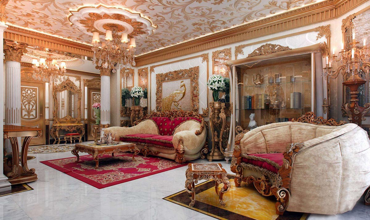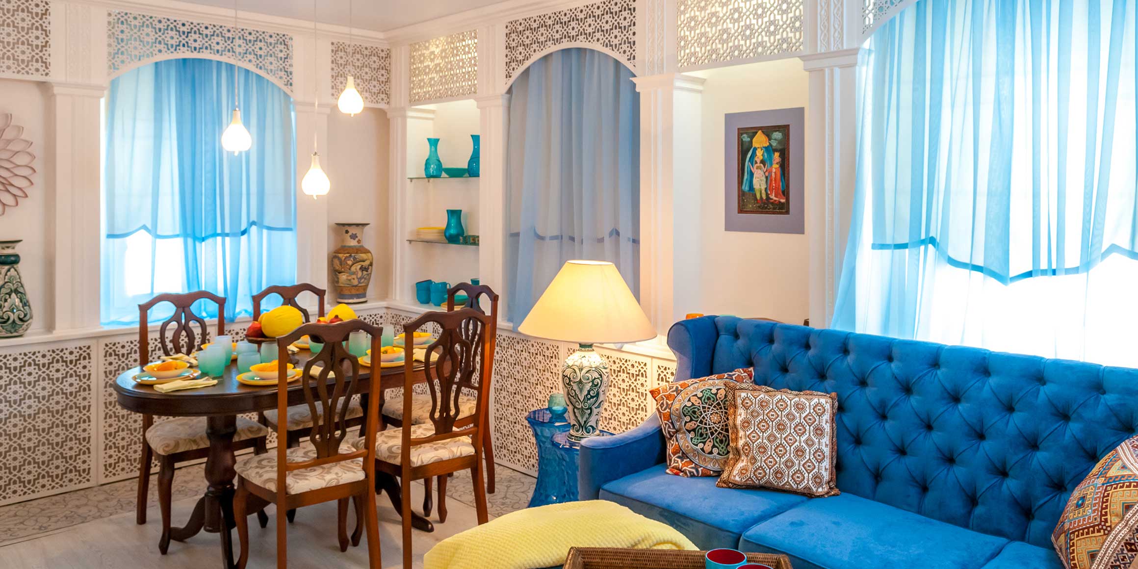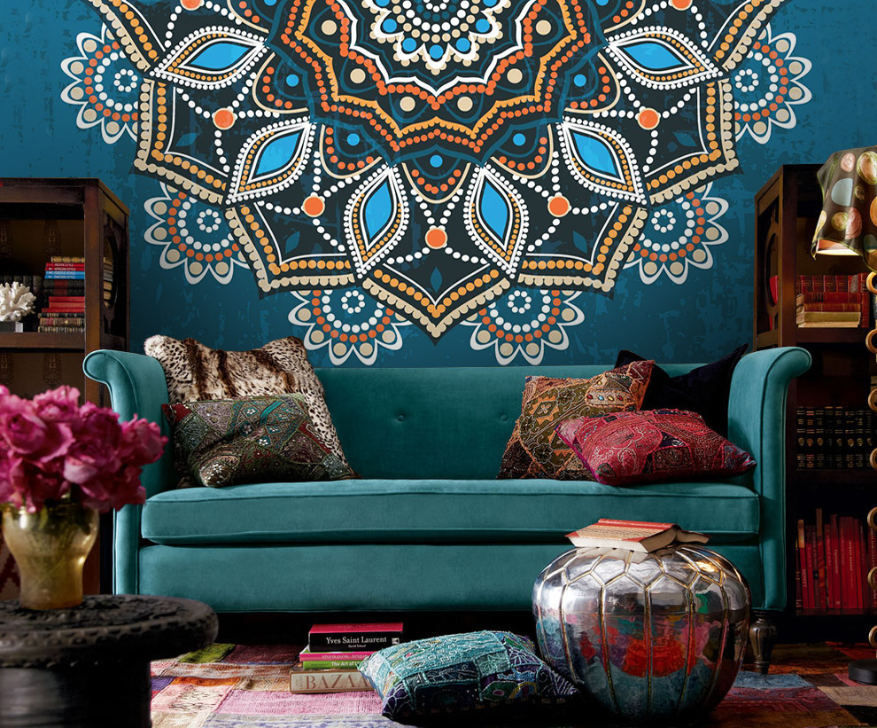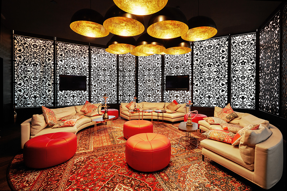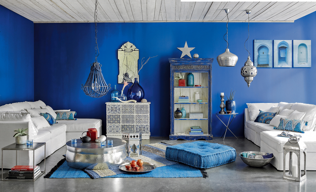 O design da sala de estar em estilo oriental ajuda a dar ao ambiente uma sensação acolhedora e, ao mesmo tempo, pompa e luxo, semelhante ao salão principal do xeque persa. A sala, feita com cores marroquinas, combina as cores turquesa, terracota, usando tons de areia, a atmosfera do sol e a costa próxima do mar.