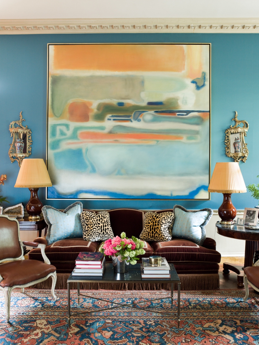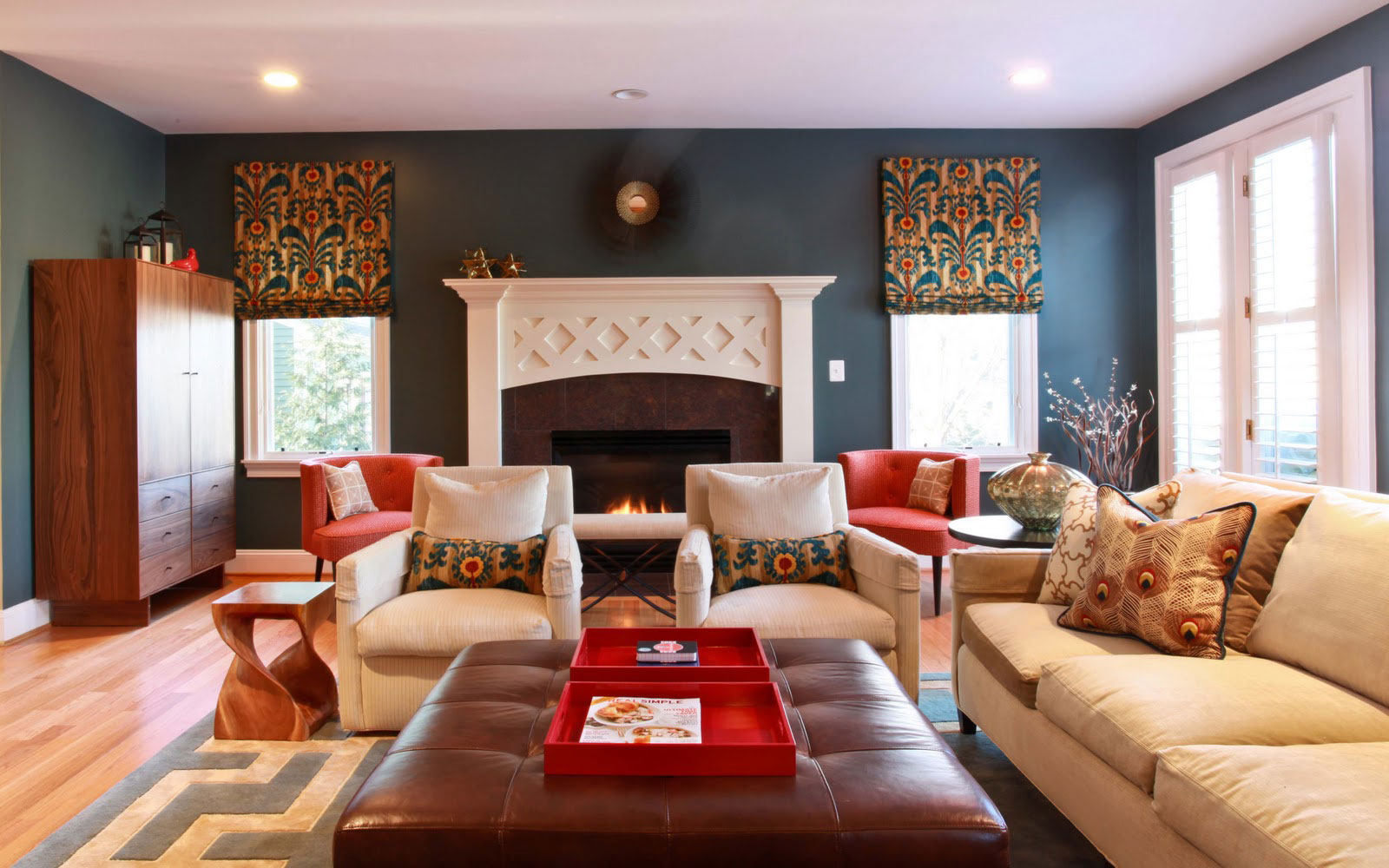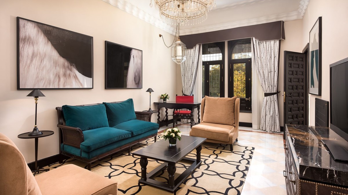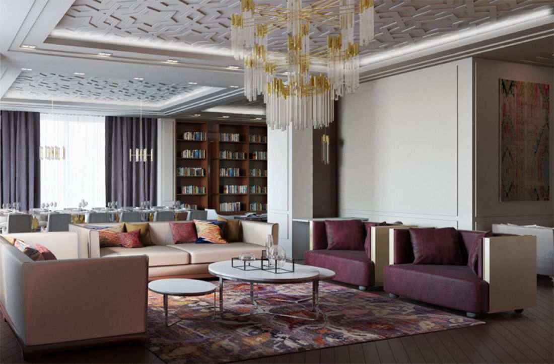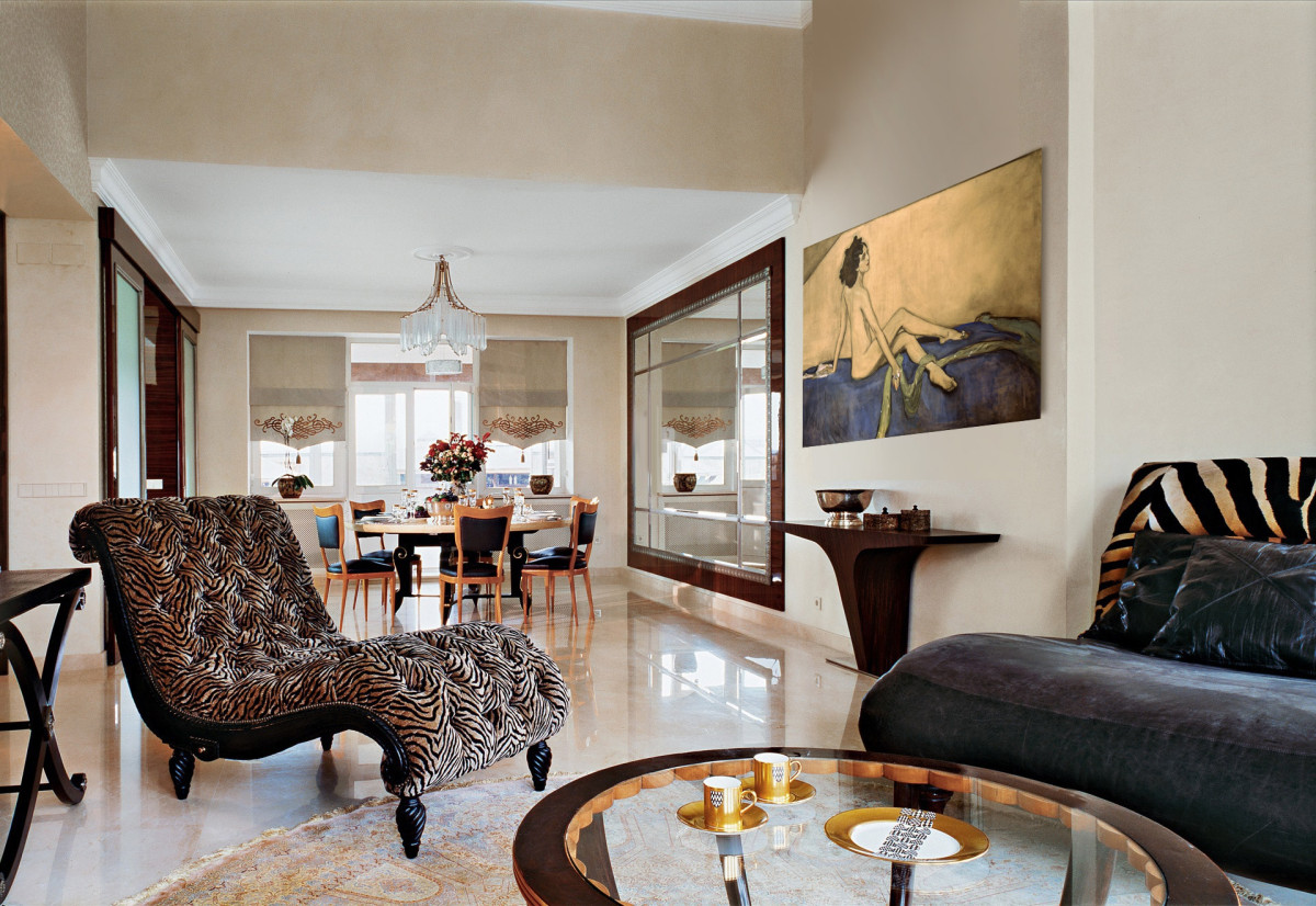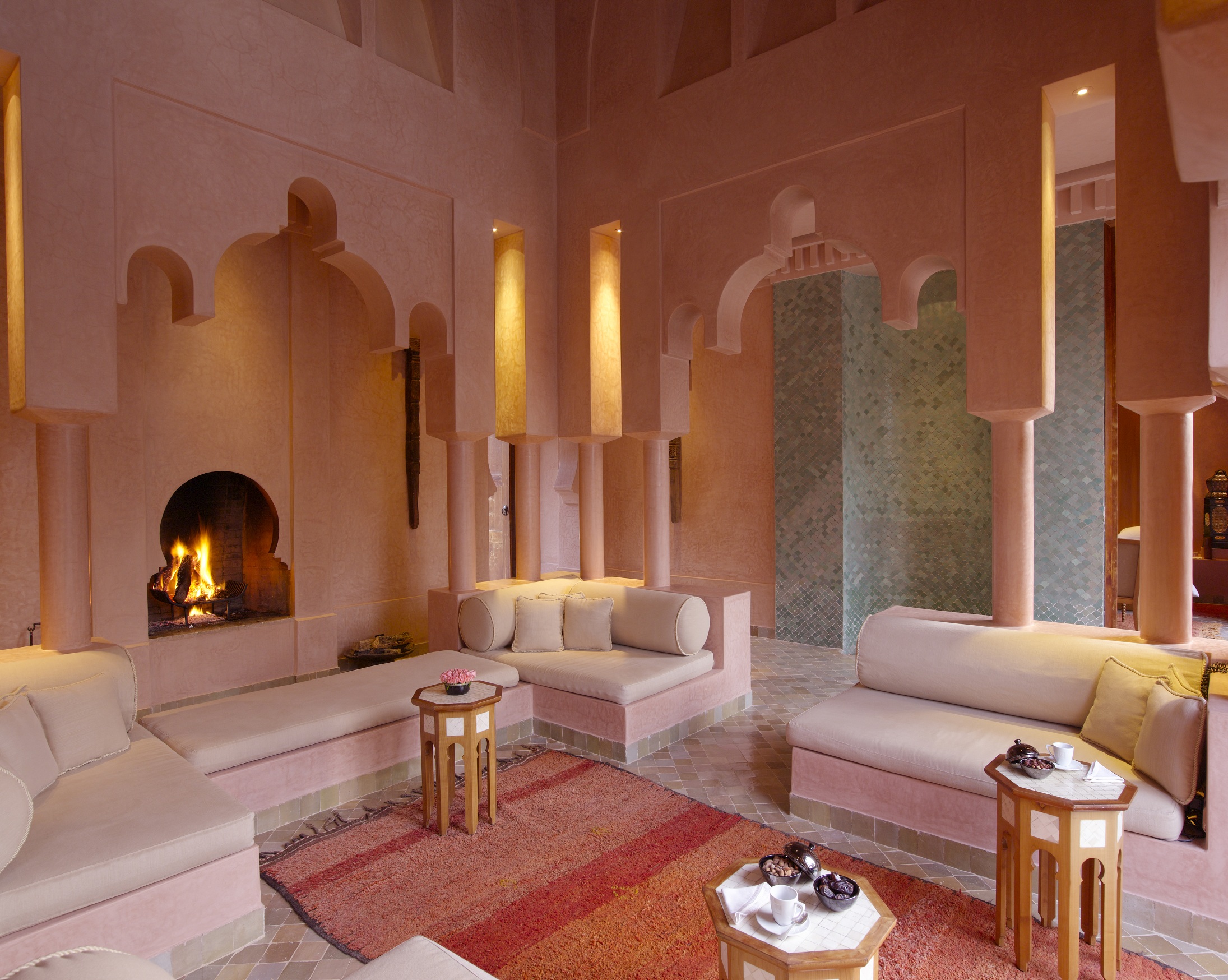 O design da sala de estar em estilo oriental ajuda a dar ao ambiente uma sensação acolhedora e, ao mesmo tempo, pompa e luxo, semelhante ao salão principal do xeque persa. A sala, feita com cores marroquinas, combina as cores turquesa, terracota, usando tons de areia, a atmosfera do sol e a costa próxima do mar.