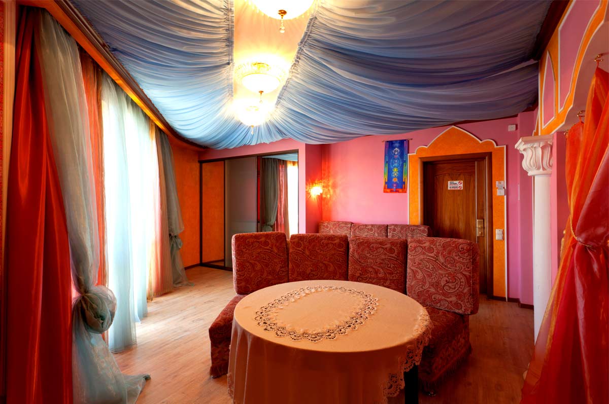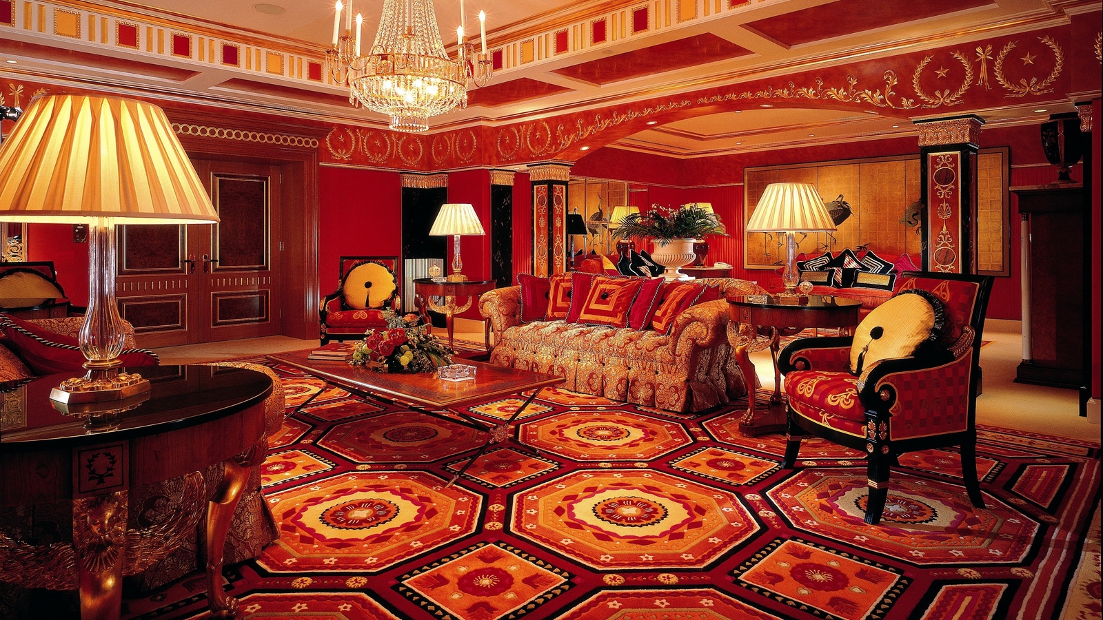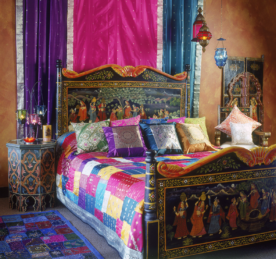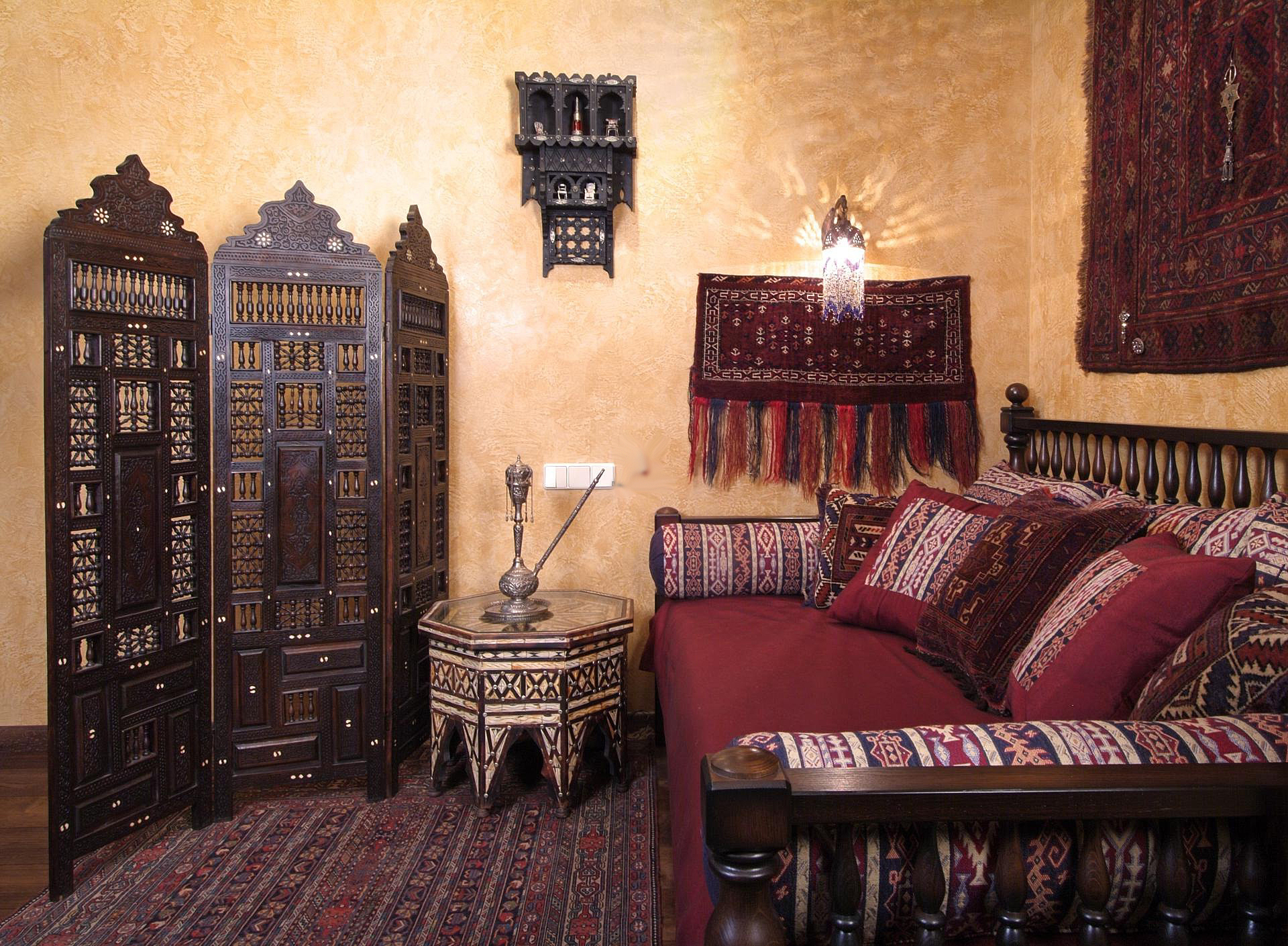 No chão e nas paredes há um grande número de tapetes multicoloridos de seda ou de lã, que ajudarão a criar o luxo do quarto de um xeque oriental.