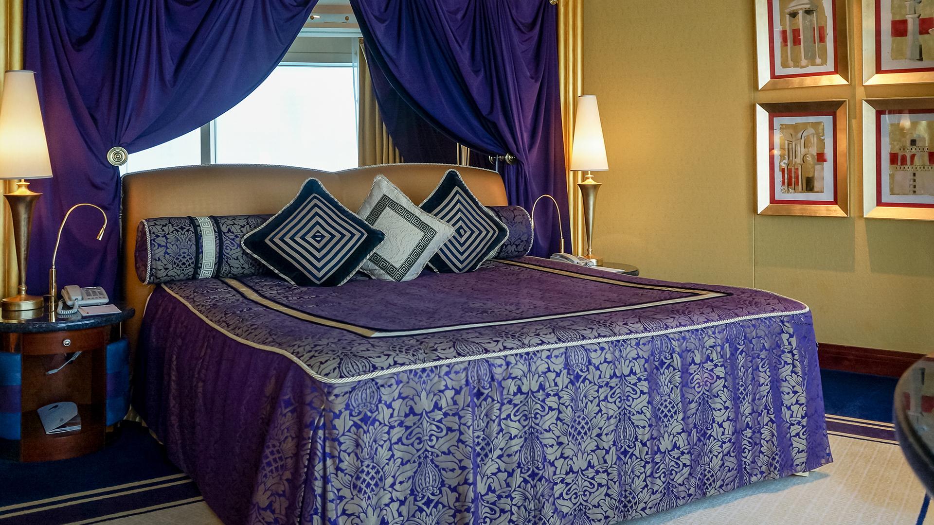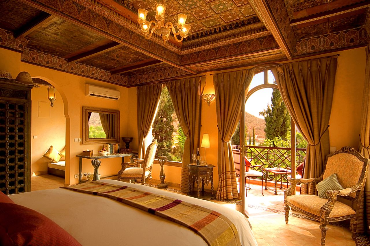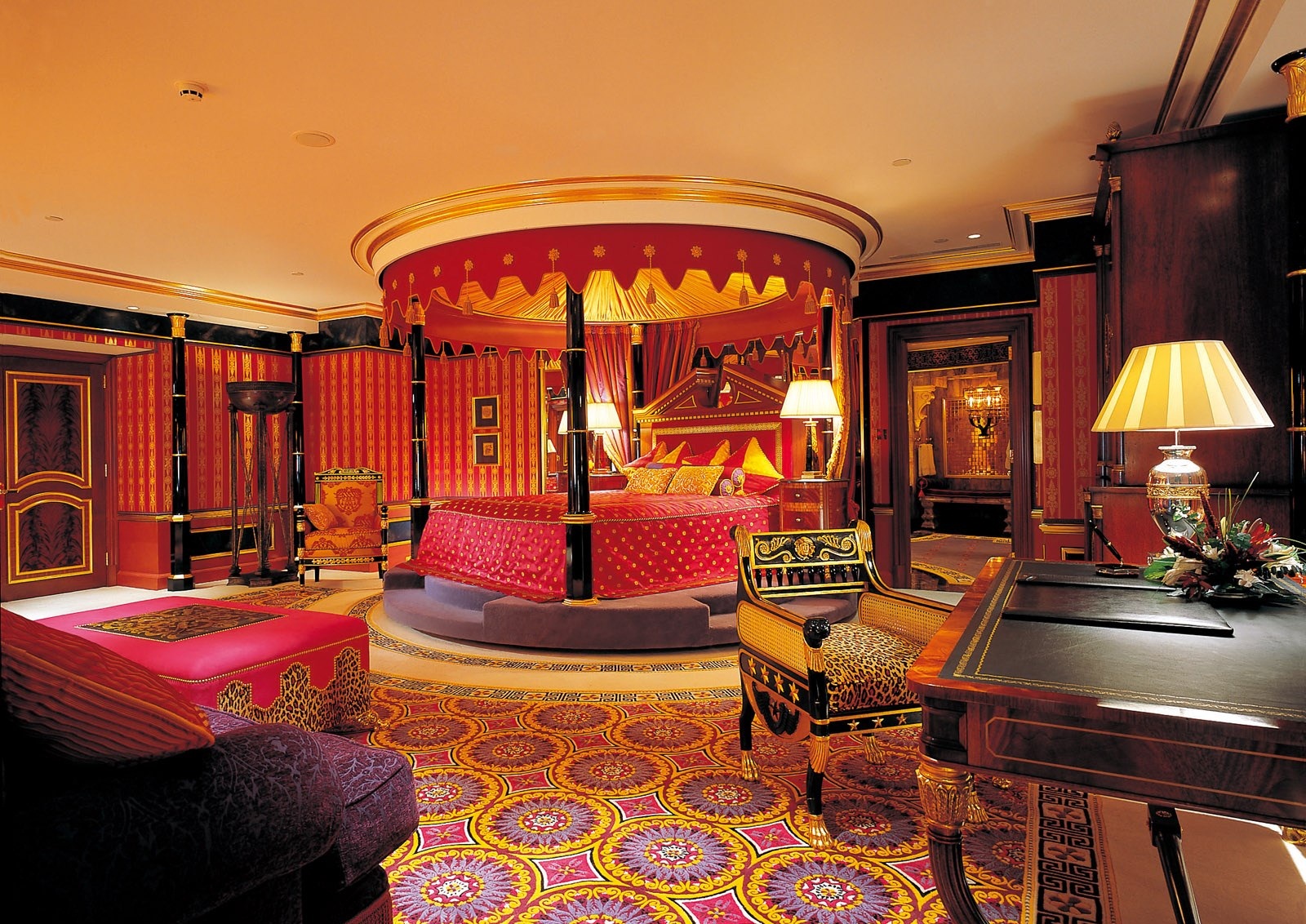No chão e nas paredes há um grande número de tapetes multicoloridos de seda ou de lã, que ajudarão a criar o luxo do quarto de um xeque oriental.