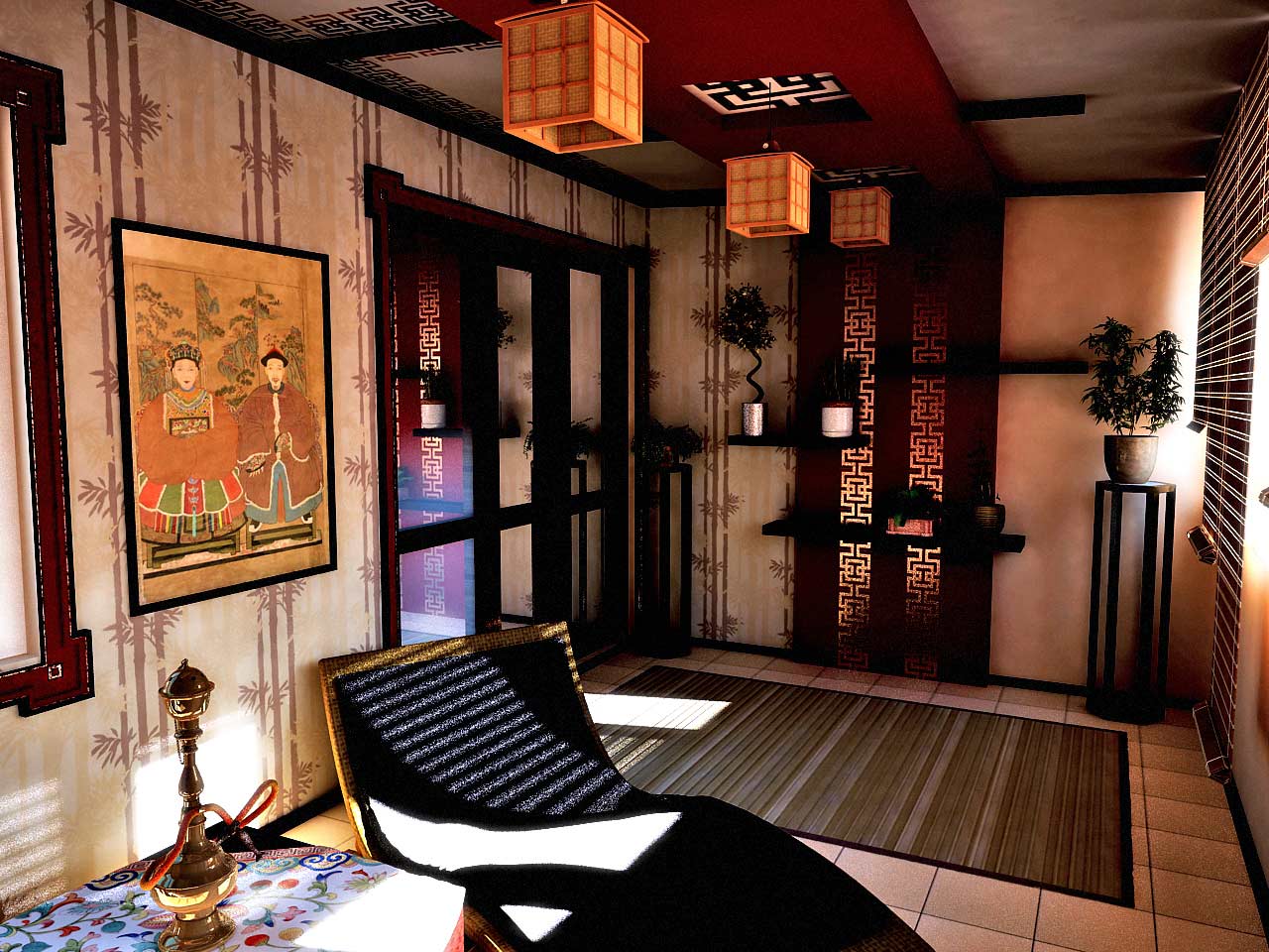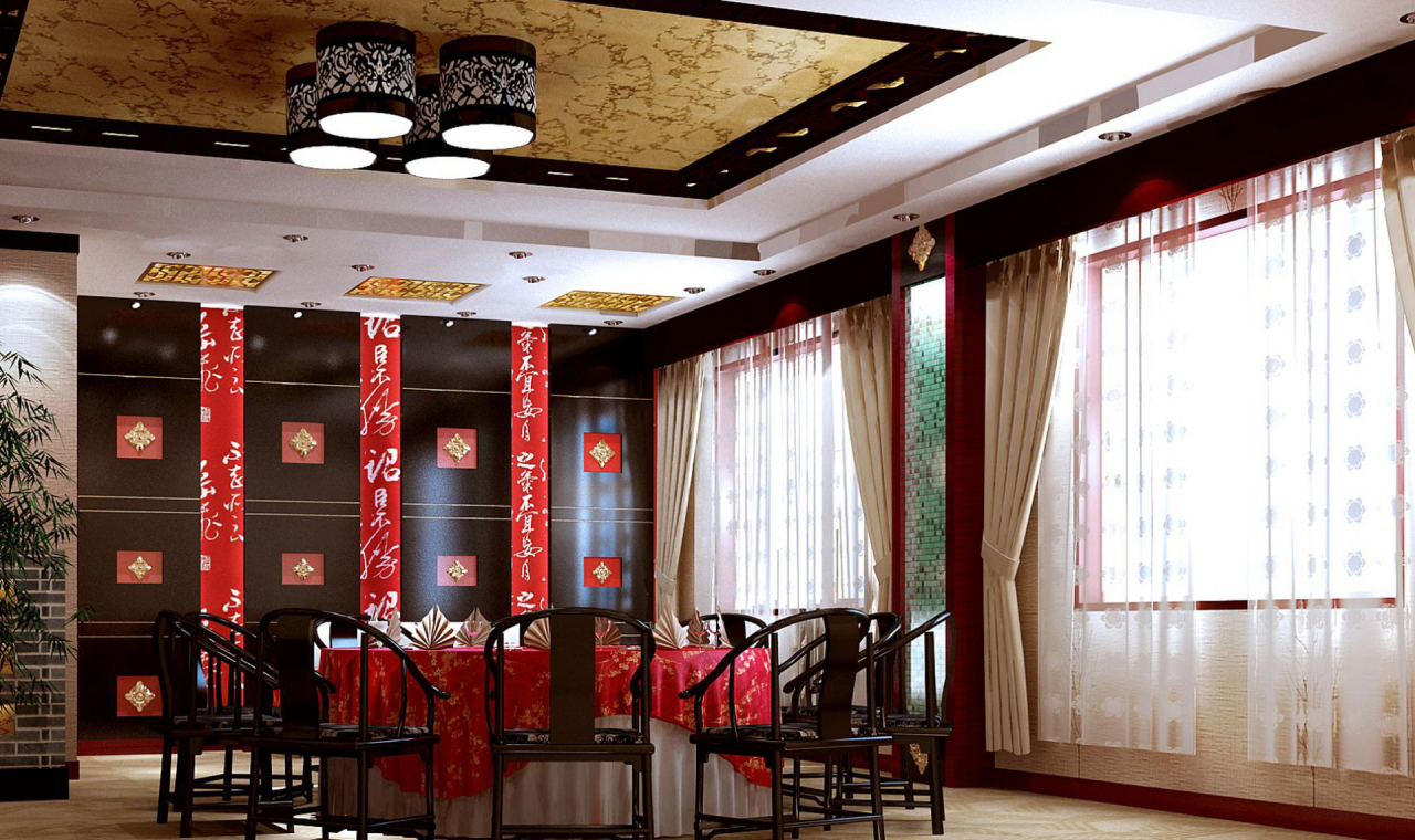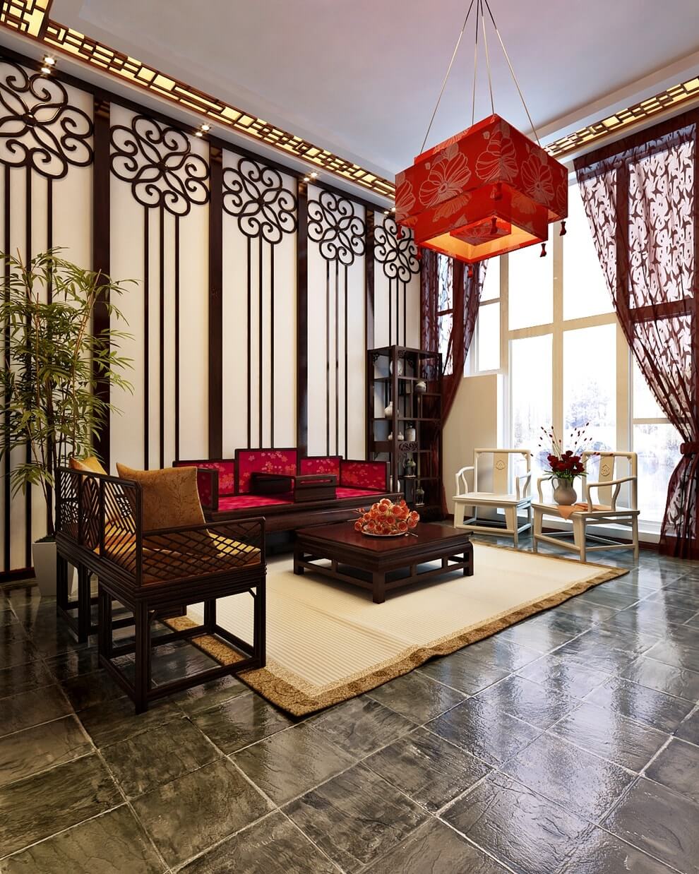 Ao criar o estilo chinês, as cores principais são preto e vermelho, na decoração eles usam serigrafia, cerâmica, porcelana, mesas e cadeiras redondas, para decoração - telha com ornamentos orientais.