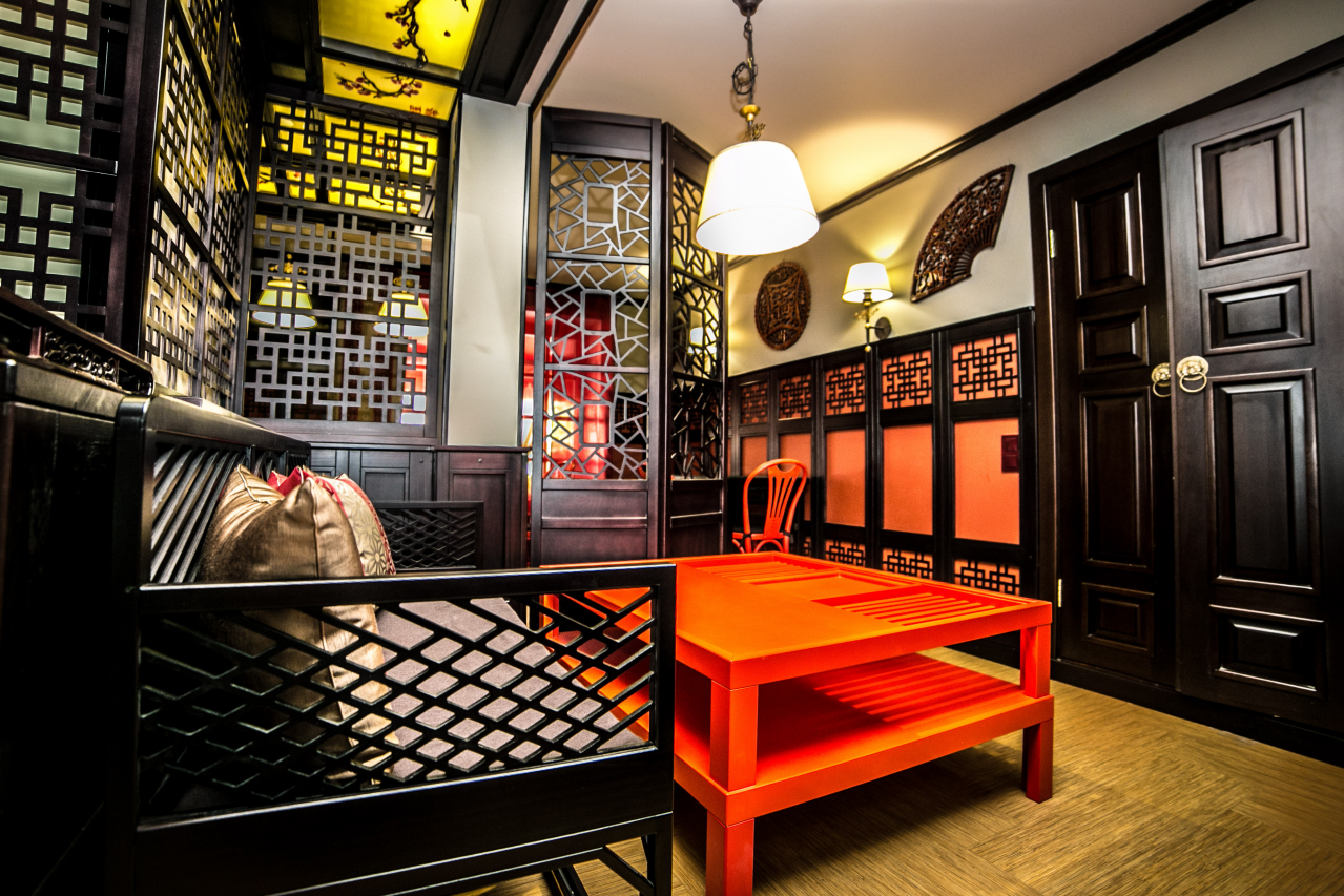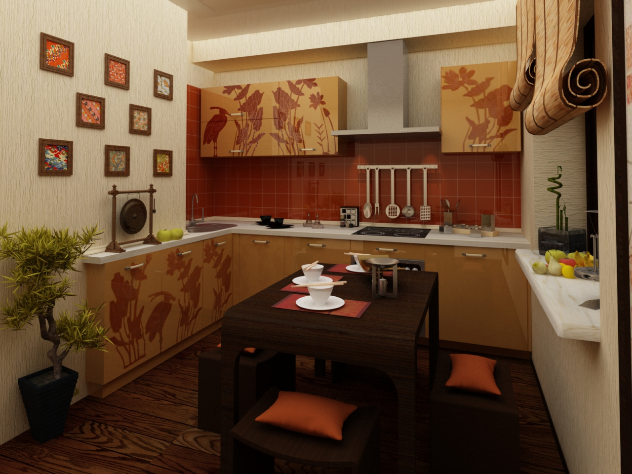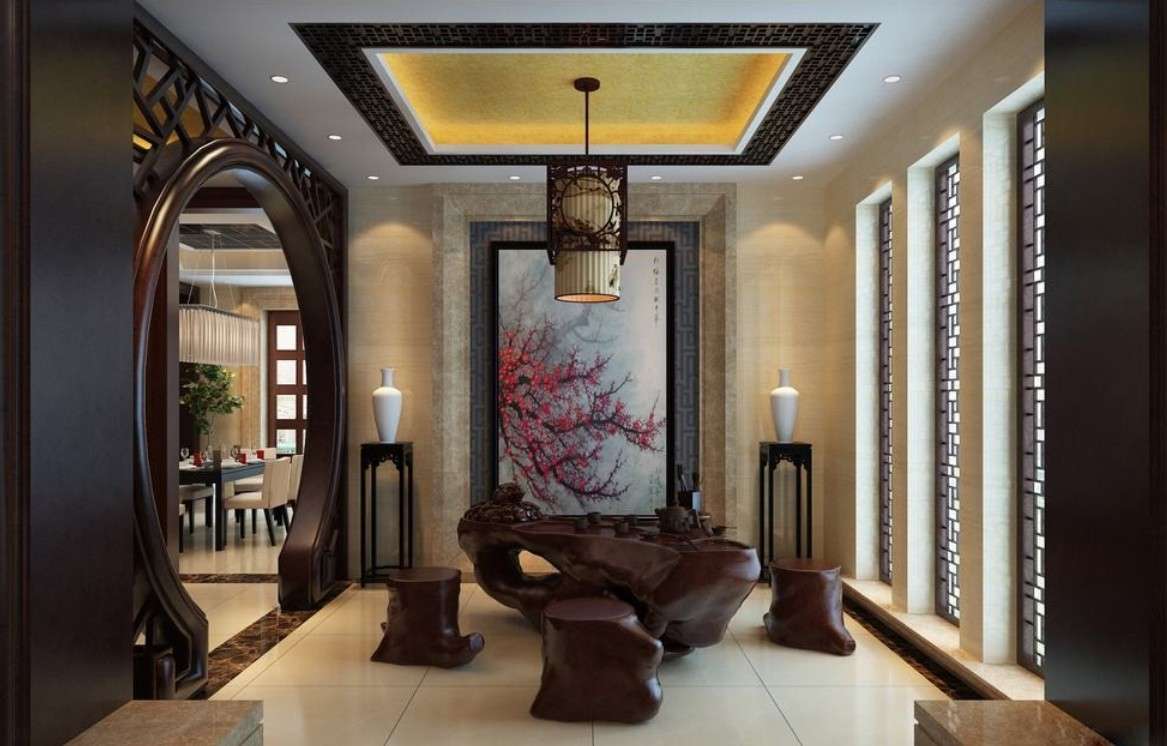 Ao criar o estilo chinês, as cores principais são preto e vermelho, na decoração eles usam serigrafia, cerâmica, porcelana, mesas e cadeiras redondas, para decoração - telha com ornamentos orientais.