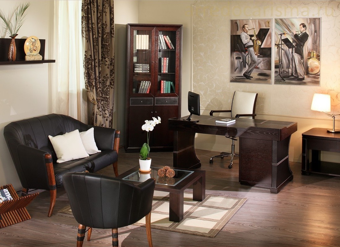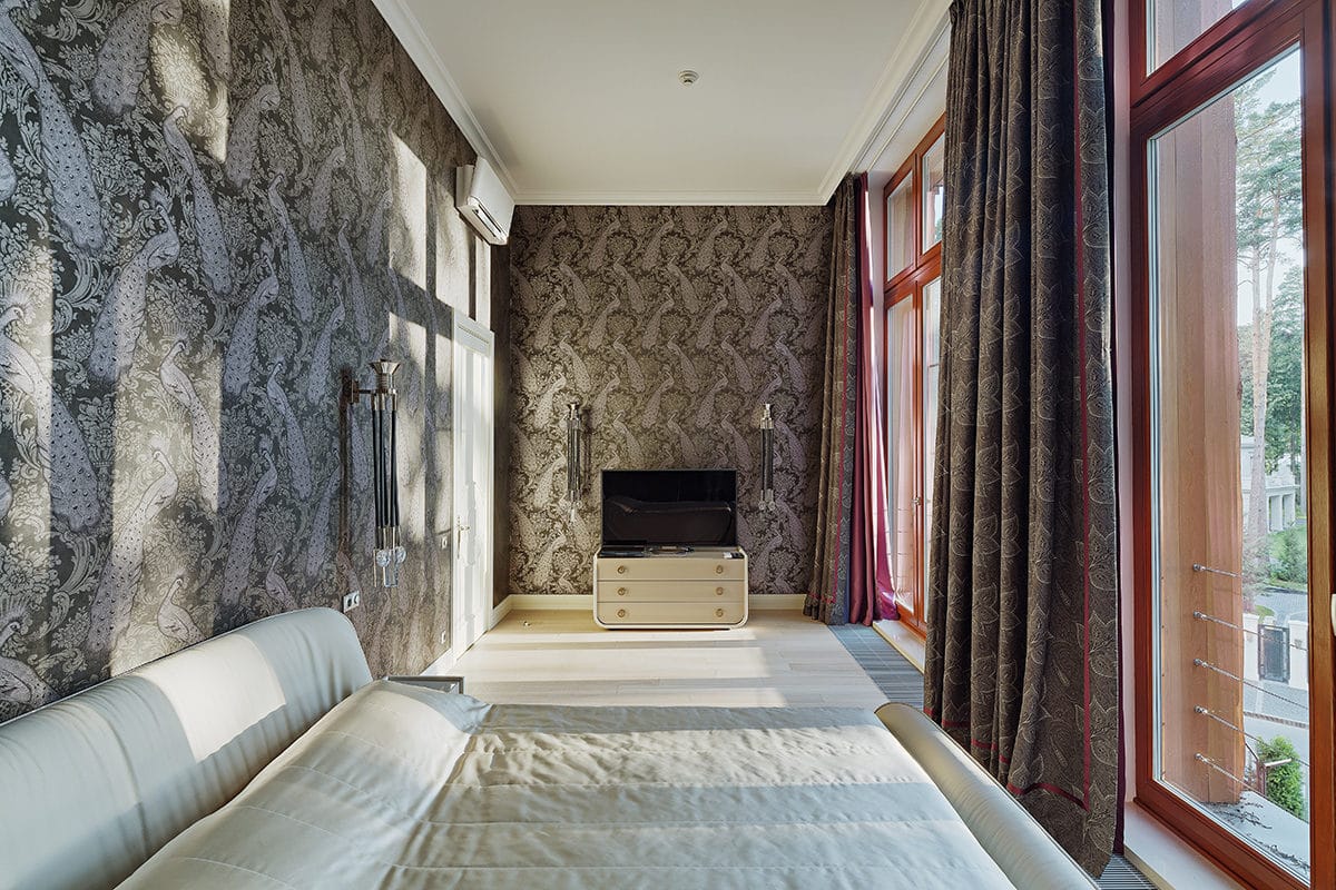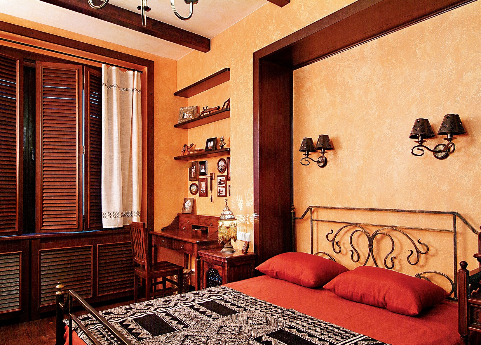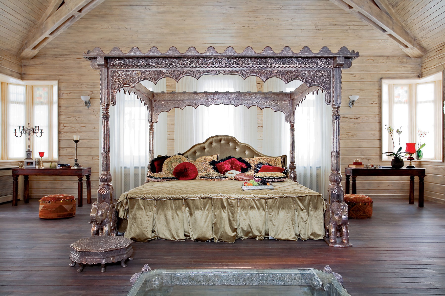 Elemento central do interior - a cama, necessariamente largo e baixo, feito de uma árvore de raças valiosas. Sua principal diferença é uma enorme cabeceira com elementos esculpidos, decorada com incrustações. Para identidade completa, você pode fornecer um dossel feito de tecido de veludo ou seda.