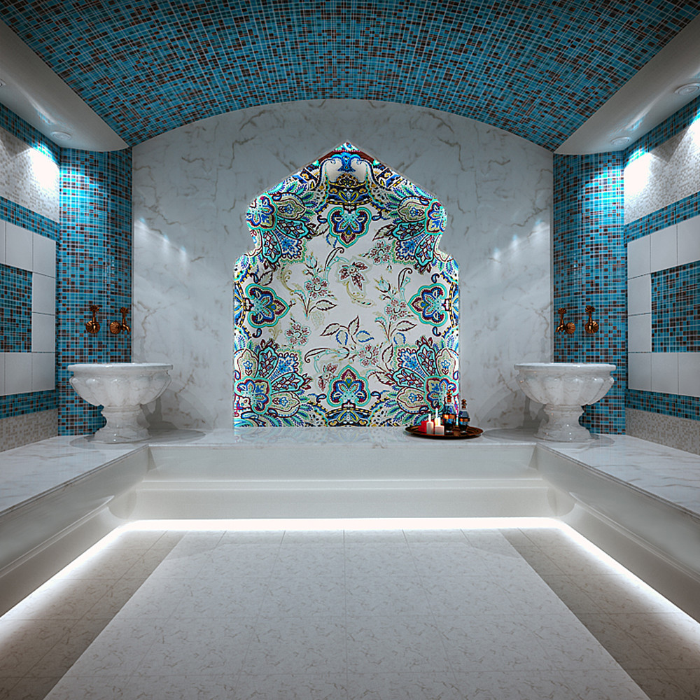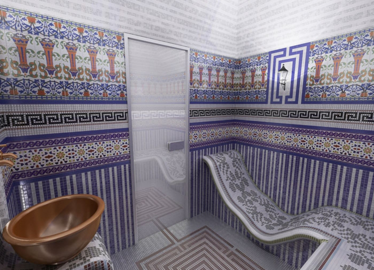 - Banheiro turco - Um exemplo de luxo em cores brilhantes, seu elemento principal é o ornamento nacional "pepino turco", aplicado sobre os detalhes da telha ou interior.