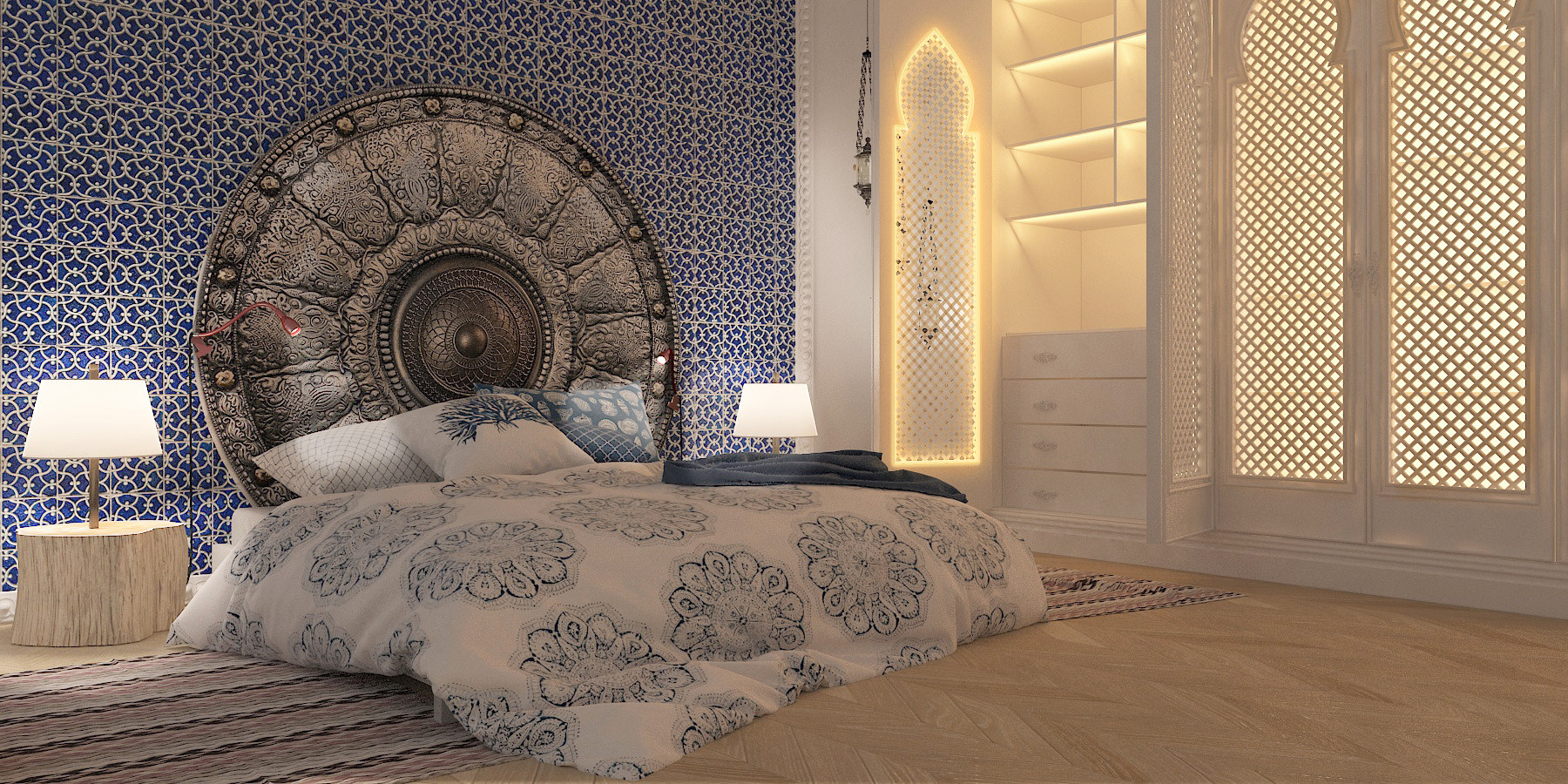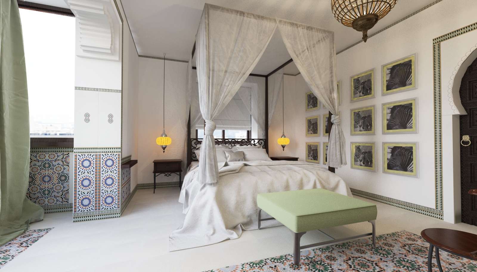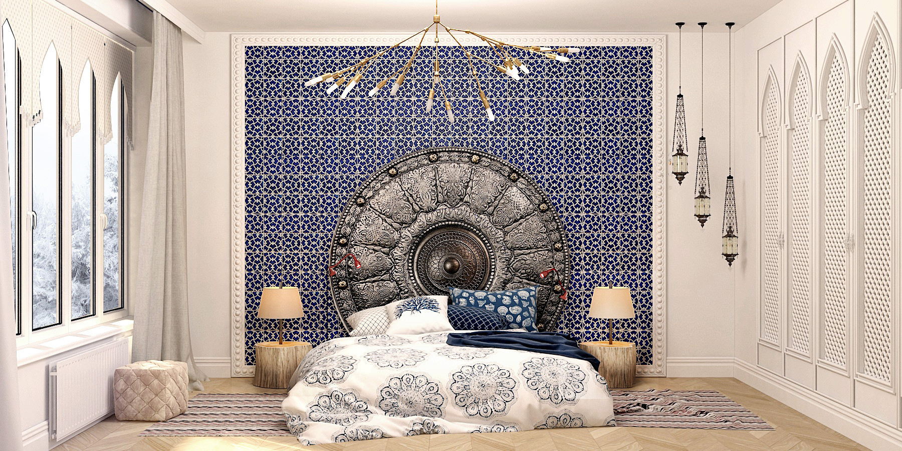 - Estilo marroquino desenvolvido sob a influência de tradições e cultura de várias nações (nômades berberes, franceses, etc.). Um elemento distintivo do estilo é um pequeno mosaico Zullyge (Zeleidzh) na forma de quadrados ou losangos, decorado com um ornamento de mosaico, e gesso tadelakt com boas propriedades repelentes de água. Cores tradicionais: ocre, azul, branco, carmesim. Lâmpadas de latão com padrões perfurados e decoradas com vidro colorido são usadas como ornamentos decorativos.