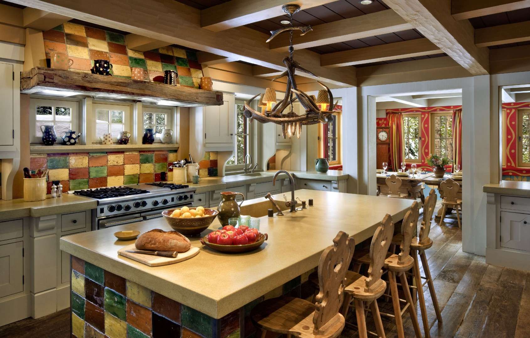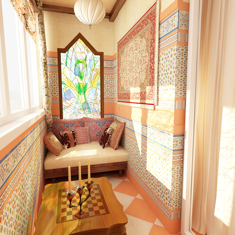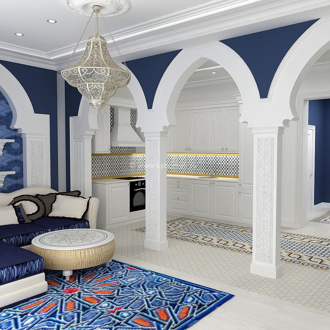 - Estilo marroquino desenvolvido sob a influência de tradições e cultura de várias nações (nômades berberes, franceses, etc.). Um elemento distintivo do estilo é um pequeno mosaico Zullyge (Zeleidzh) na forma de quadrados ou losangos, decorado com um ornamento de mosaico, e gesso tadelakt com boas propriedades repelentes de água. Cores tradicionais: ocre, azul, branco, carmesim. Lâmpadas de latão com padrões perfurados e decoradas com vidro colorido são usadas como ornamentos decorativos.