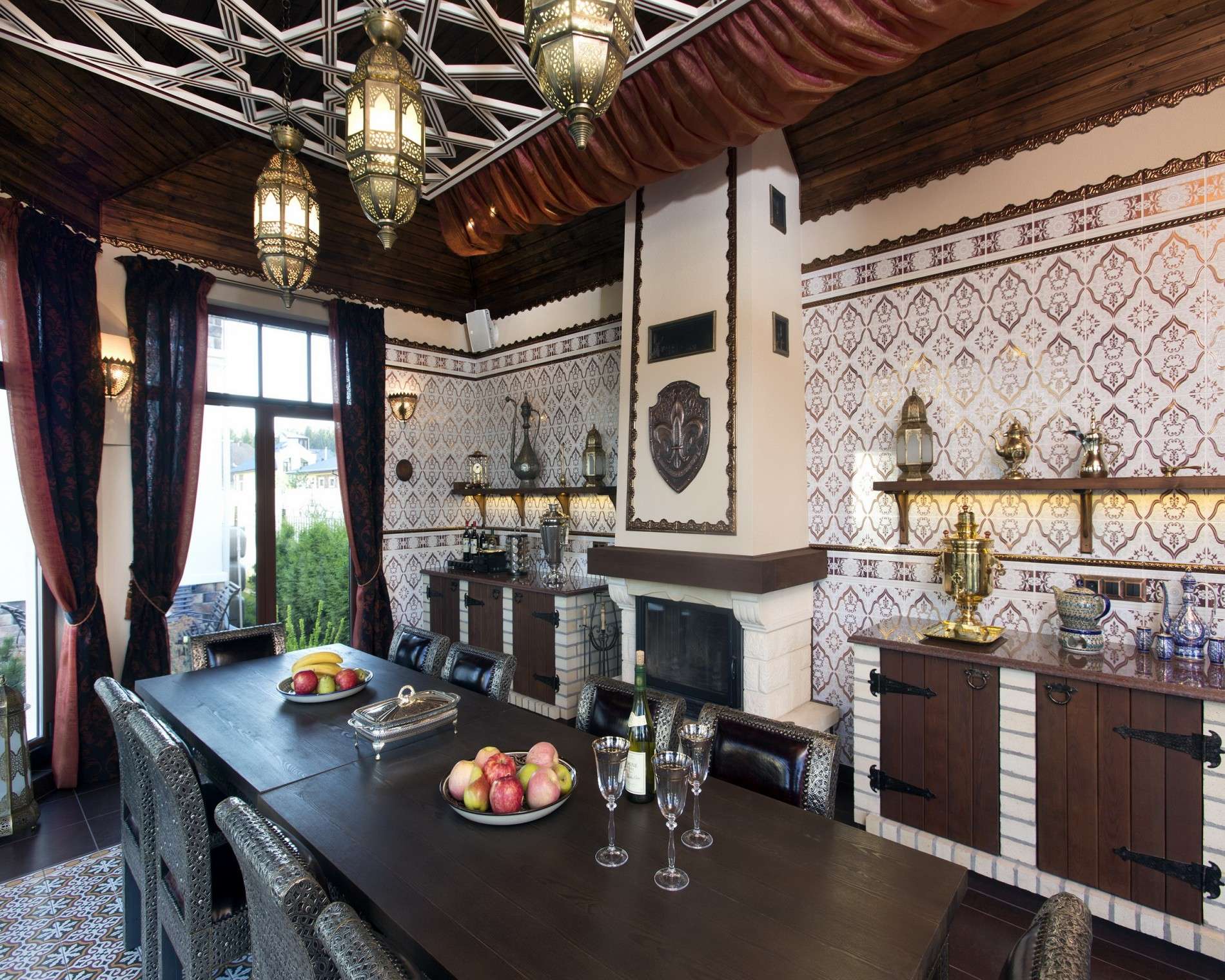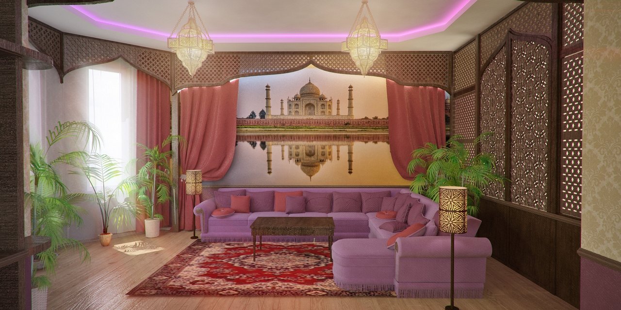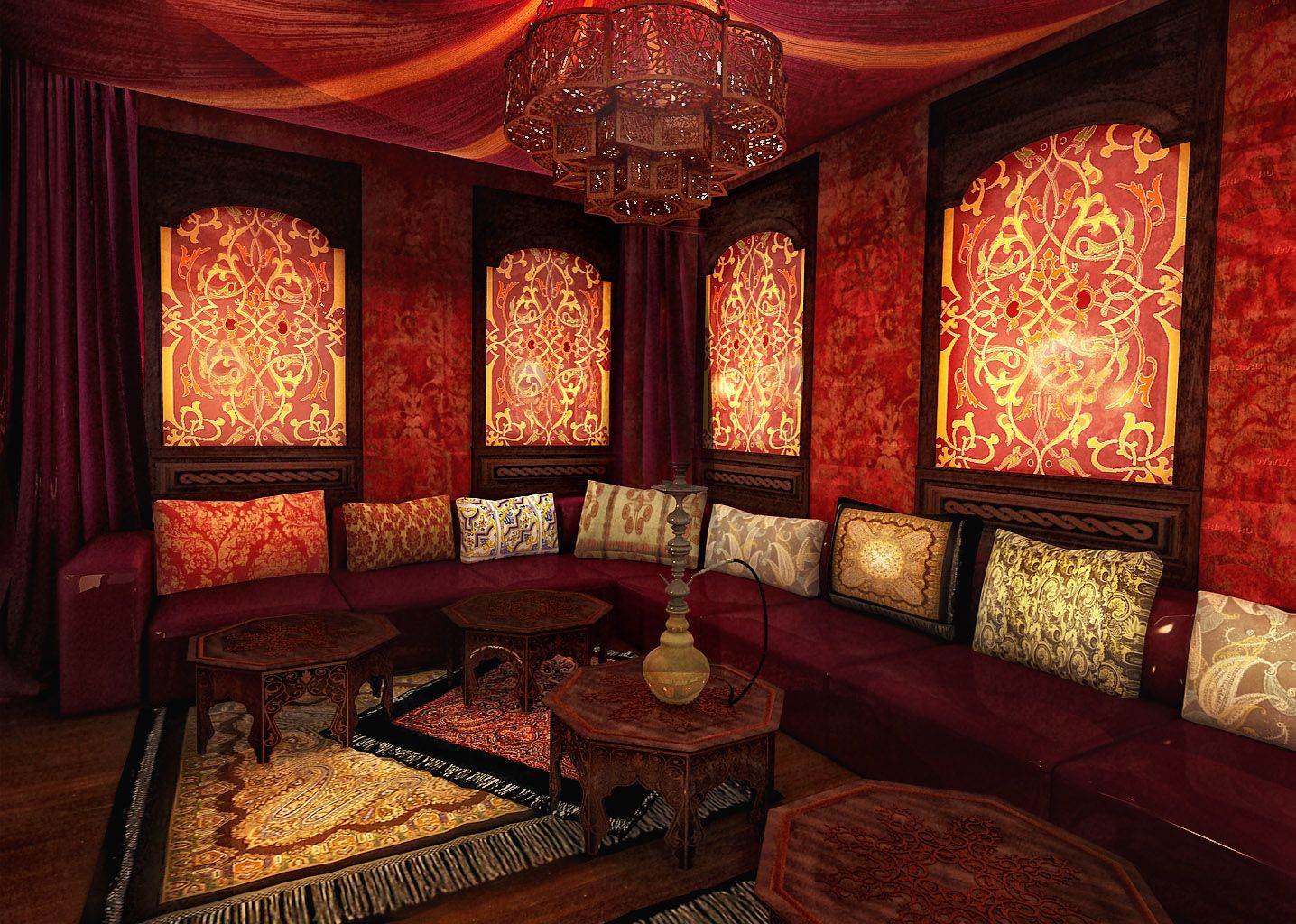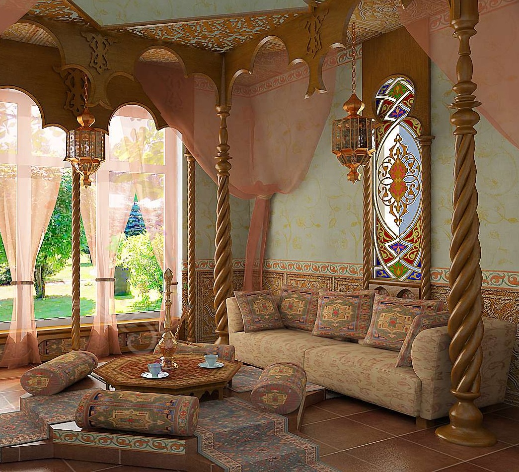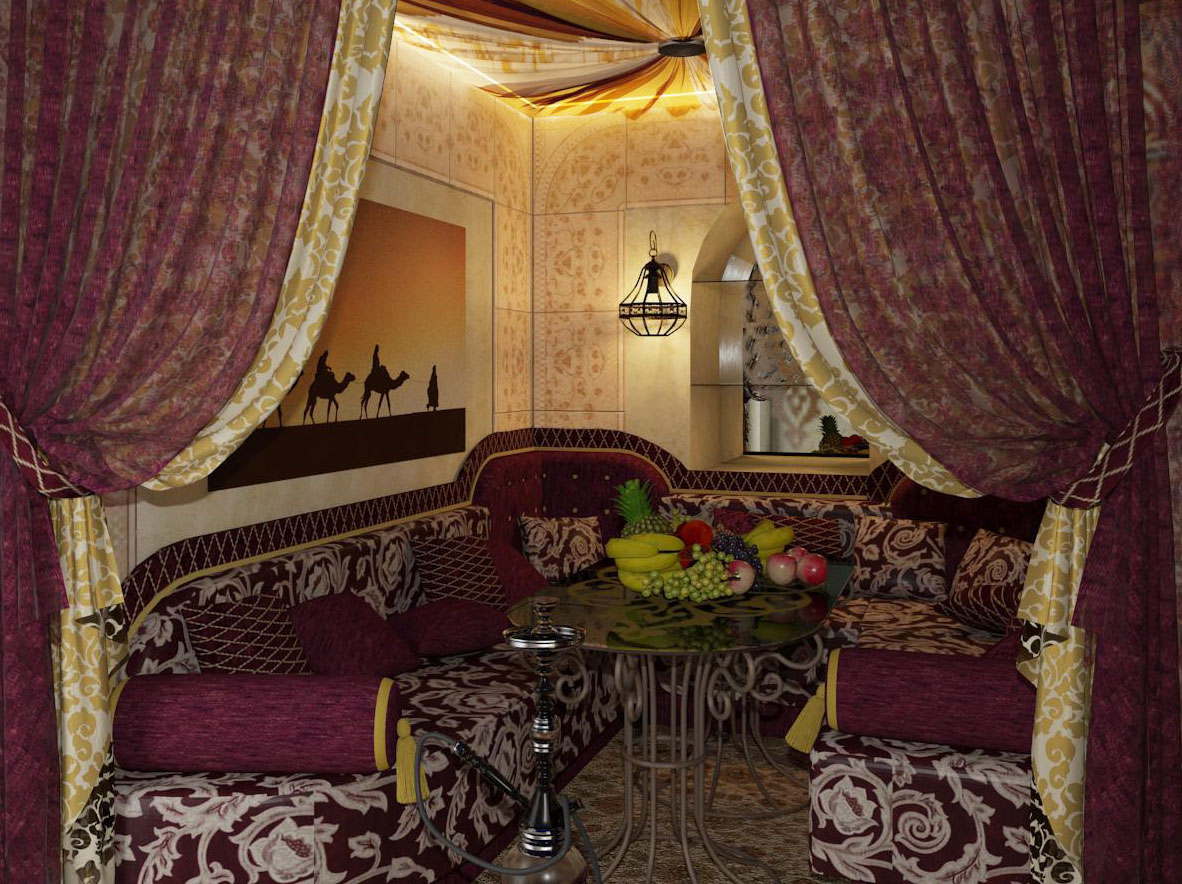 Os principais elementos da decoração no interior da Arábia são tecidos, cortinas, produtos de ferro forjado (lâmpadas, pratos), travesseiros e tapetes com padrão nacional, móveis de madeira natural. Para criar a atmosfera do "palácio do padish" eles usam cores contrastantes no estofamento de móveis estofados, cortinas nas janelas (roxo, creme, tons vermelhos).