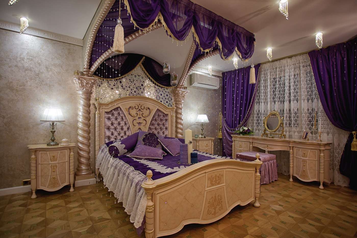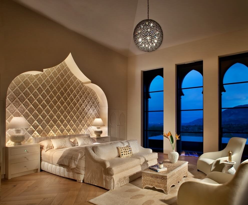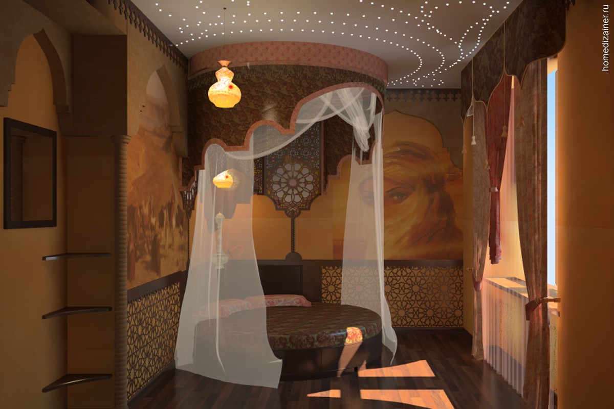 A sala em estilo árabe, destinada a descanso e sono, pode se tornar uma ilustração do conto de fadas oriental “1000 e uma noite”. Um quarto parecido com um quarto padishah em um palácio marroquino deve impressionar com luxo e uma abundância de decoração.