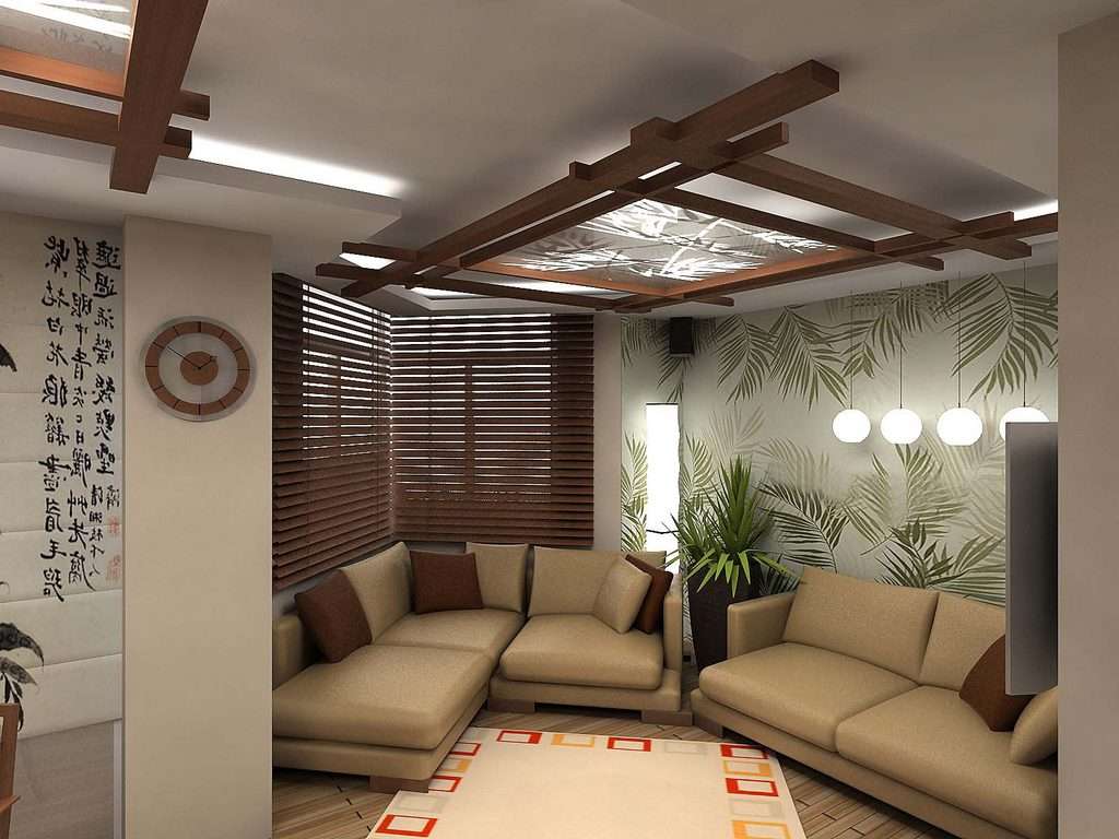 O centro da composição da sala de estar pode ser um teto suspenso feito de pano, plantas em vasos de madeira, colocados na sala.