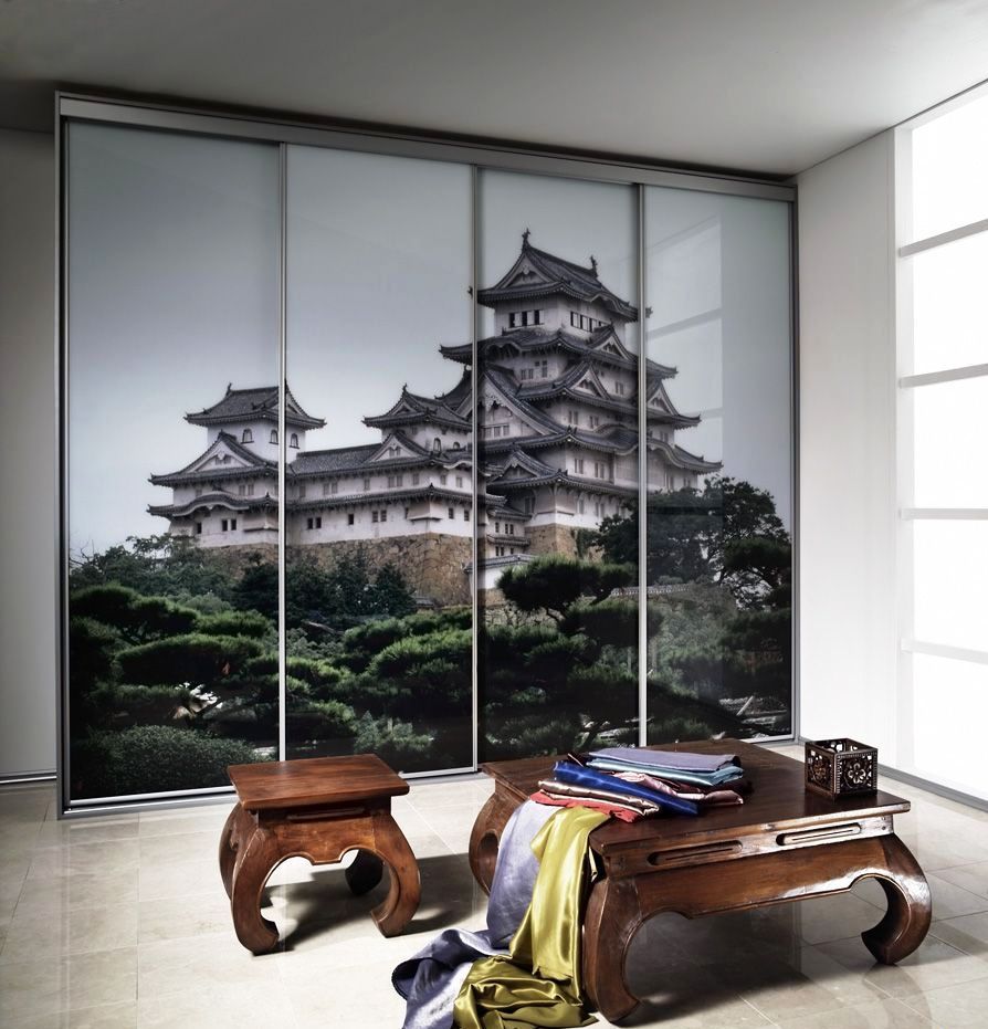 As pinturas nas paredes contêm imagens de pagodes, palácios japoneses, sol, lótus e samurais.