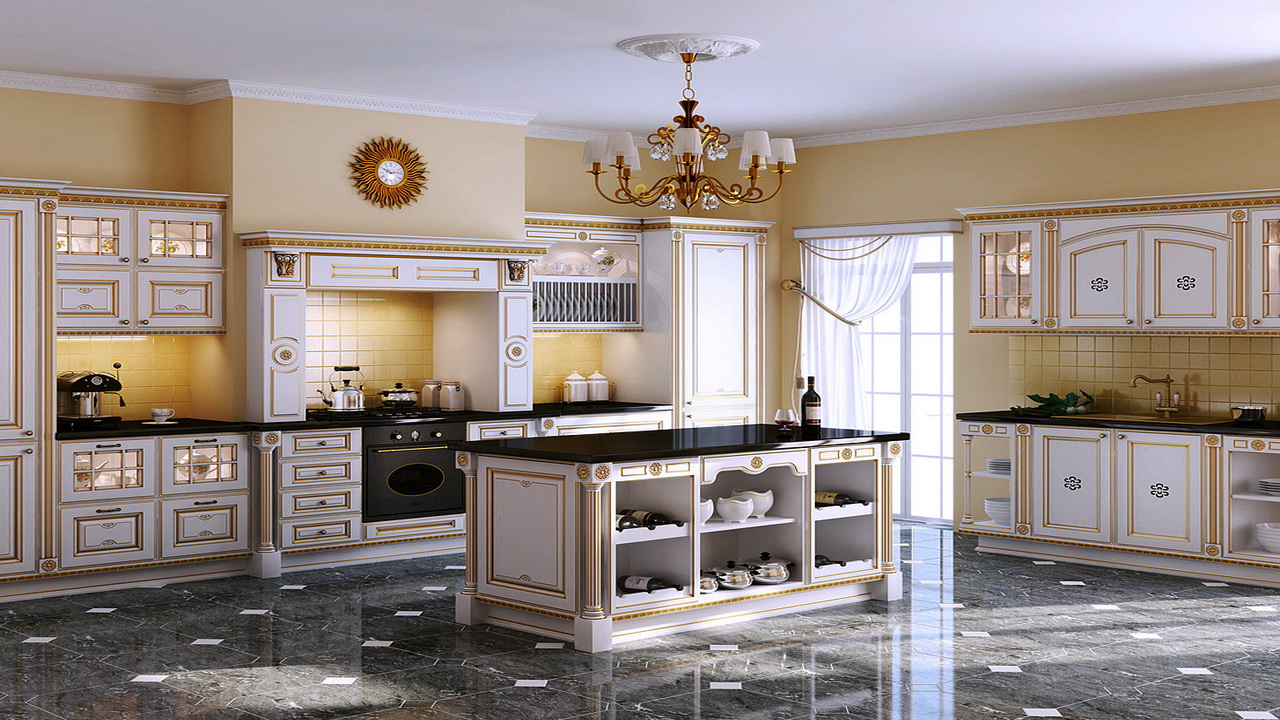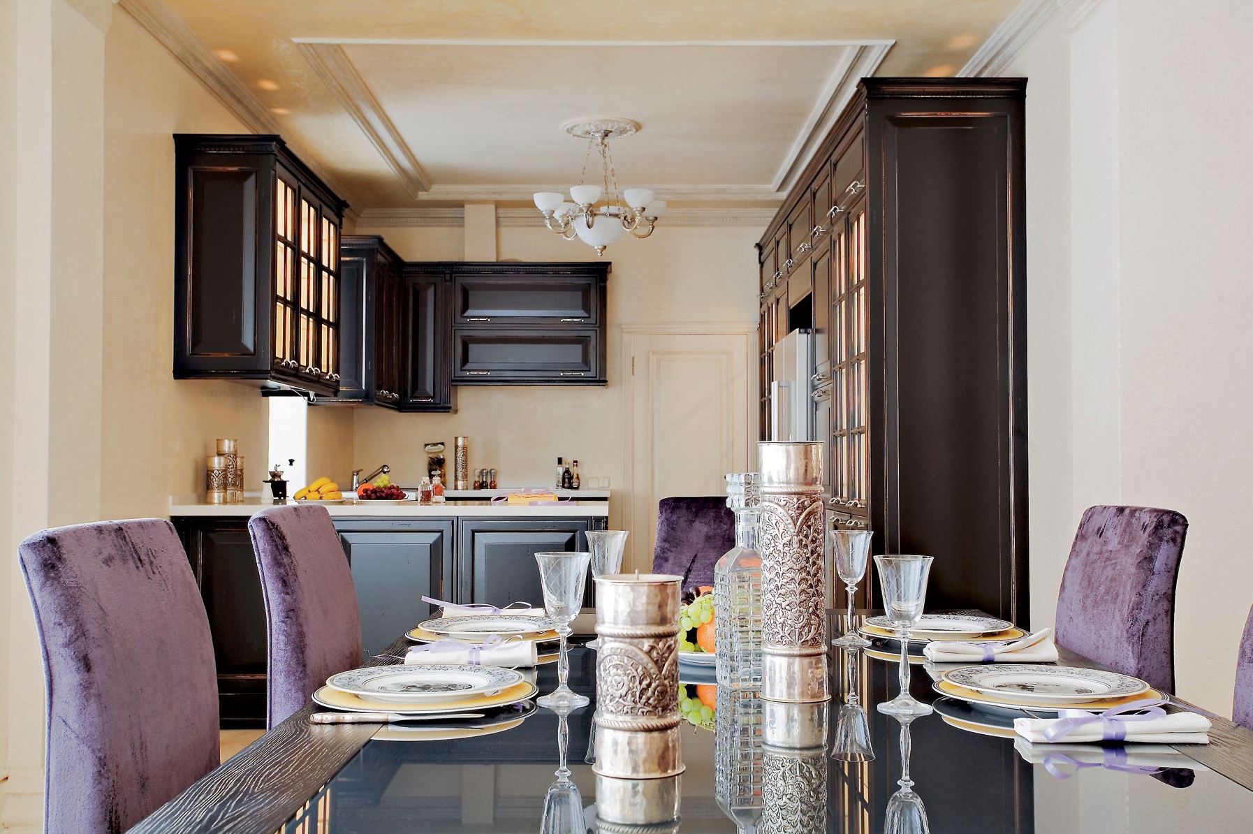 Todo o mobiliário deve ser branco, mesa de cozinha - feita de madeira ou vidro.