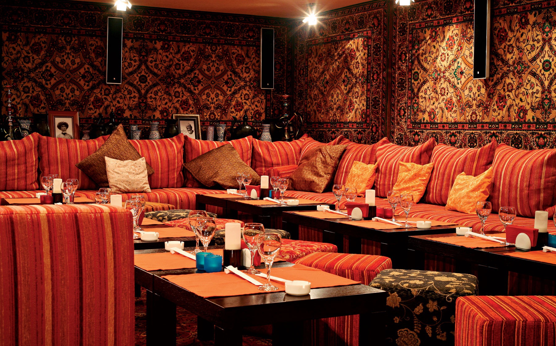 - Acessórios orientais: travesseiros com bordados, tabuleiros de xadrez, vasos e tigelas pintadas, jarros de barro, narguilé, porcelana com escrita árabe.