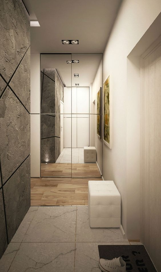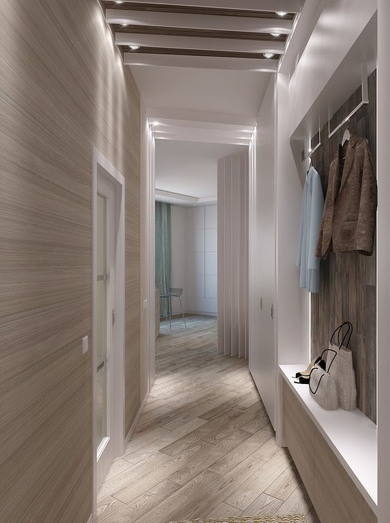No corredor, as paredes estão sujeitas a poluição devido à especificidade da sala, por isso, ao escolher, deve-se dar preferência a materiais que suportem a limpeza.