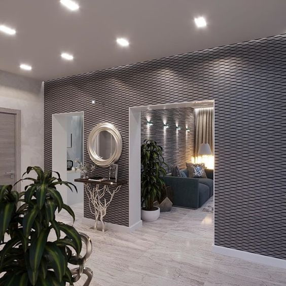 Este tipo de material de acabamento, como papel de parede, surpreende com uma variedade de texturas e cores. O interior elegante do corredor, sublinhado pelo design das paredes, permite criar uma impressão sobre todo o apartamento.