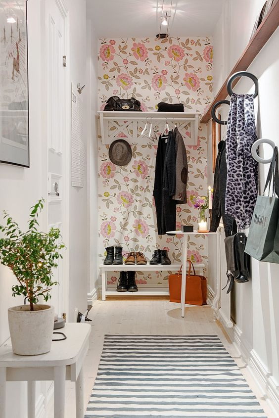 O corredor cria a primeira impressão do apartamento. Não deve ser apenas funcional, mas também bonita, especialmente o papel de parede no corredor.