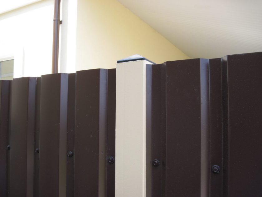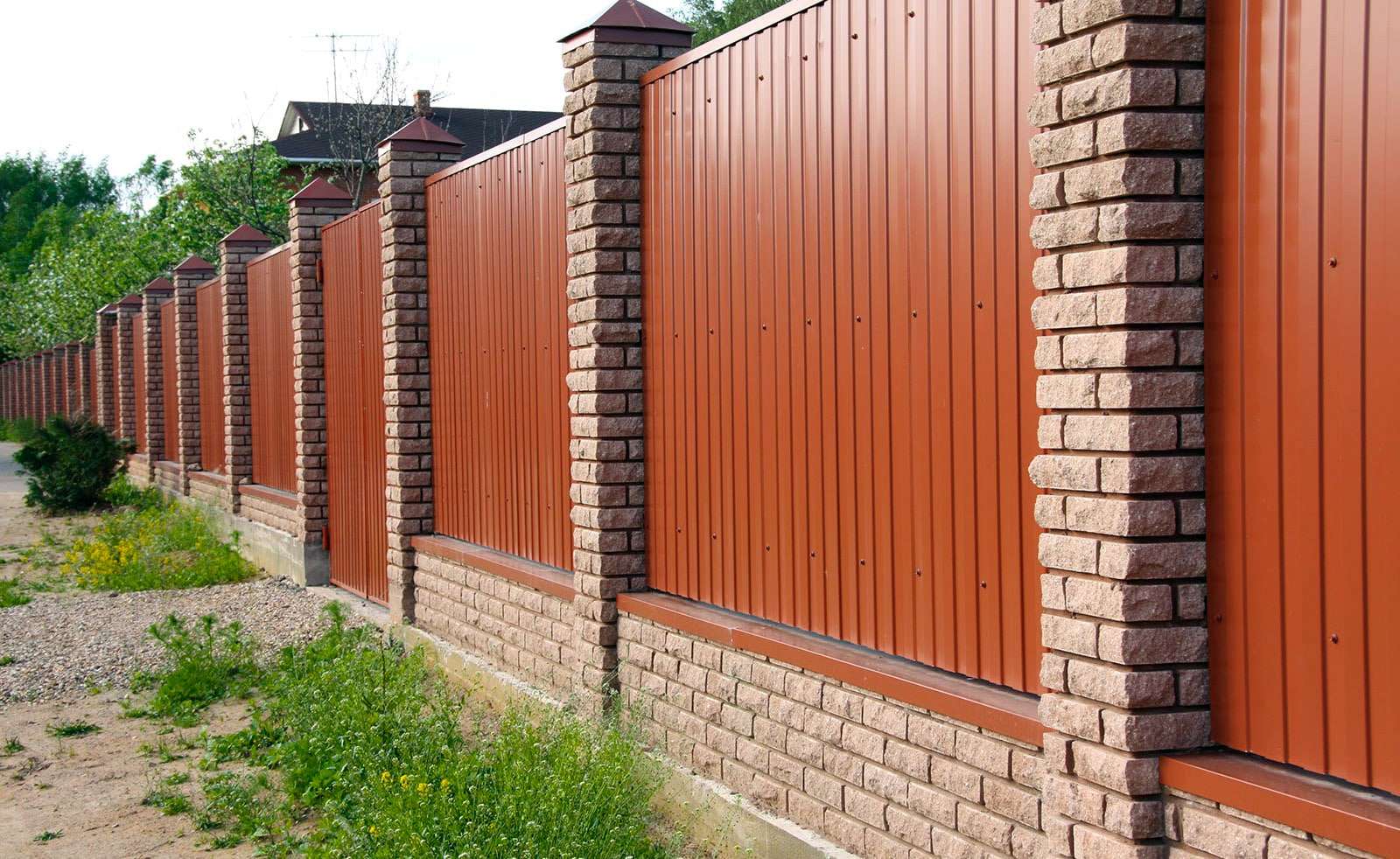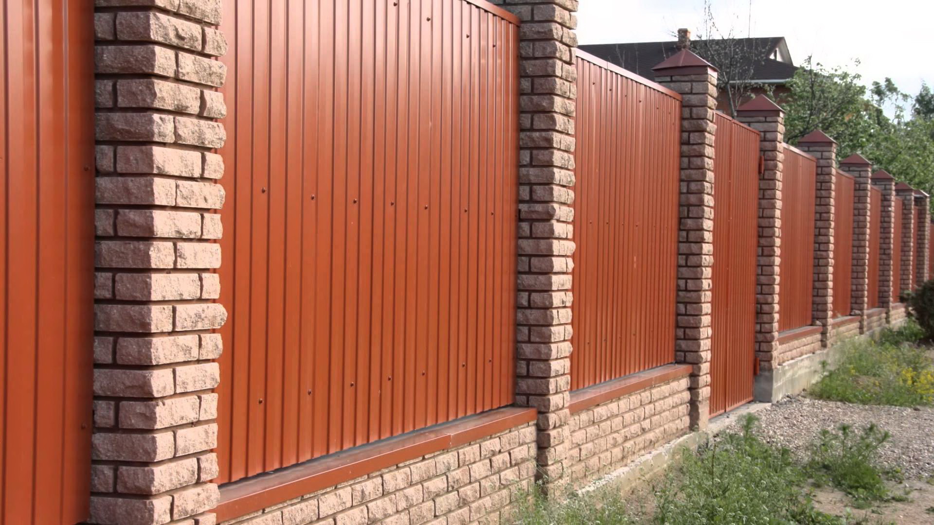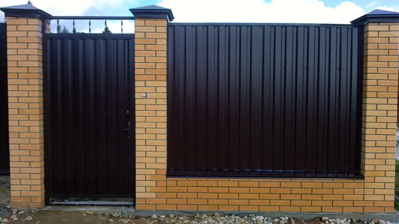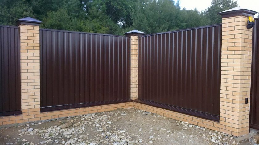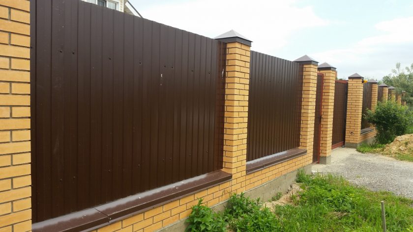 Essas paredes de tijolos e chapas perfiladas eram montadas rapidamente. Você não precisa ser um mestre especializado, você só precisa tratar com cuidado a tarefa. Os pilares de tijolos tornam o suporte mais durável e estável. Para todos, você obtém um plus na forma de melhorar a aparência estética geral.