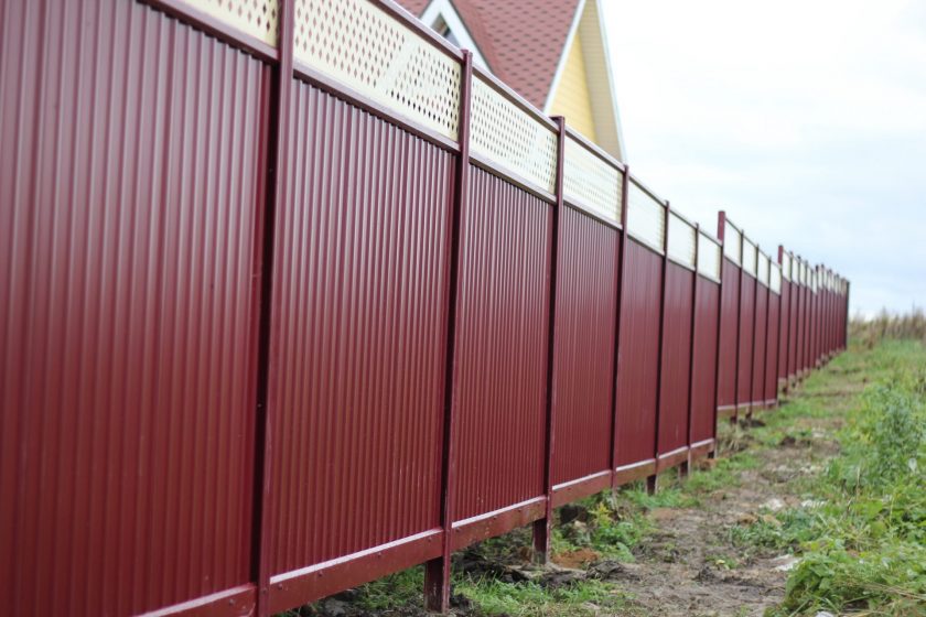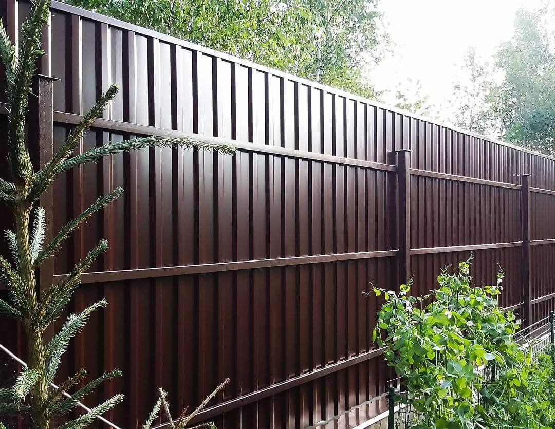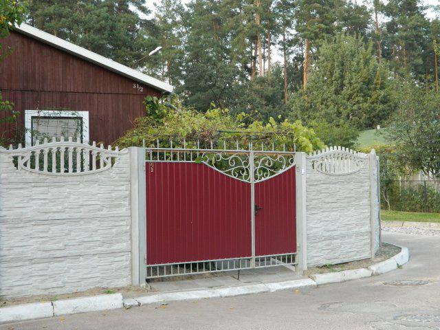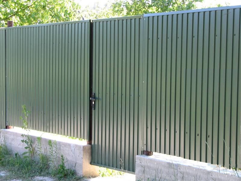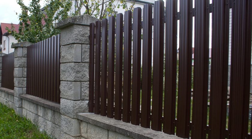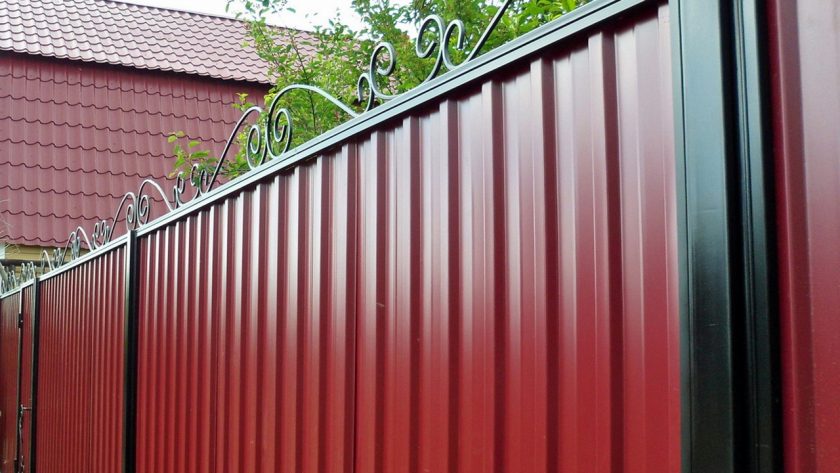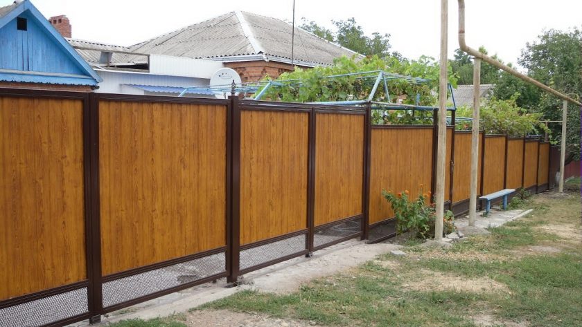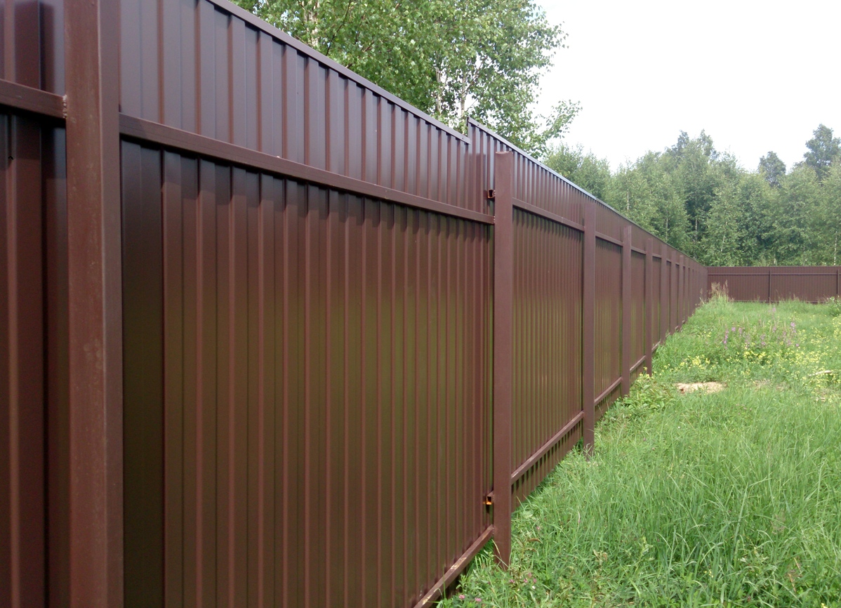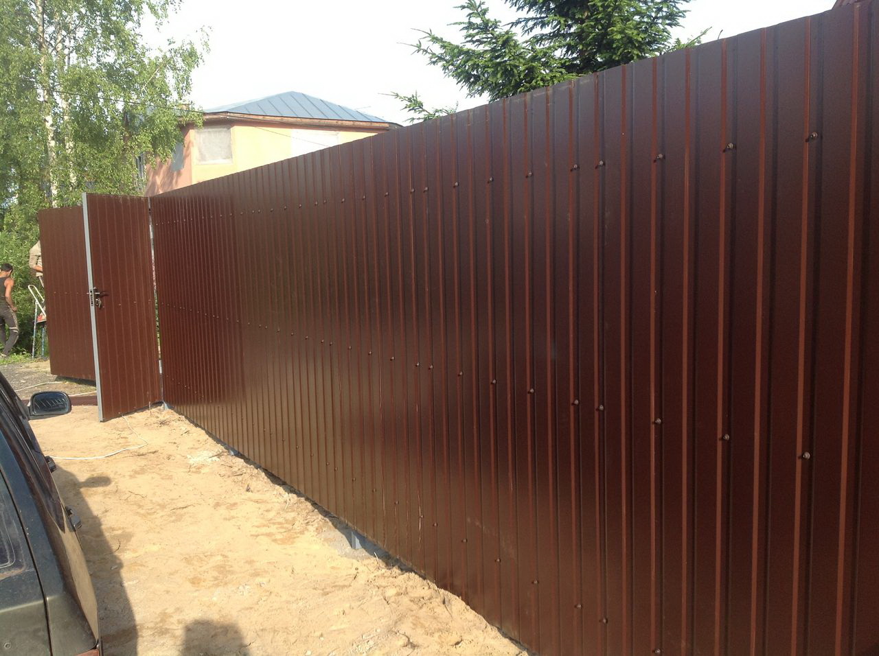 Tal cerca parecerá muito bonita, estética. Além disso, em comparação com uma cerca feita de madeira ou uma malha de elo de corrente, a cerca feita de chapa perfilada torna-se mais confiável e robusta.