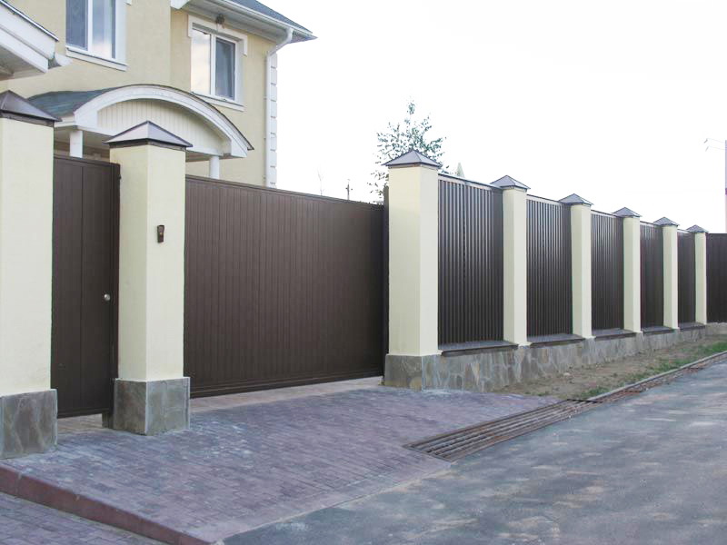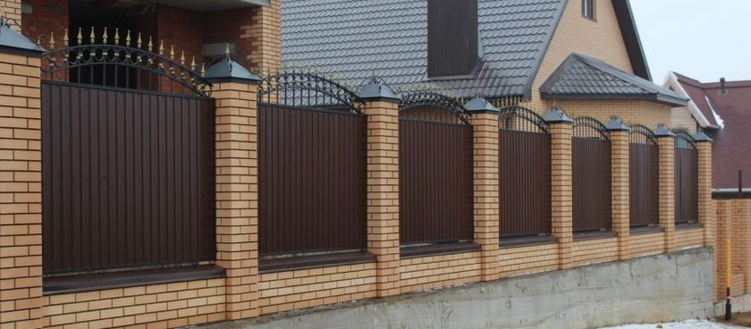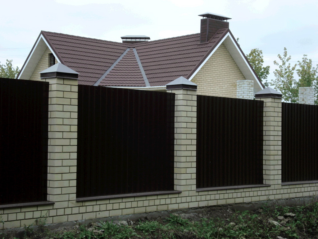A combinação de folha de metal e tijolo é ótima para a construção de uma cerca não só na casa de campo, mas também em uma "casa no chão" residencial em que você vive permanentemente.