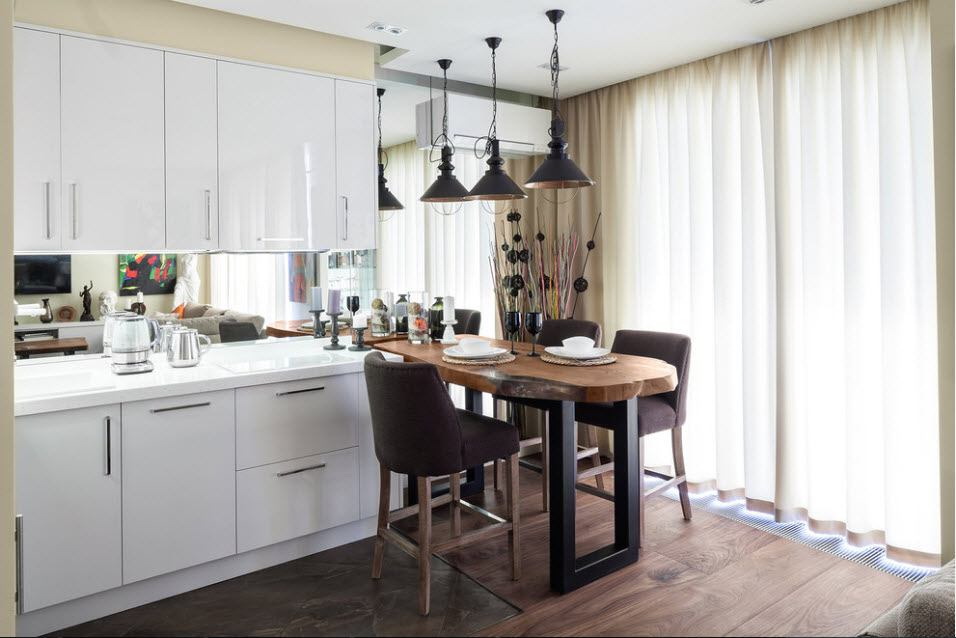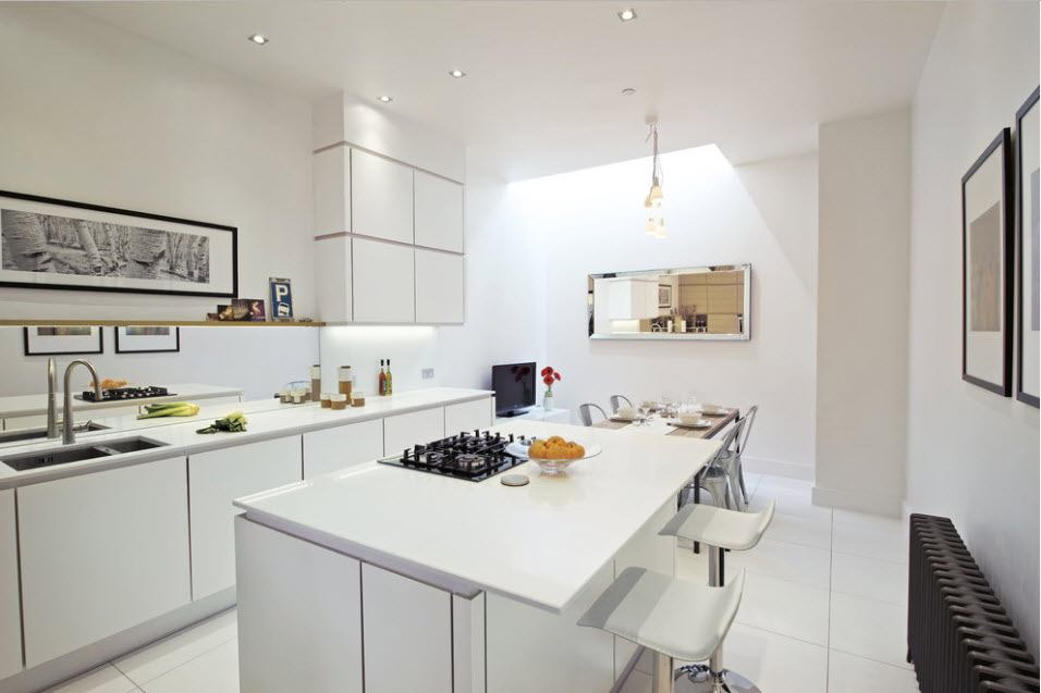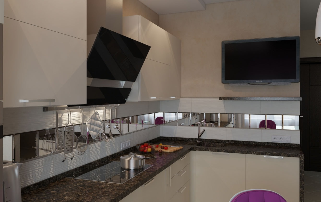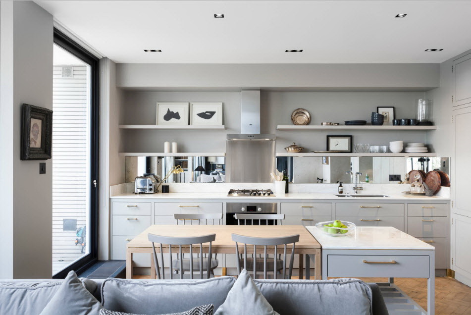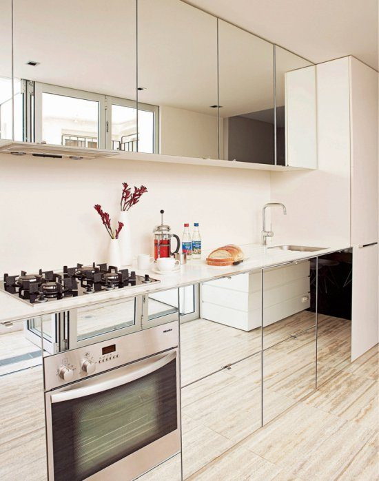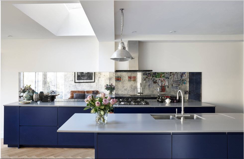 - Espelho em toda a área da parede. Se a parede inteira ou dois é espelhada, então evitamos a sensação de um espaço "fechado". A ideia é adequada para cozinhas de pequeno porte, exigirá um custo mínimo. Localizado em frente à unidade de cozinha fará uma típica sala retangular estreita.