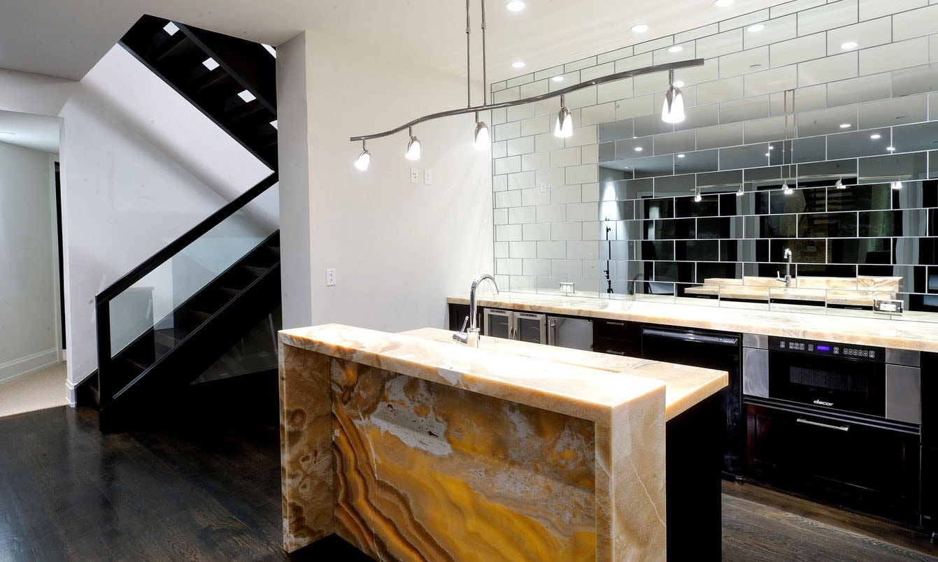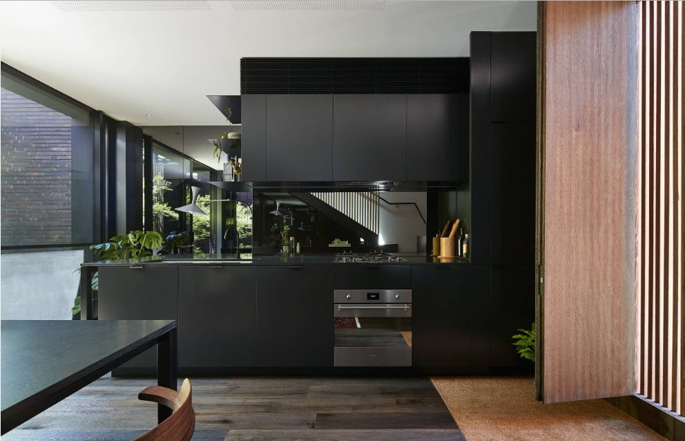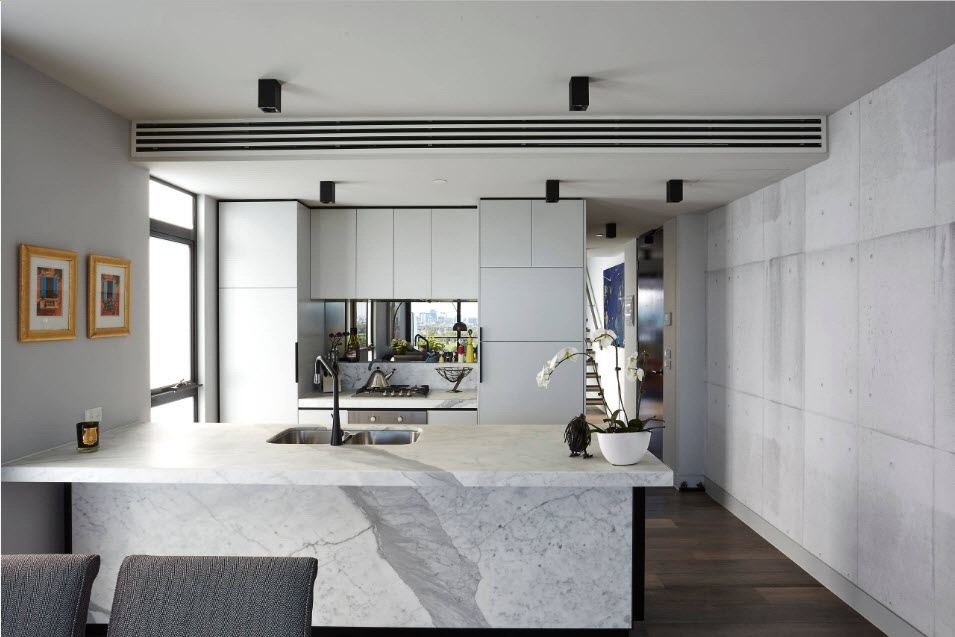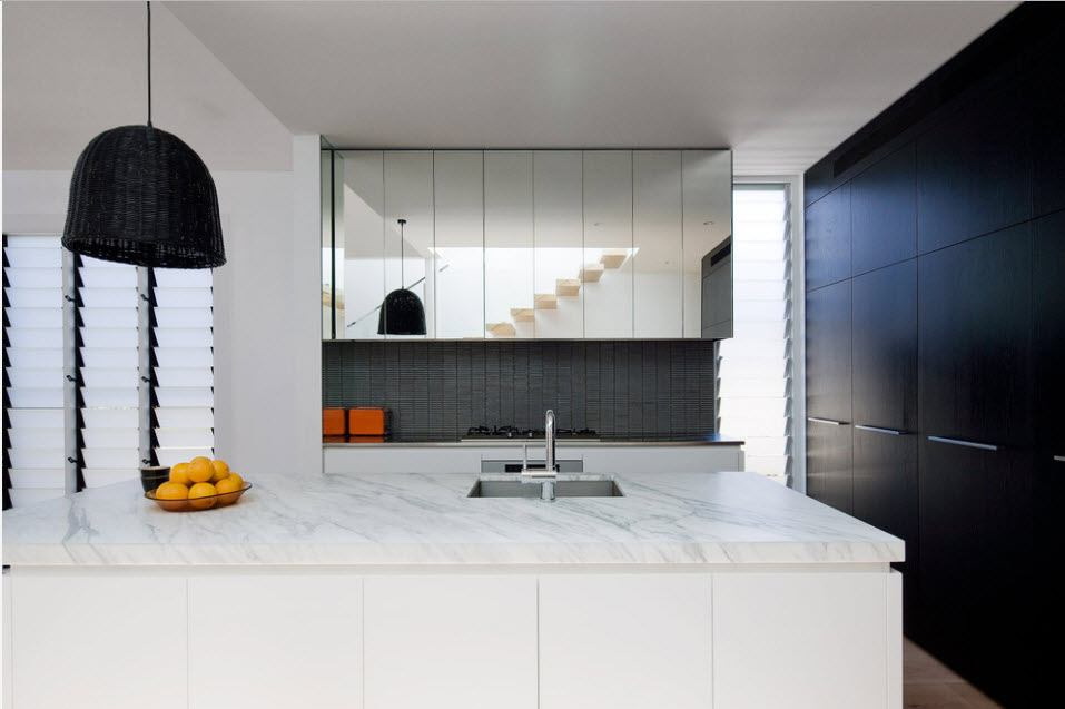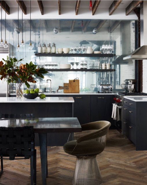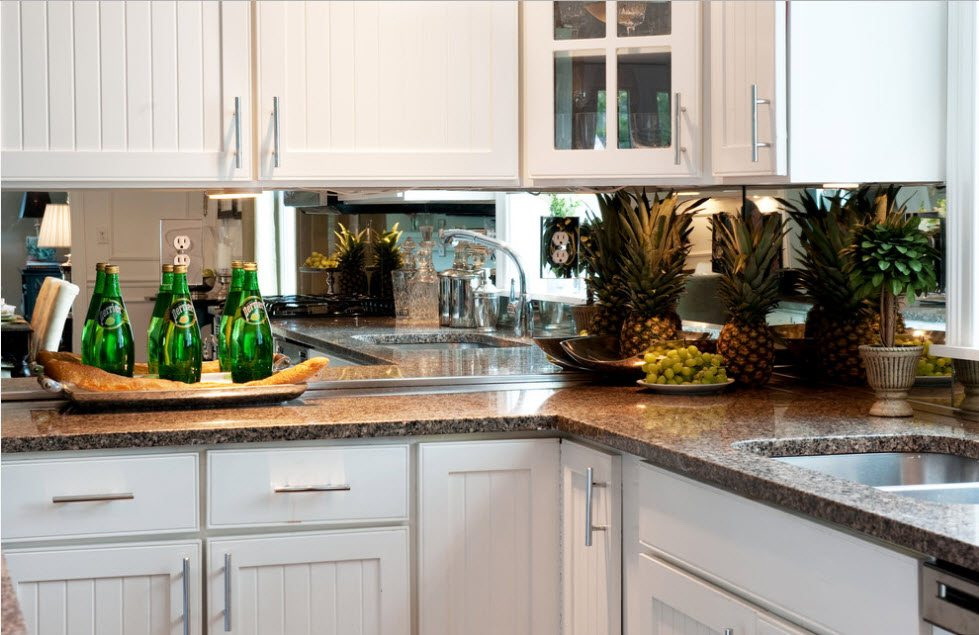 - Espelho em toda a área da parede. Se a parede inteira ou dois é espelhada, então evitamos a sensação de um espaço "fechado". A ideia é adequada para cozinhas de pequeno porte, exigirá um custo mínimo. Localizado em frente à unidade de cozinha fará uma típica sala retangular estreita.