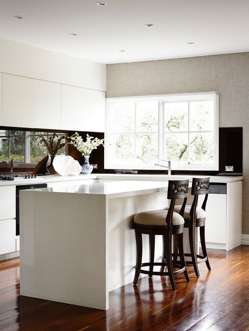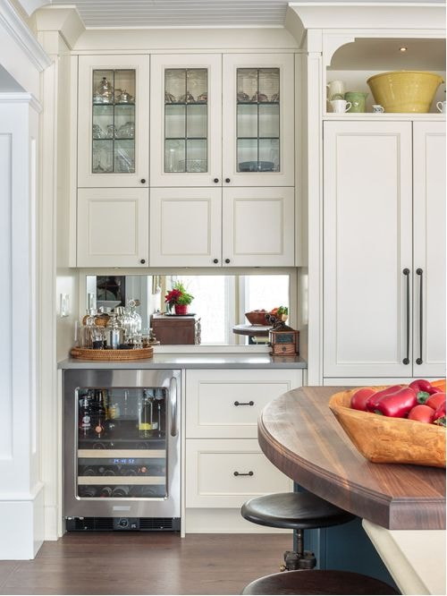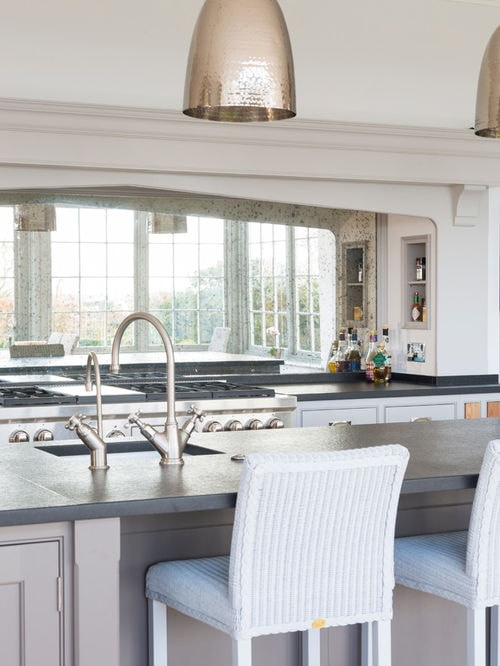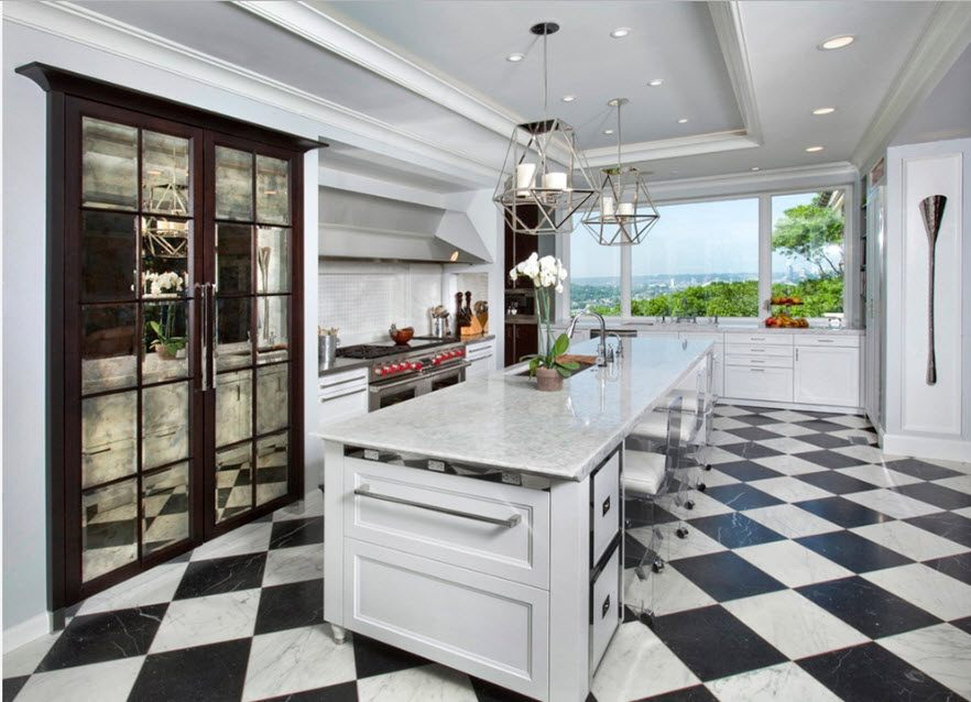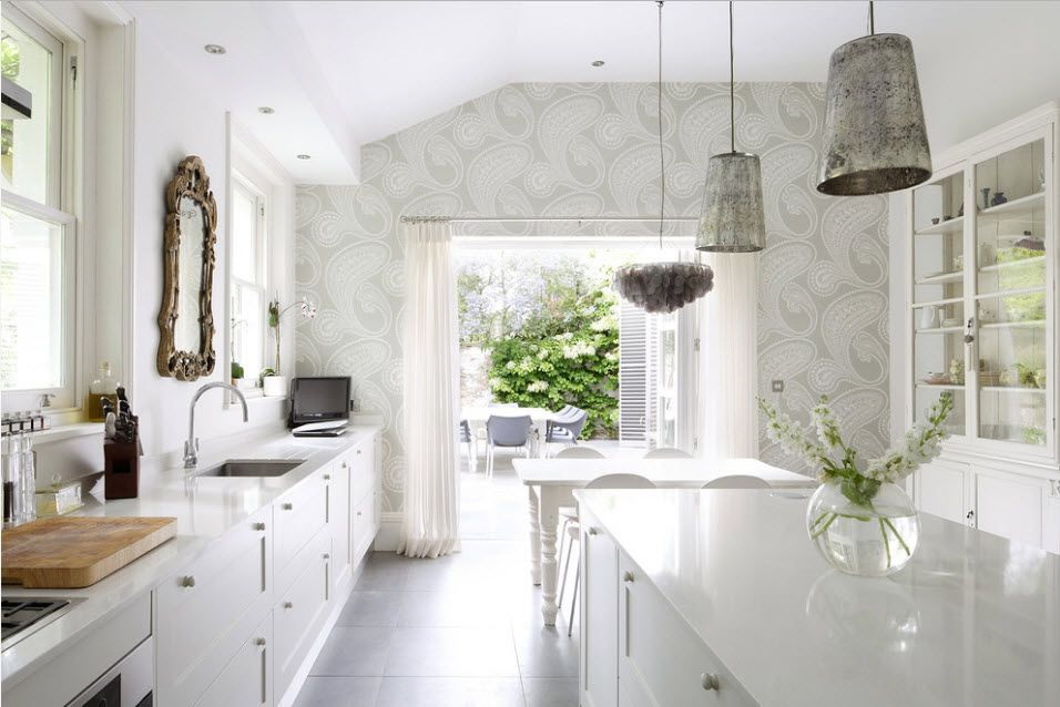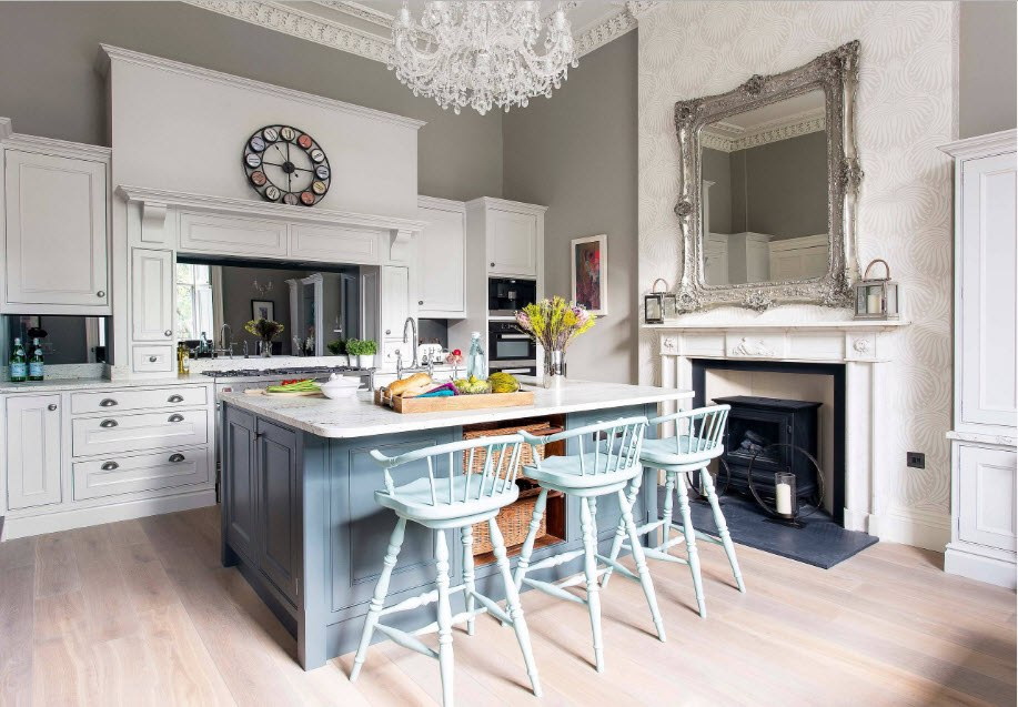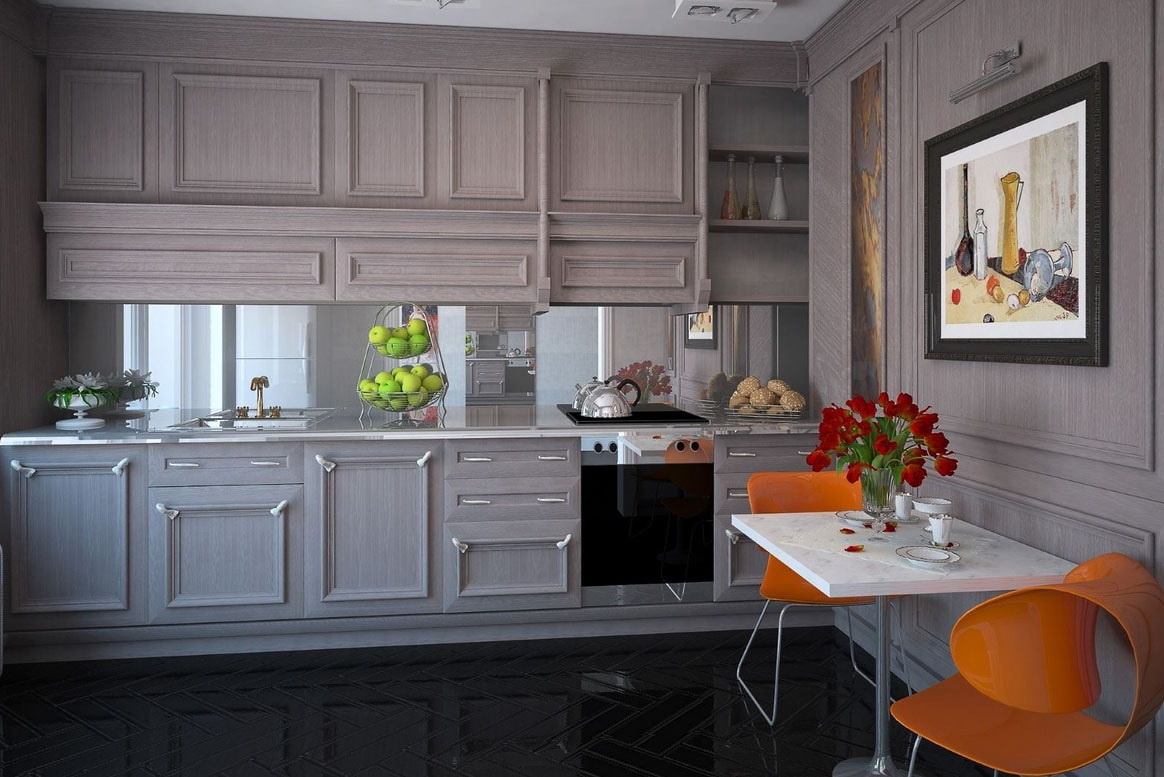 Modelos de parede com quadros maciços, refletindo pequenos detalhes internos, não aumentarão, mas reduzirão o espaço. A opção é adequada para grandes cozinhas e, em pequenas, pintamos sobre molduras para combinar com o conjunto de móveis, para que eles se “dissolvam” no ar.