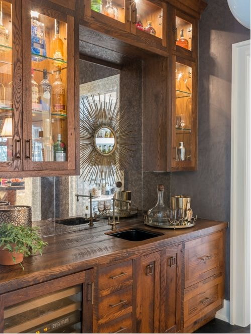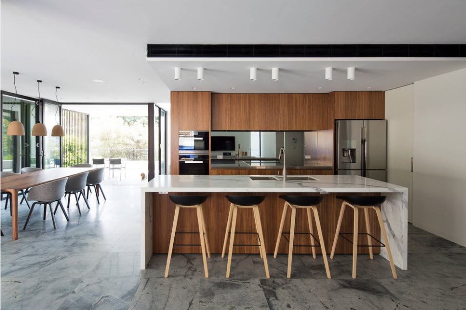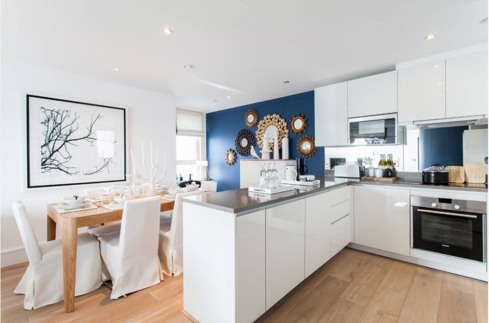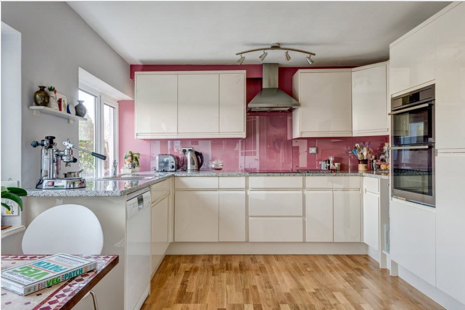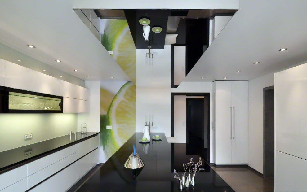 - Acabamento refletivo para móveis de cozinha. Ao entrar na cozinha, parece que não há absolutamente nenhum móvel, "se dissolve" no ar. A punição para a dona de casa é limpar a sala do espelho quando as impressões digitais estiverem novamente visíveis. Opção - ordem de alívio ou revestimento envelhecido para móveis;