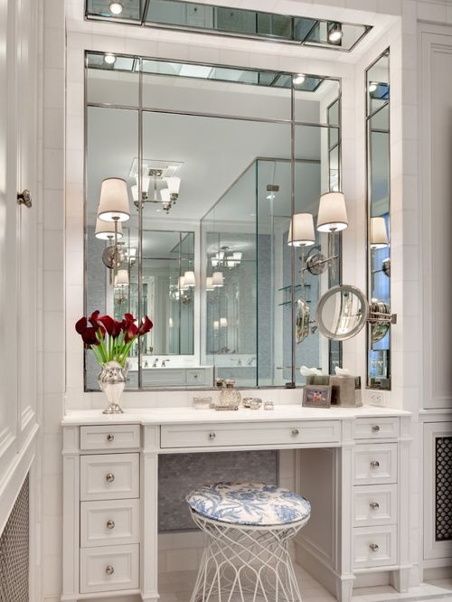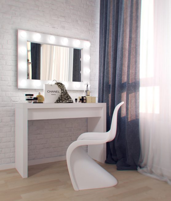 A penteadeira acomoda muitas prateleiras e gavetas. Espelhos escolher grande, a fim de aplicar convenientemente maquiagem. A superfície deve corresponder ao estilo da tabela, não se destacar da composição geral. Nós colocamos lâmpadas ou lâmpadas em ambos os lados, escolha iluminação suave. A luz dura atinge os olhos, faz você apertar os olhos.