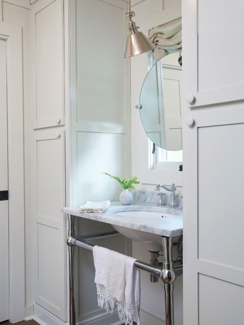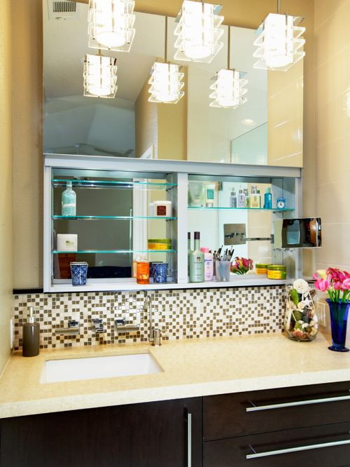 Em vez de uma prateleira com uma superfície refletora, escolha os armários. A área para armazenar cremes e escovas de dente está aumentando, e colocamos plantas de interior nas prateleiras livres.
