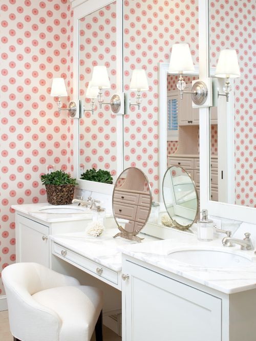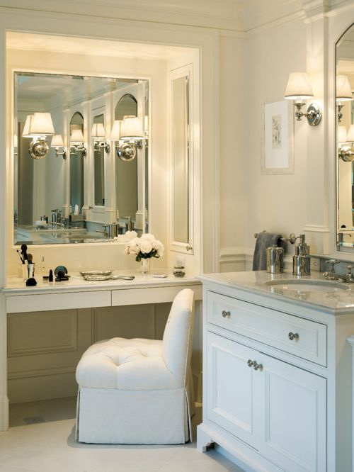 No pequeno quarto, substituímos a mesinha de cabeceira por uma penteadeira, penduramos um espelho na parede, colocamos um otomano. Nos quartos grandes colocamos uma penteadeira perto da janela, em vez de uma luminária de mesa, fazemos uma luz de fundo com uma lâmpada de assoalho ou uma lâmpada de ferro forjado.