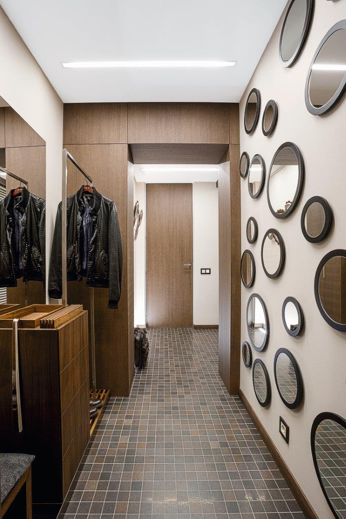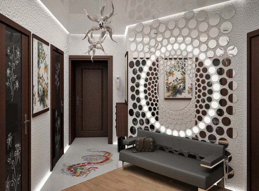Vários pequenos espelhos estão pendurados nas paredes de longos corredores. Equipamos acessórios com iluminação, instalamos várias lâmpadas de parede. Para expandir o espaço necessário armárioCoupé, equipado com portas com uma superfície reflexiva.