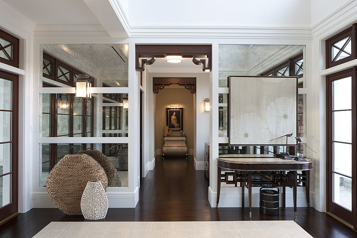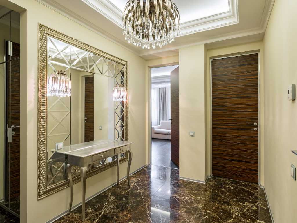 No corredor instale um espelho, mesmo que não haja espaço para uma cômoda ou otomano. O objeto de decoração não só realiza uma função prática, mas também se torna uma decoração da sala.