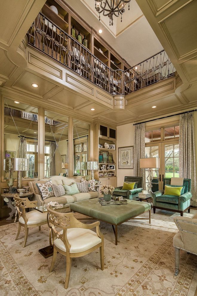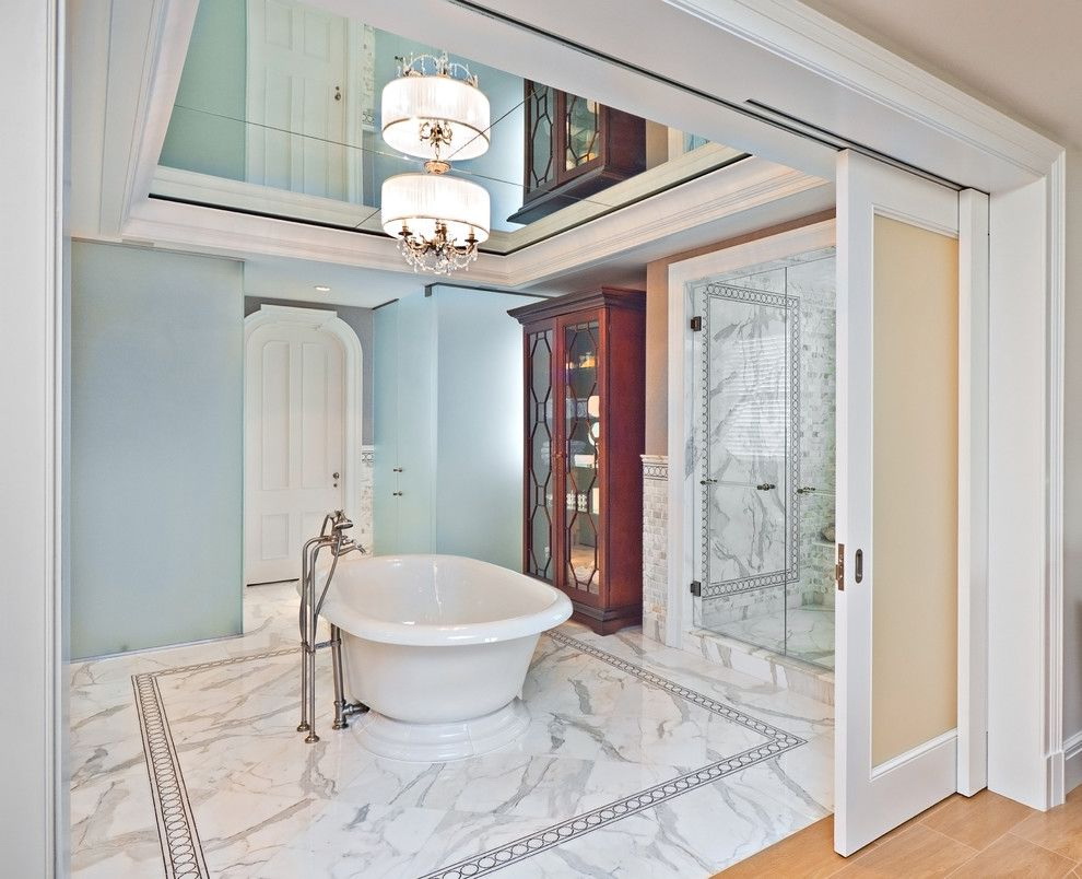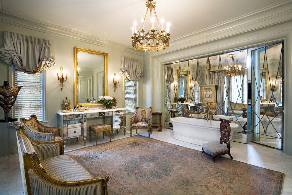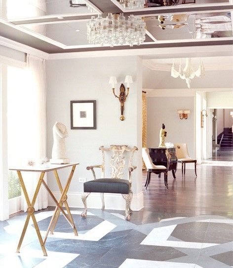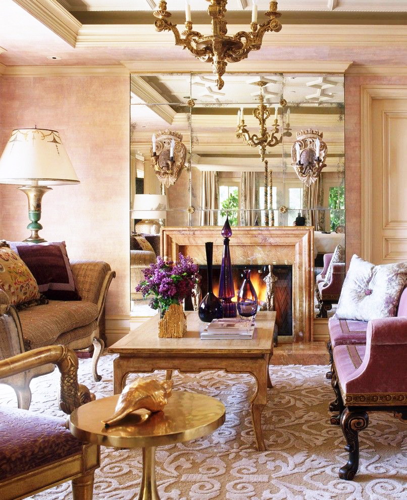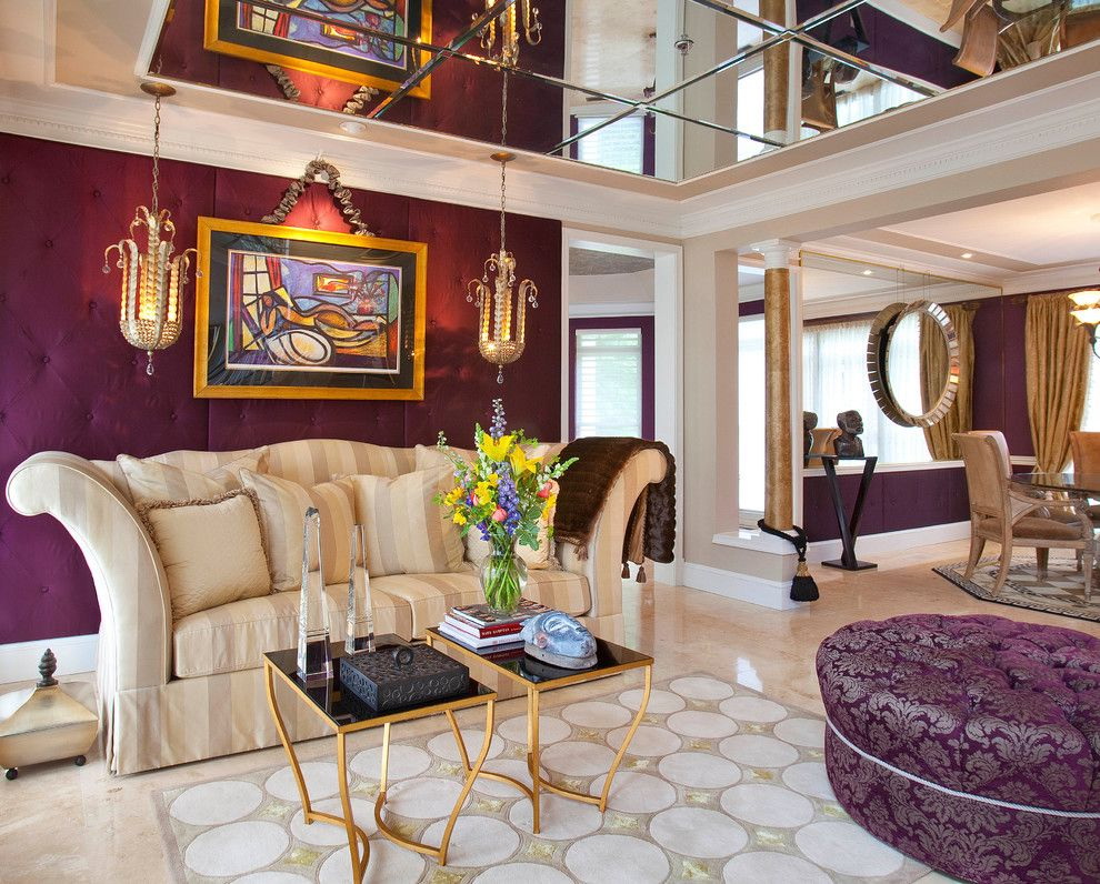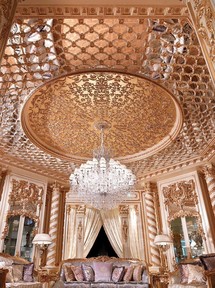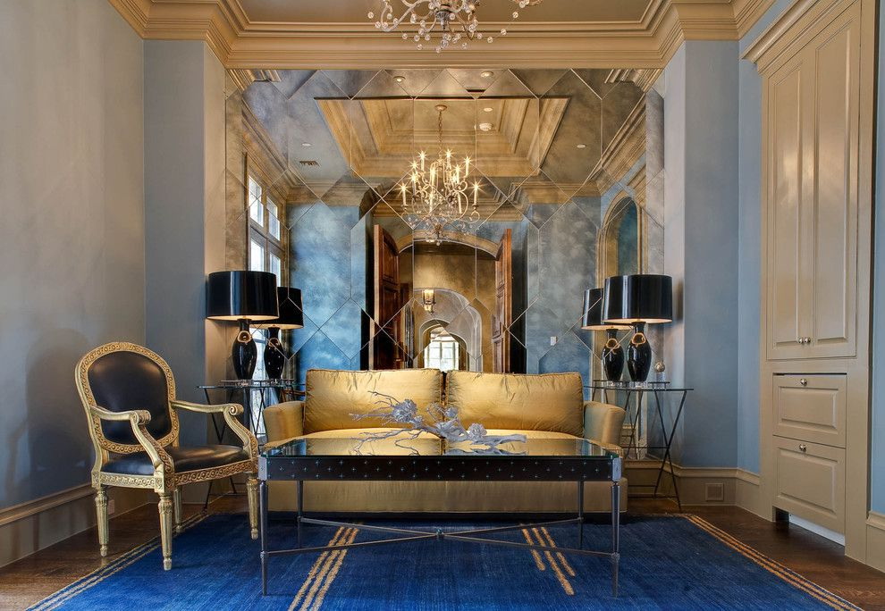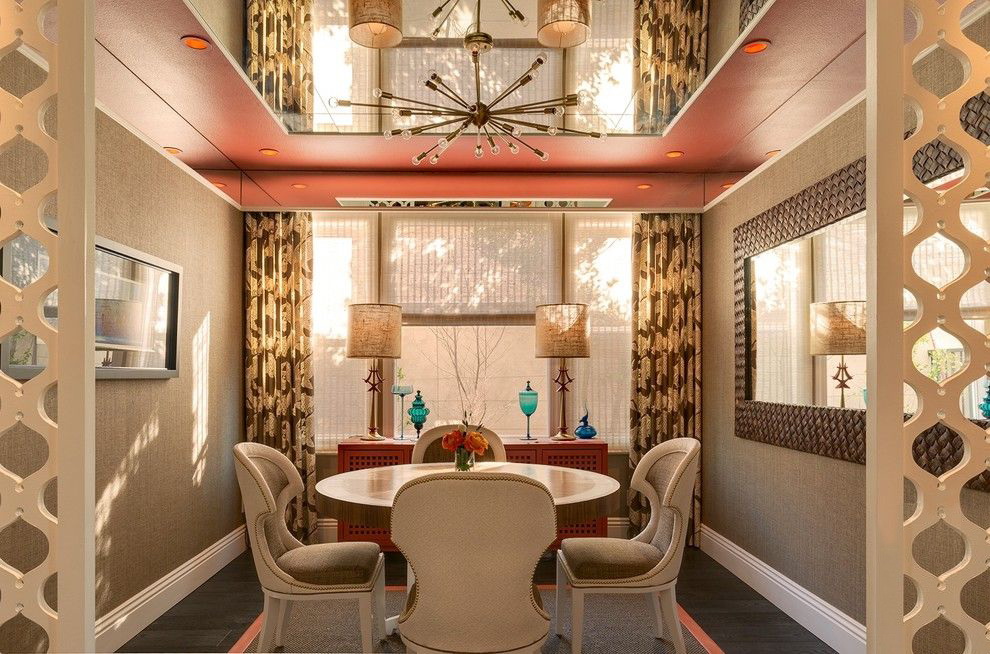 Cada vez mais utilizado no projeto de tetos. Colocamos um espelho comum ou fazemos um mosaico de peças, aumentando e “elevando” os tetos baixos. Nós espalhamos qualquer padrão com peças, até mesmo um novato aprenderá a trabalhar com eles. Você pode fazer uma cornija espelhada, passando-a pelo perímetro da sala. Recepção de luxo parece nos quartos de estilo clássico.