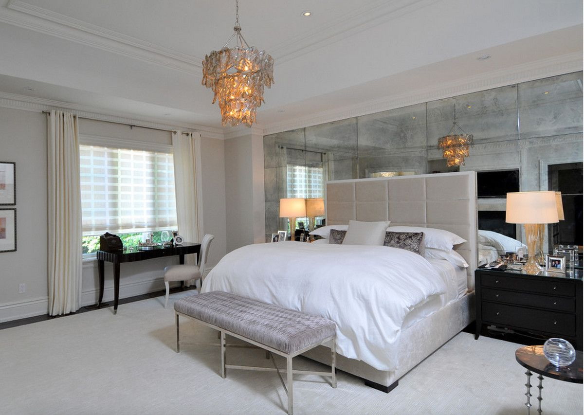 Na tendência de uso de móveis com uma superfície de espelho. Mesas de cabeceira, cômodas, cabides e prateleiras ajudarão a esconder roupas e cosméticos, ao mesmo tempo em que se encaixam no estilo geral.