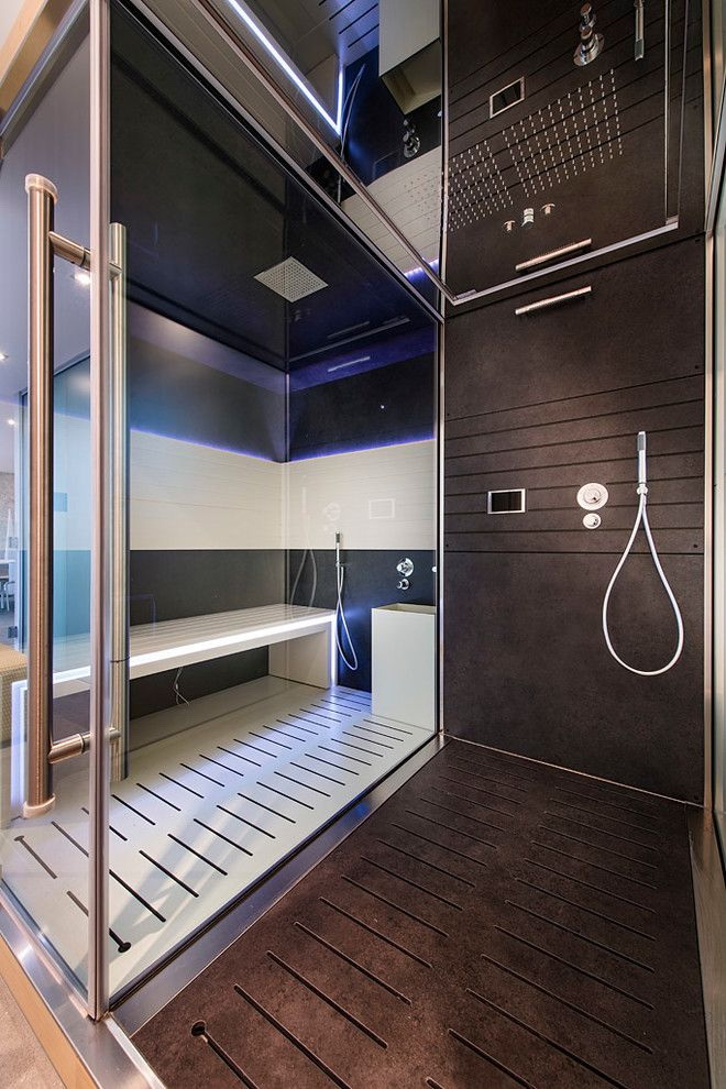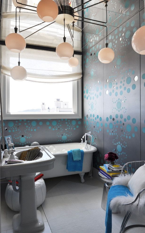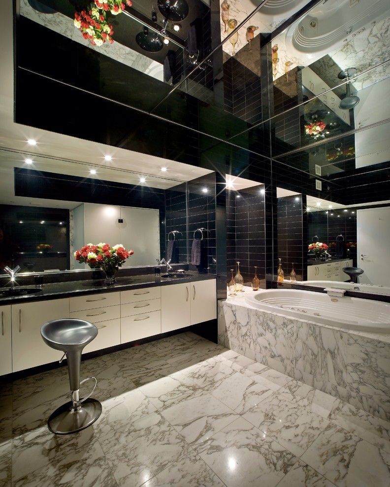 Aumentar o espaço da superfície refletora sob o banho. Para durar mais, usamos material à prova de choque. Nós penduramos nas paredes espelhos multifacetados que não têm limites claros.