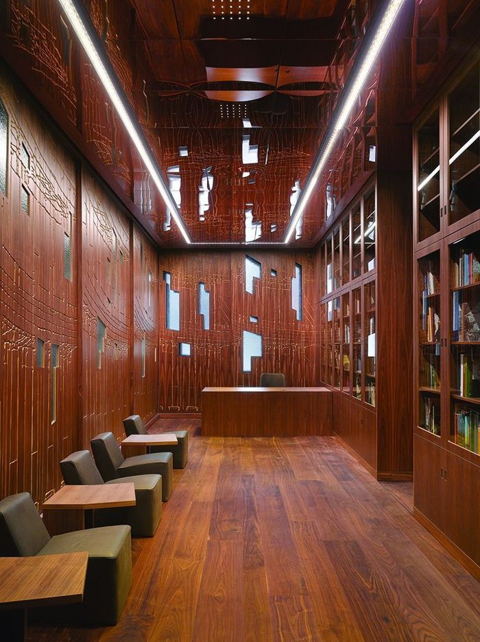 Espelho fazemos as fachadas de mesas de cabeceira, cabeceira, pernas ou apoios de cama. As colunas de rolamentos são mascaradas com uma superfície refletiva para “dissolvê-las” no espaço. Acessórios decoram os elementos esculpidos, pintam os padrões.