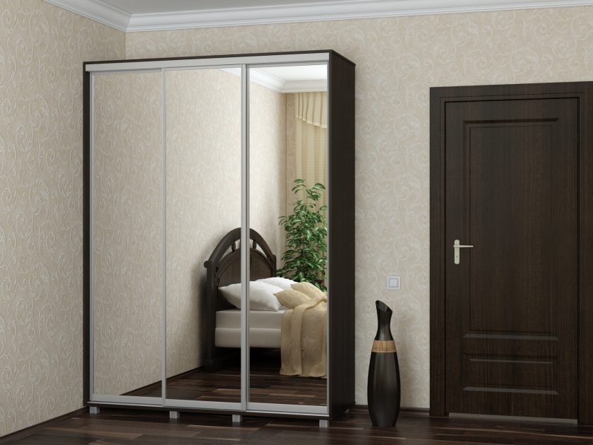 - Superfície totalmente espelhada de portas sem material de enquadramento é adequado para pequenos quartos. O quarto é duplicado na aparência. Instalamos o design em um nicho de qualquer sala, parece vantajoso na frente de janelas ou perto de vasos com plantas.