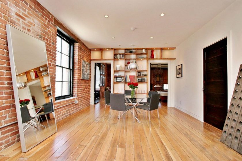 Se houver uma faixa estreita de tijolos ao longo da parede, duplicamos na parede oposta com um espelho. A alvenaria no estilo Loft mudará se for decorada com um acessório em um quadro envelhecido artificialmente.