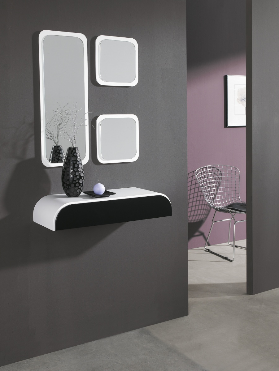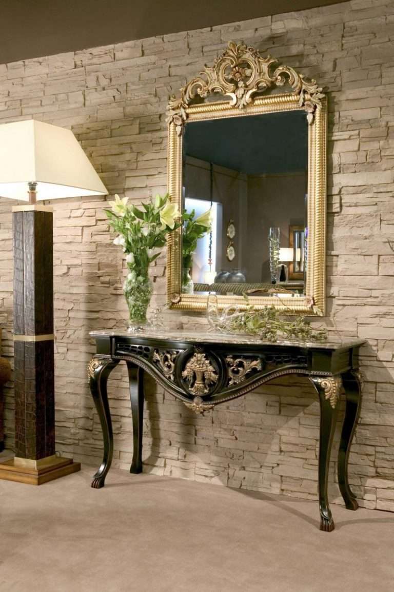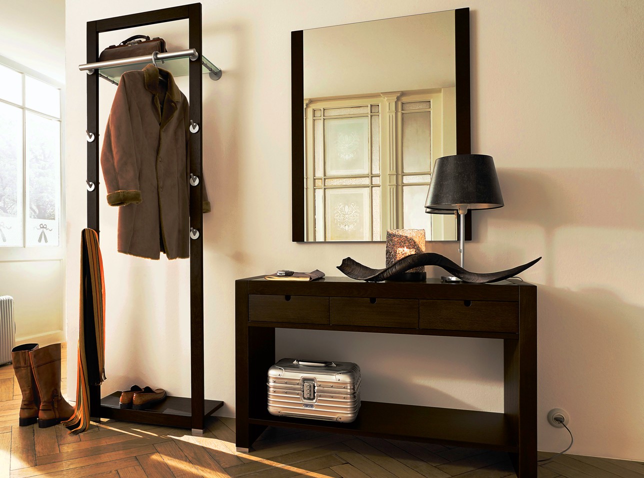 Na parede você pode pendurar não apenas fotos e decorações diversas, mas também prateleiras, muralcartazes Também na parede, você pode ter móveis de parede. Uma das opções é uma mesa de parede ou console. Deve ser combinado com um espelho no corredor. Esse mobiliário é geralmente feito de madeira: