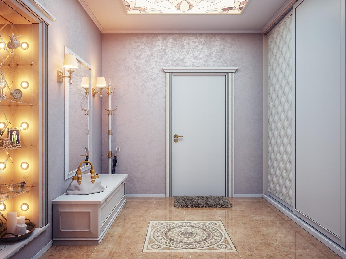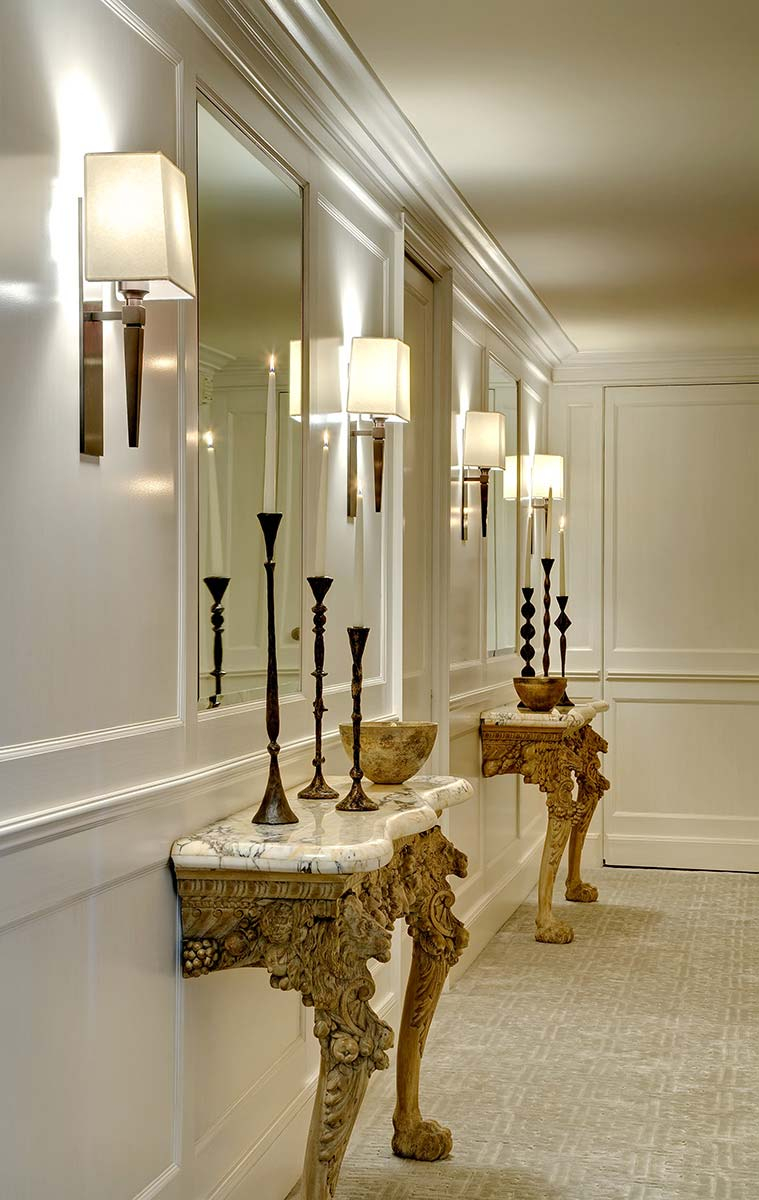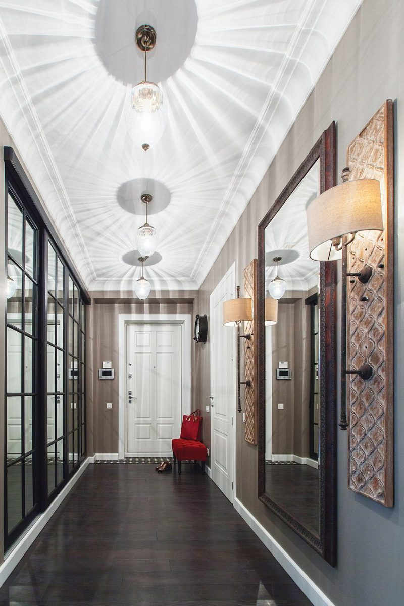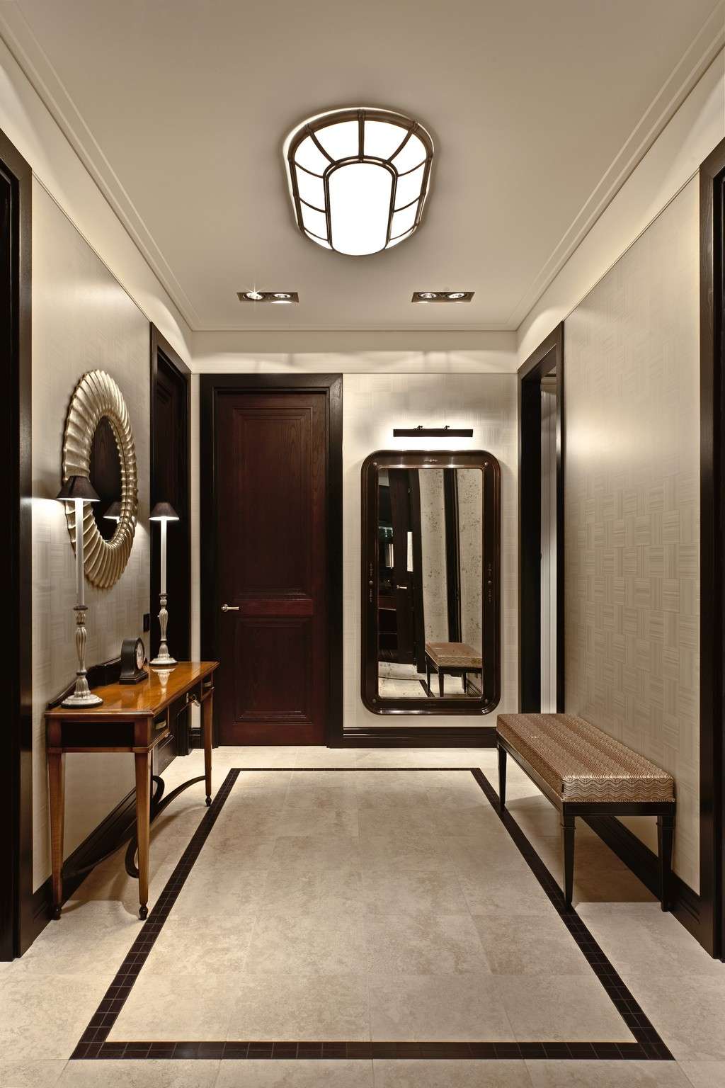 Para um grande corredor, um estilo clássico com decorações é apropriado (se apropriado). Não tenha medo de transbordar do quarto, caso contrário, pode parecer vazio.
