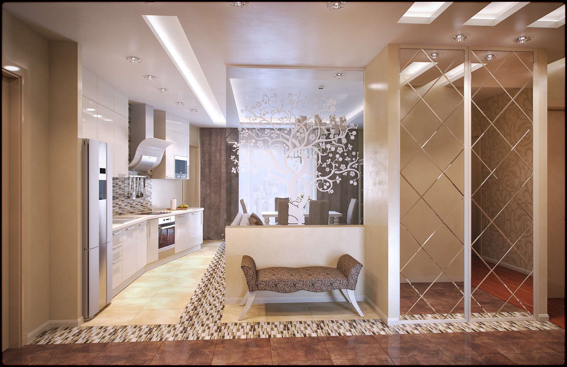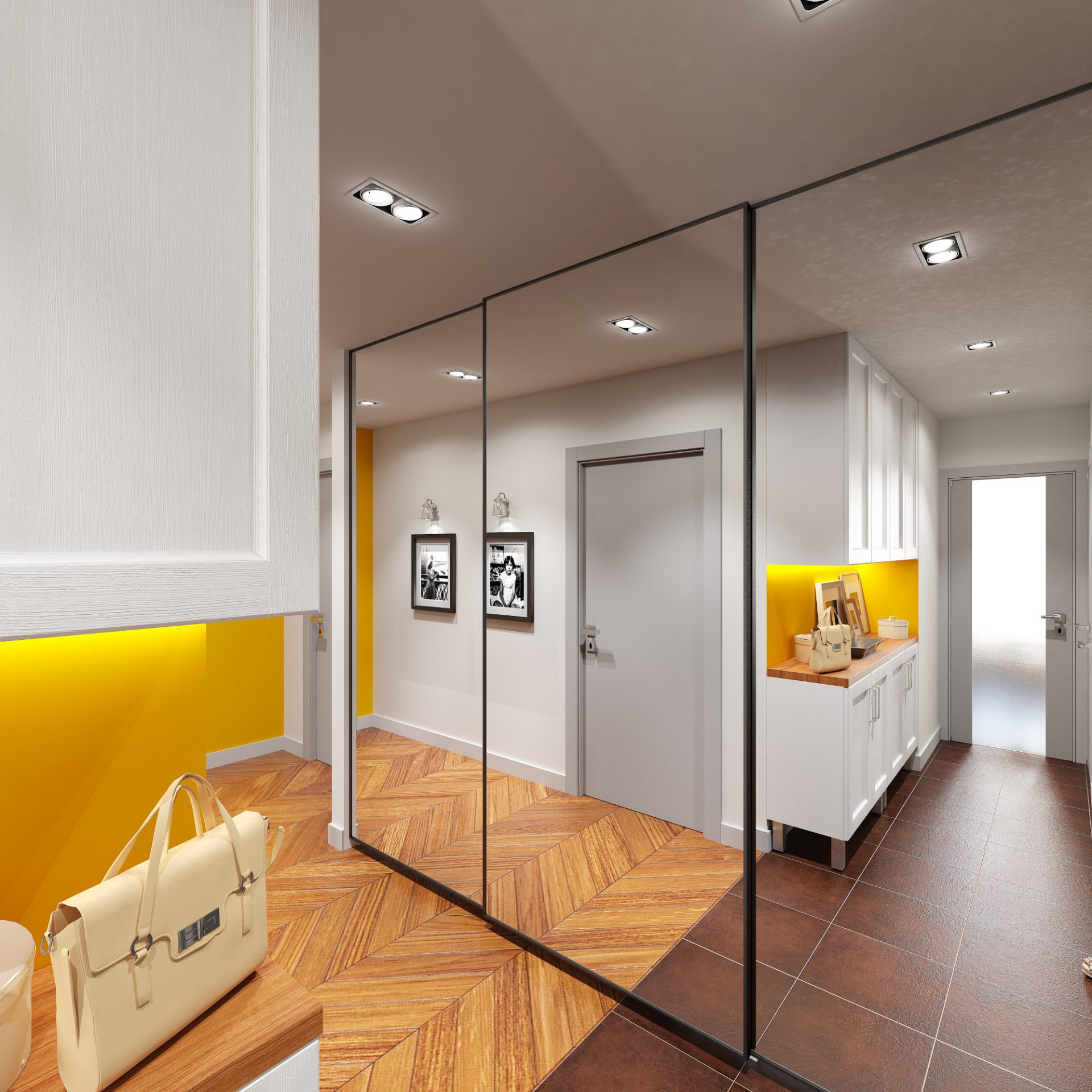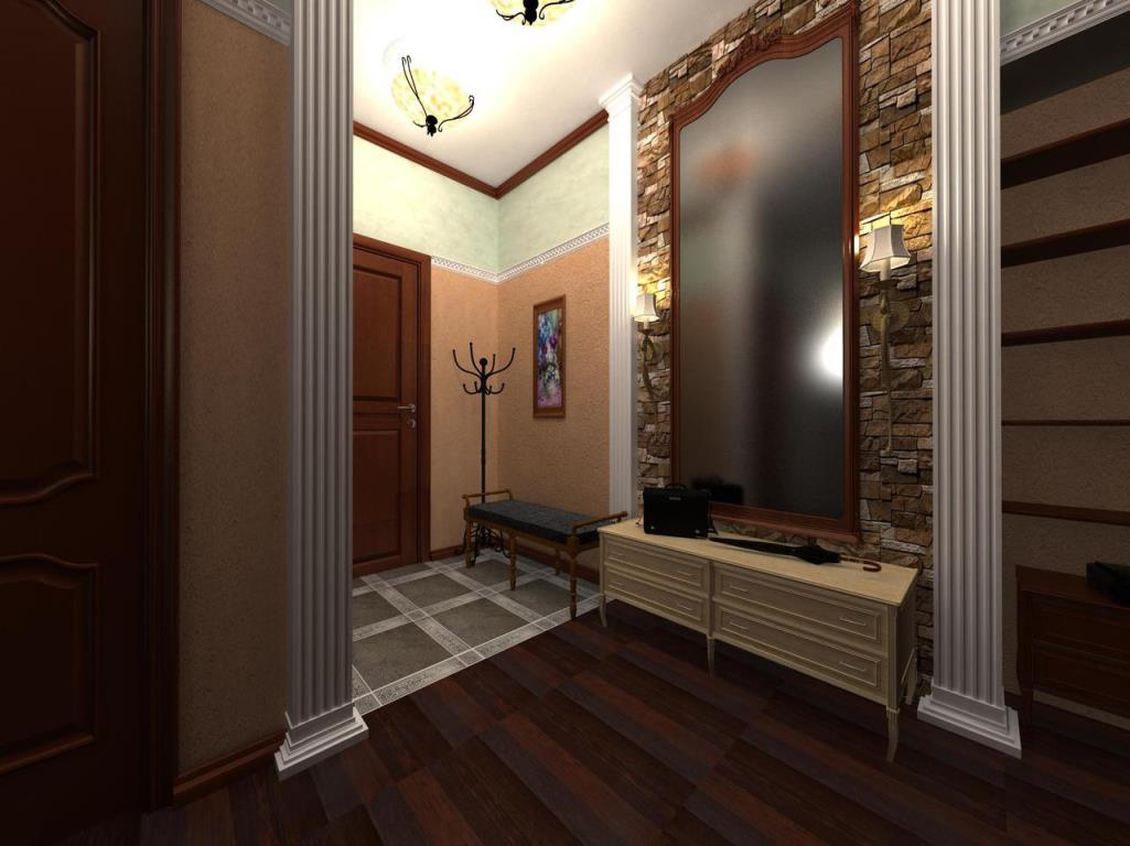 Em pequenos corredores (na maioria das vezes nos de Khrushchev), surge a necessidade de expandi-los. O espelho ajudará a expandir visualmente o espaço e você precisará pendurá-lo em uma parede larga. As construções de piso volumétrico não serão adequadas para esses corredores, em vez delas é melhor abrir espaço para: