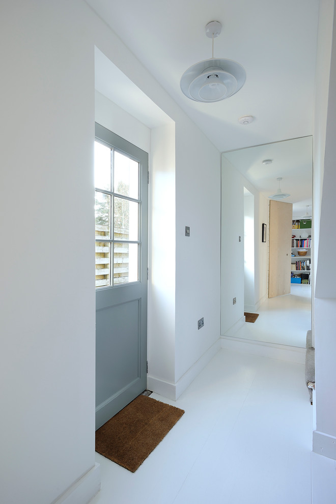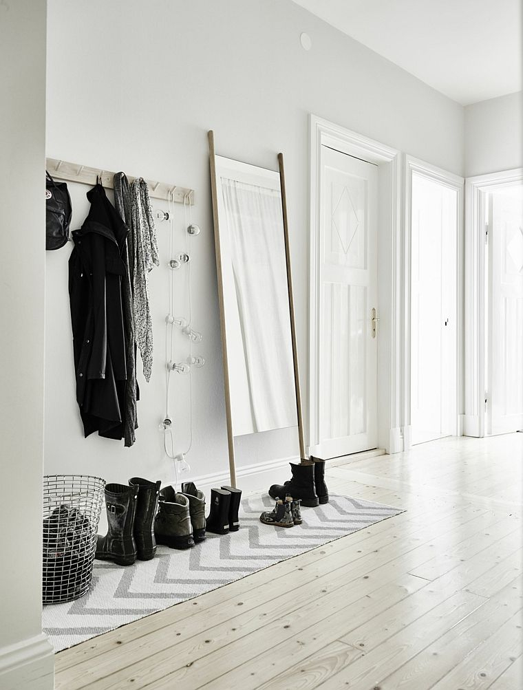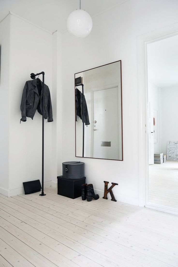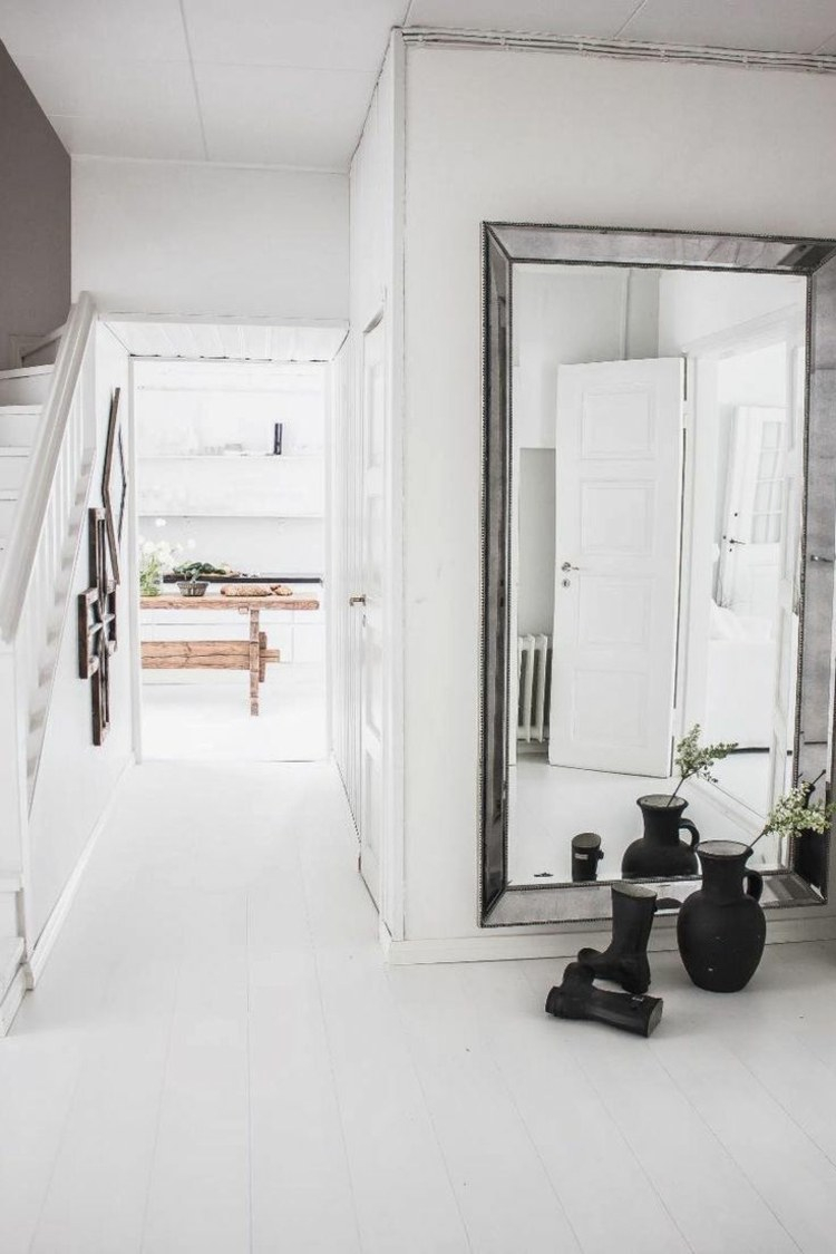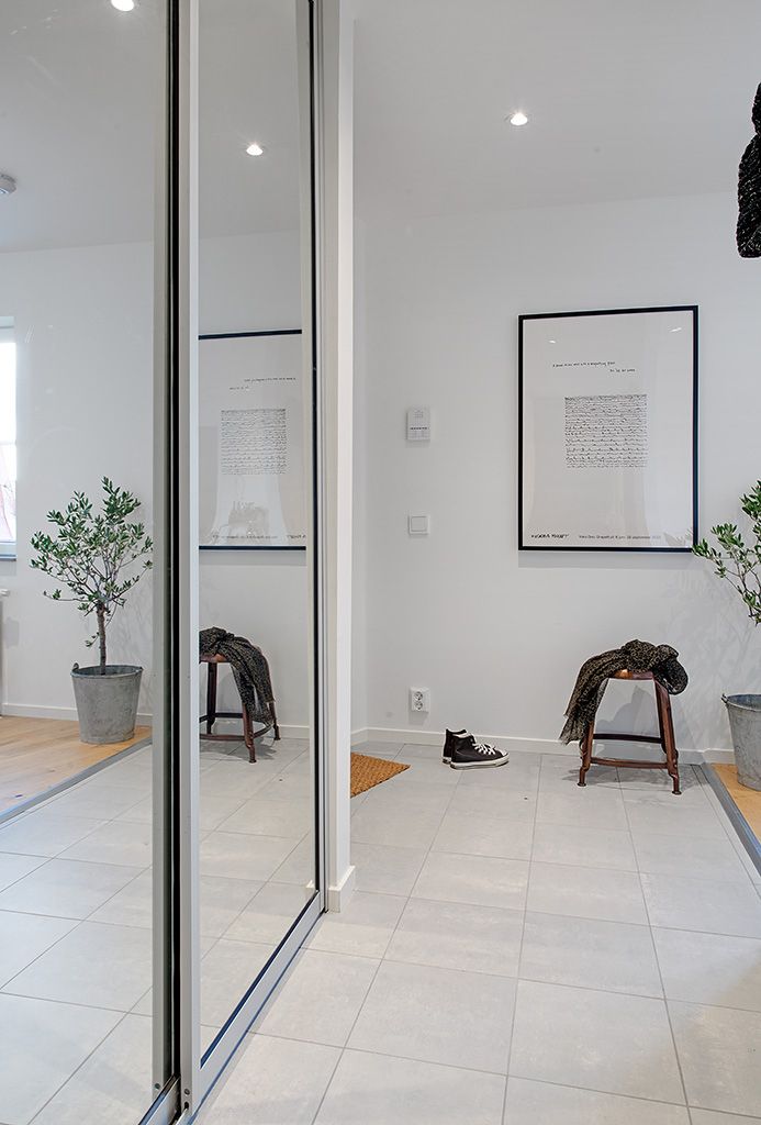 Para teto baixo, você precisa comprar um espelho vertical. Normalmente eles são colocados na parede, mas há uma solução mais criativa - para colocar na porta da frente. Para conseguir uma expansão dupla, eles são colocados nos cantos do corredor.