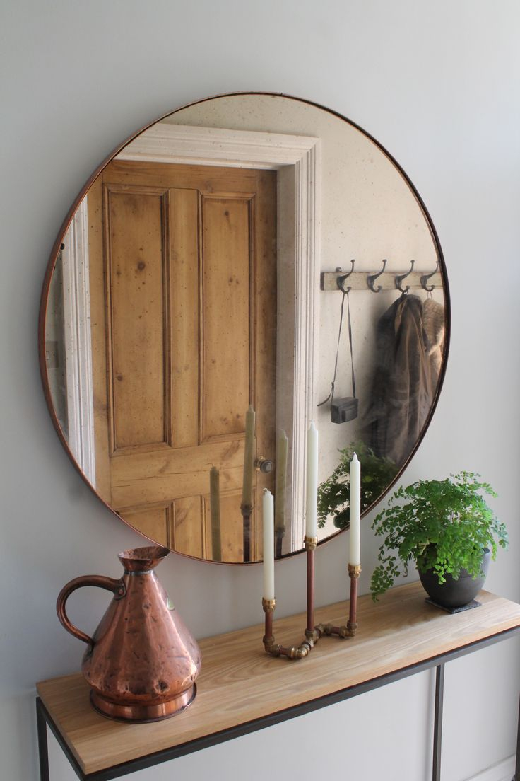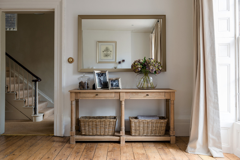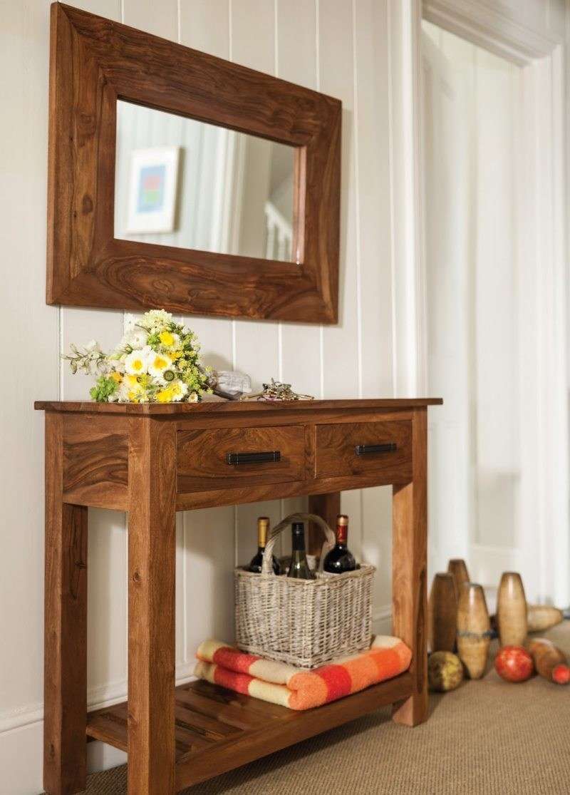 Esta mesa de madeira é ótima para pequenos corredores. A escolha de consoles de parede agora é enorme.